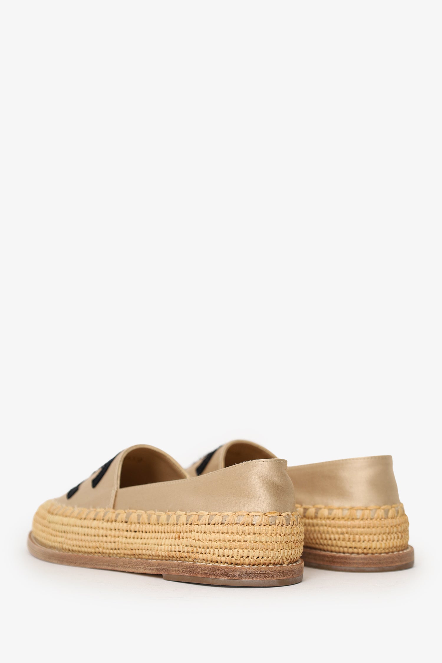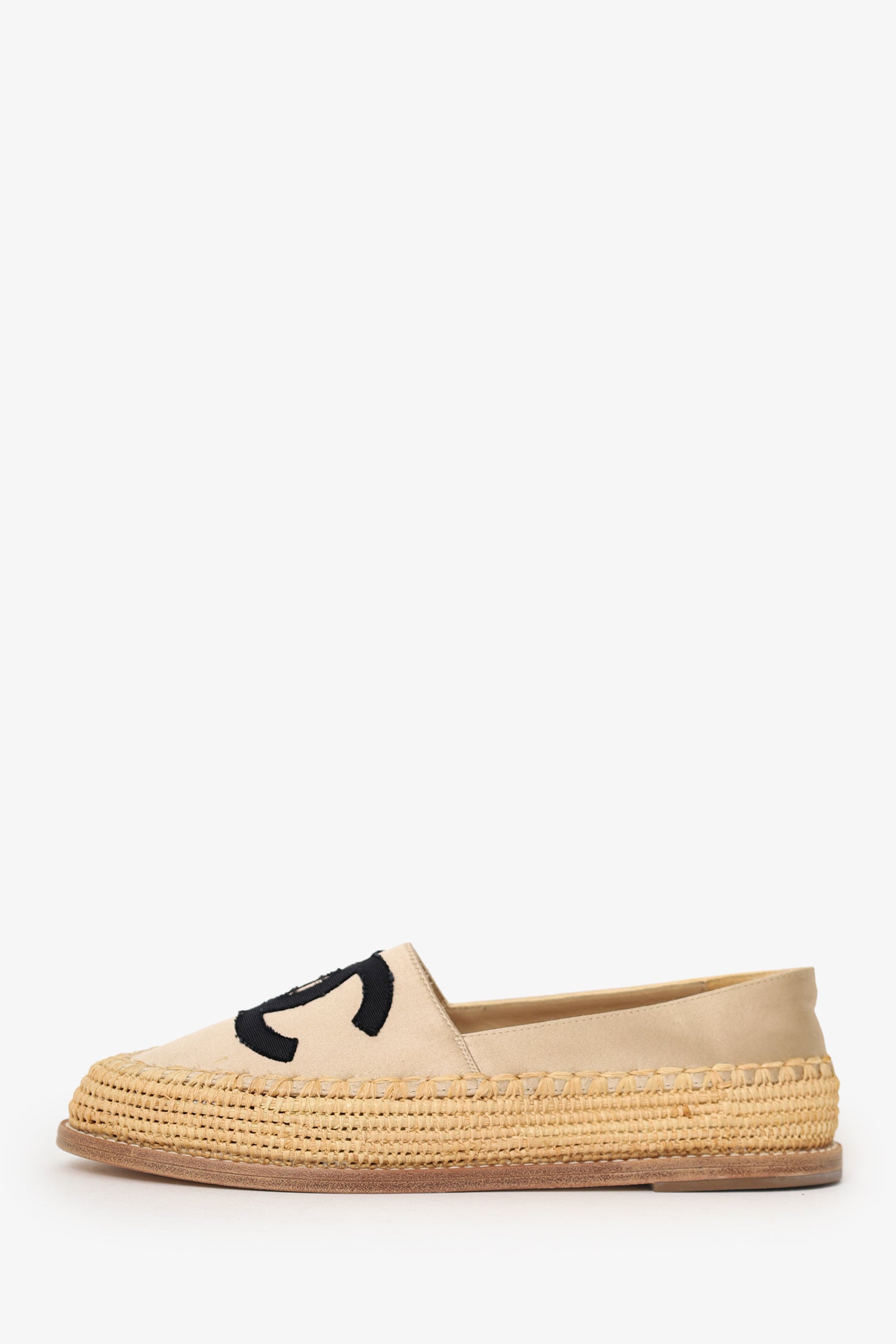 Refresh availabilityPre-Loved Chanel™ Beige/Black Satin/Woven Raffia CC Espadrille Flats. Slip-on. Round toe. Contrast and tonal stitching.