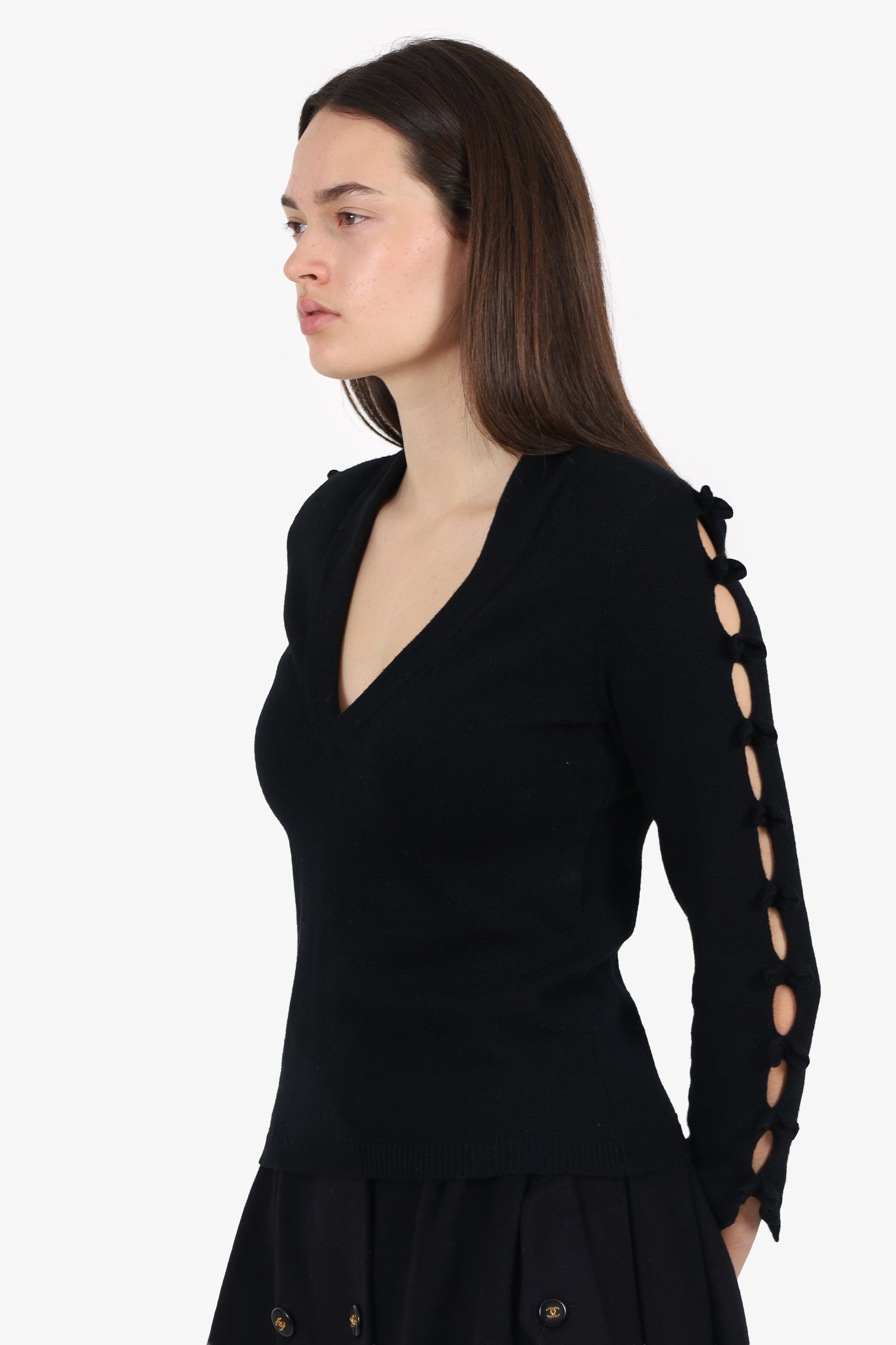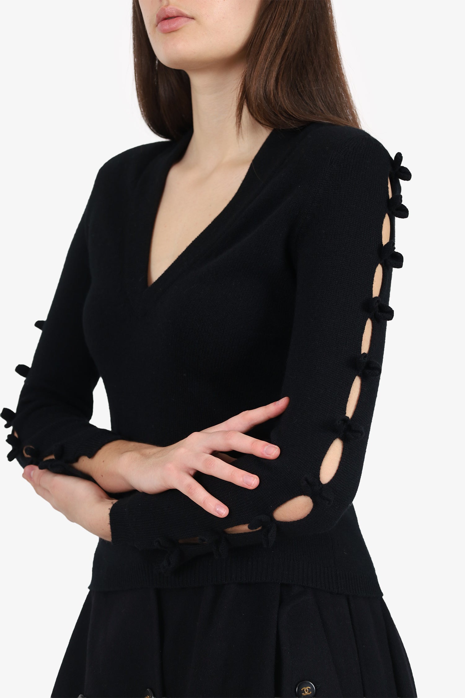 Refresh availabilityPre-Loved Chanel™ Black Cashmere Bow Sleeve Sweater. Pull-on. Boat neckline. Gunmetal-tone hardware. Tonal stitching.
