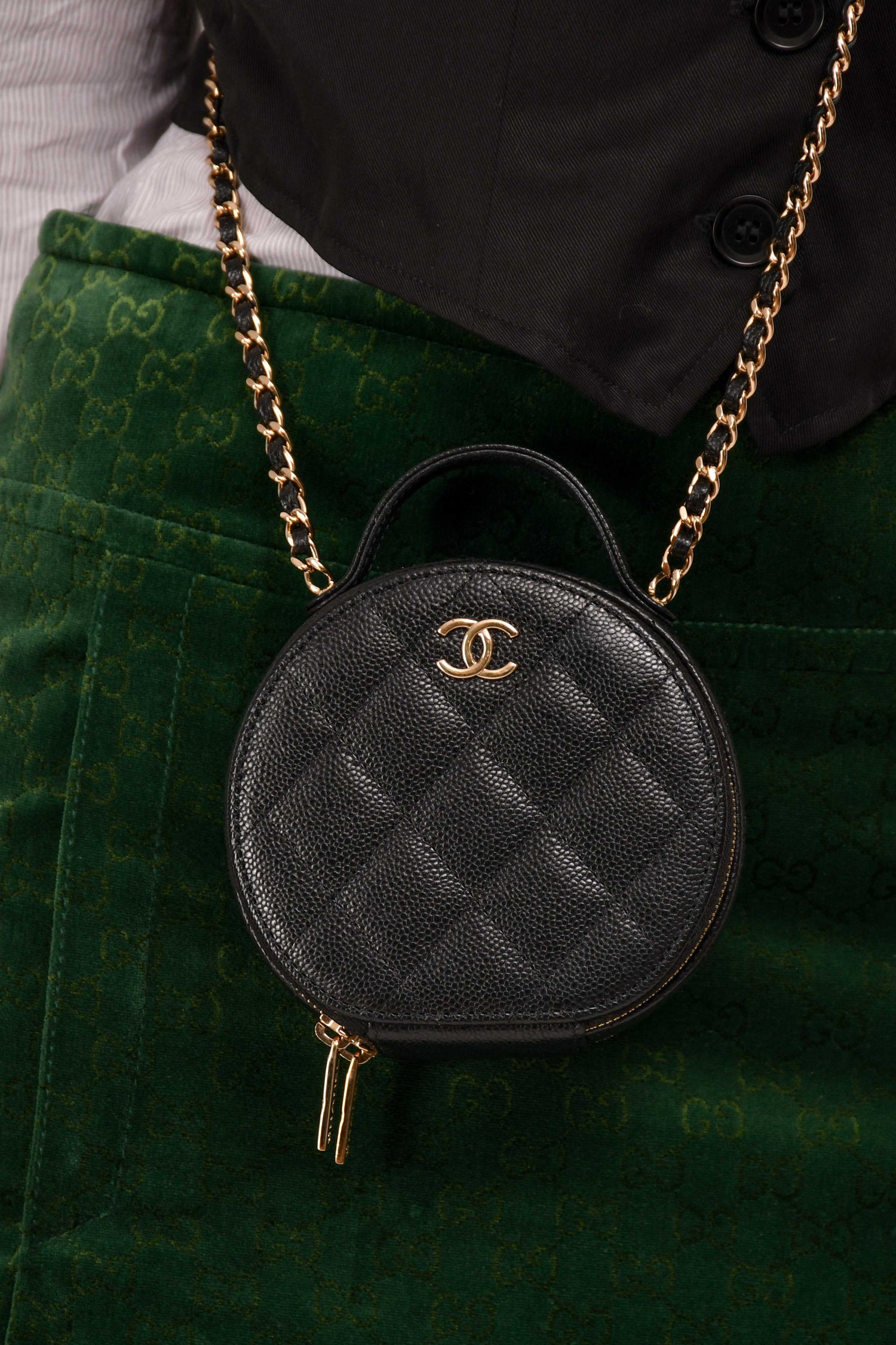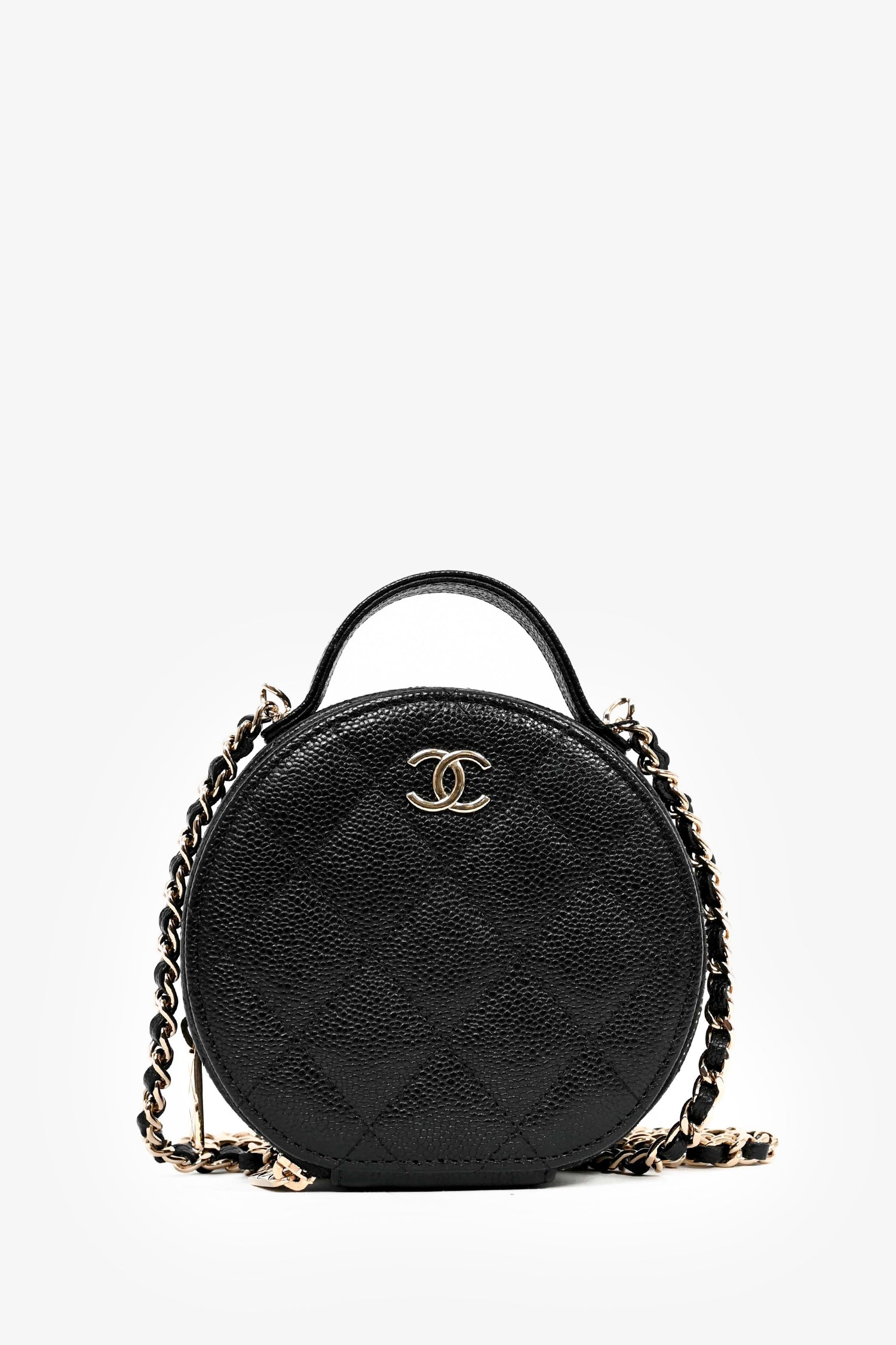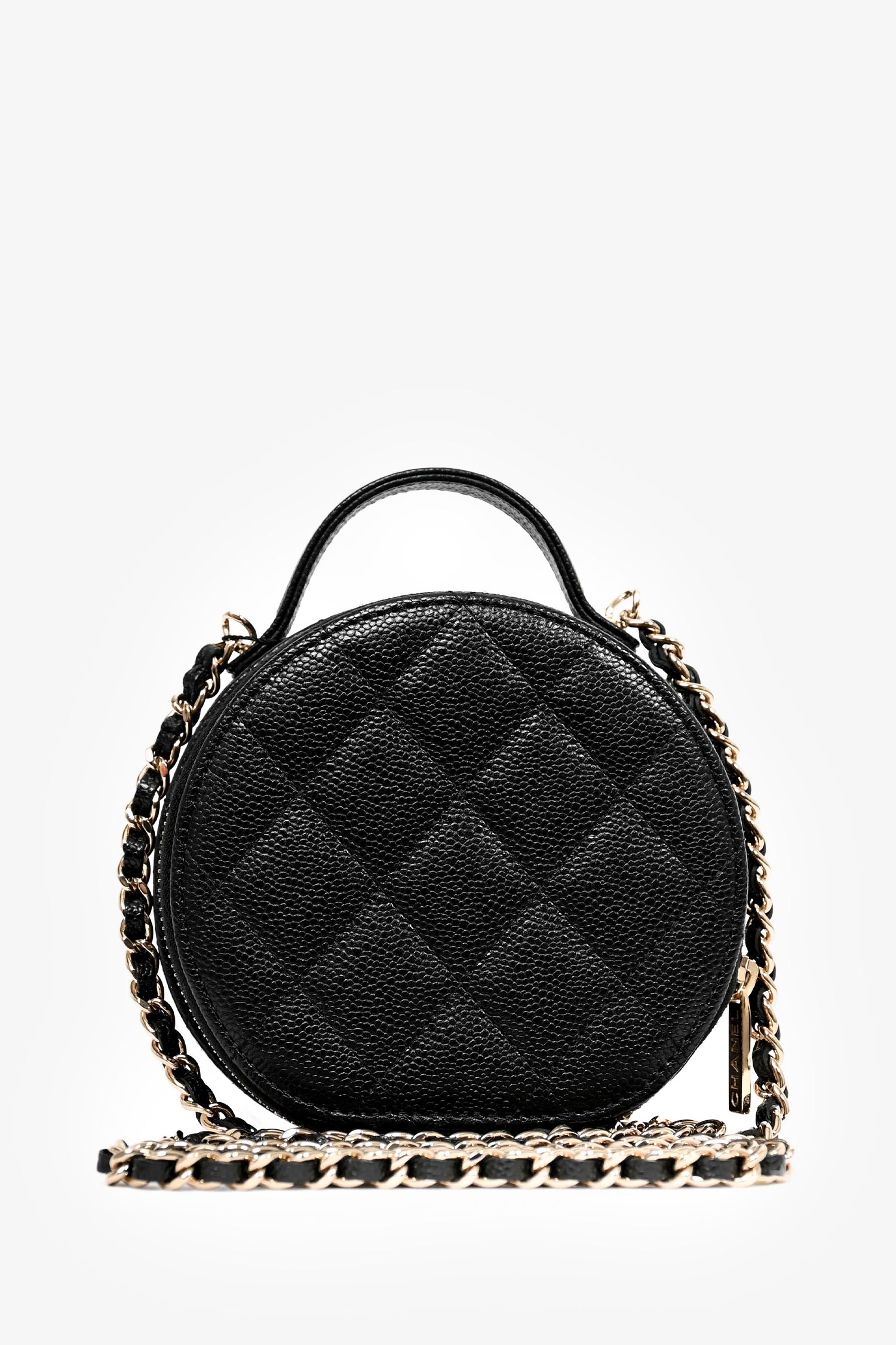 Refresh availabilityPre-Loved Chanel™ Black Caviar Leather Round Mini 'Handle with Care' Vanity. Quilted topstitching. Gold-tone hardware. Double zip-arounds. 2 interior card holders and a single mirror. Lined interior. Chain-link crossbody strap. Tonal stitching.