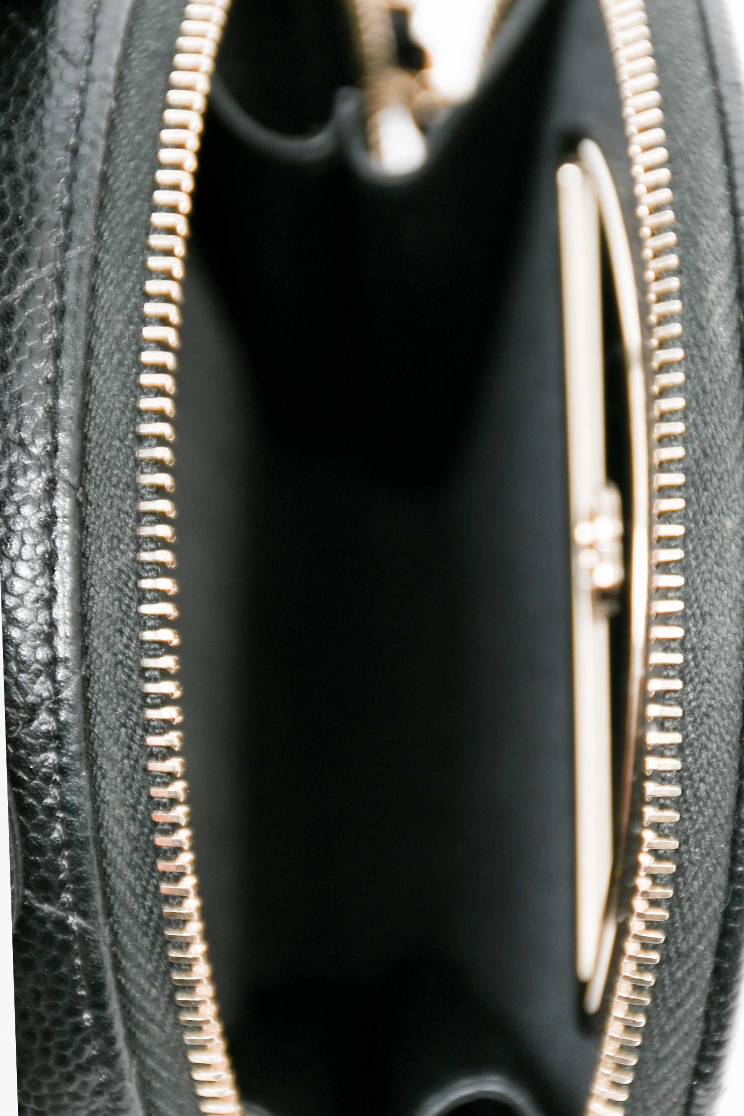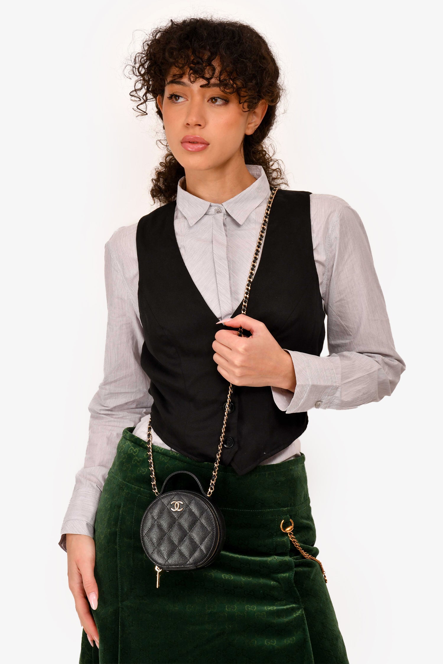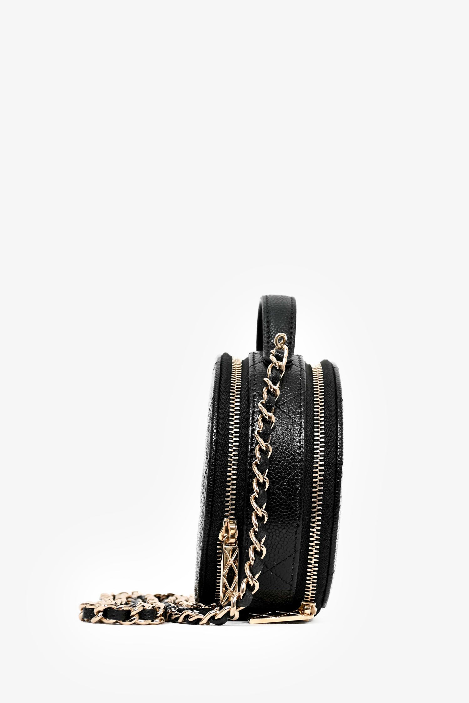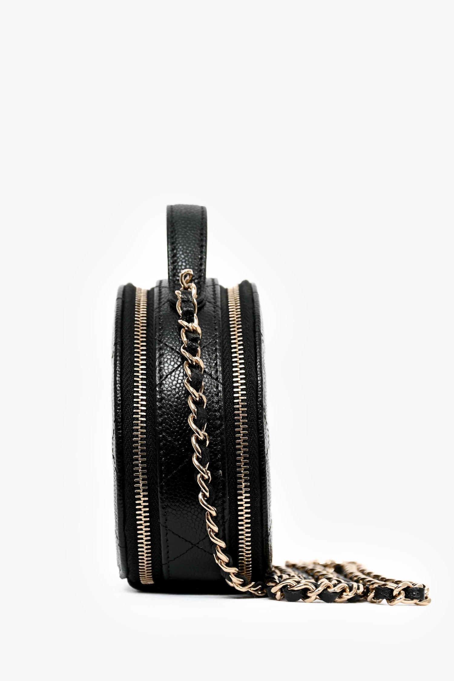 Refresh availabilityPre-Loved Chanel™ Black Caviar Leather Round Mini 'Handle with Care' Vanity. Quilted topstitching. Gold-tone hardware. Double zip-arounds. 2 interior card holders and a single mirror. Lined interior. Chain-link crossbody strap. Tonal stitching.