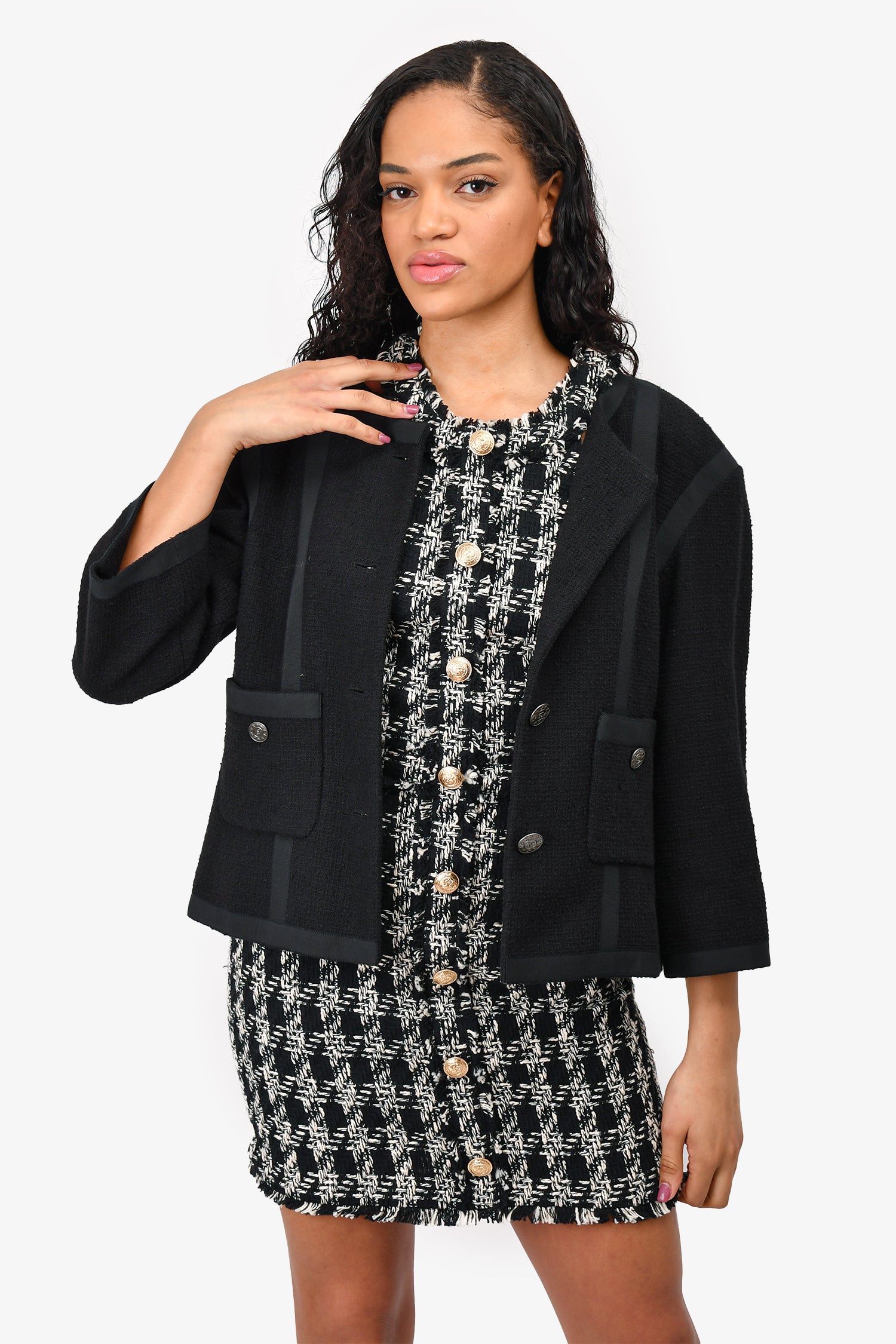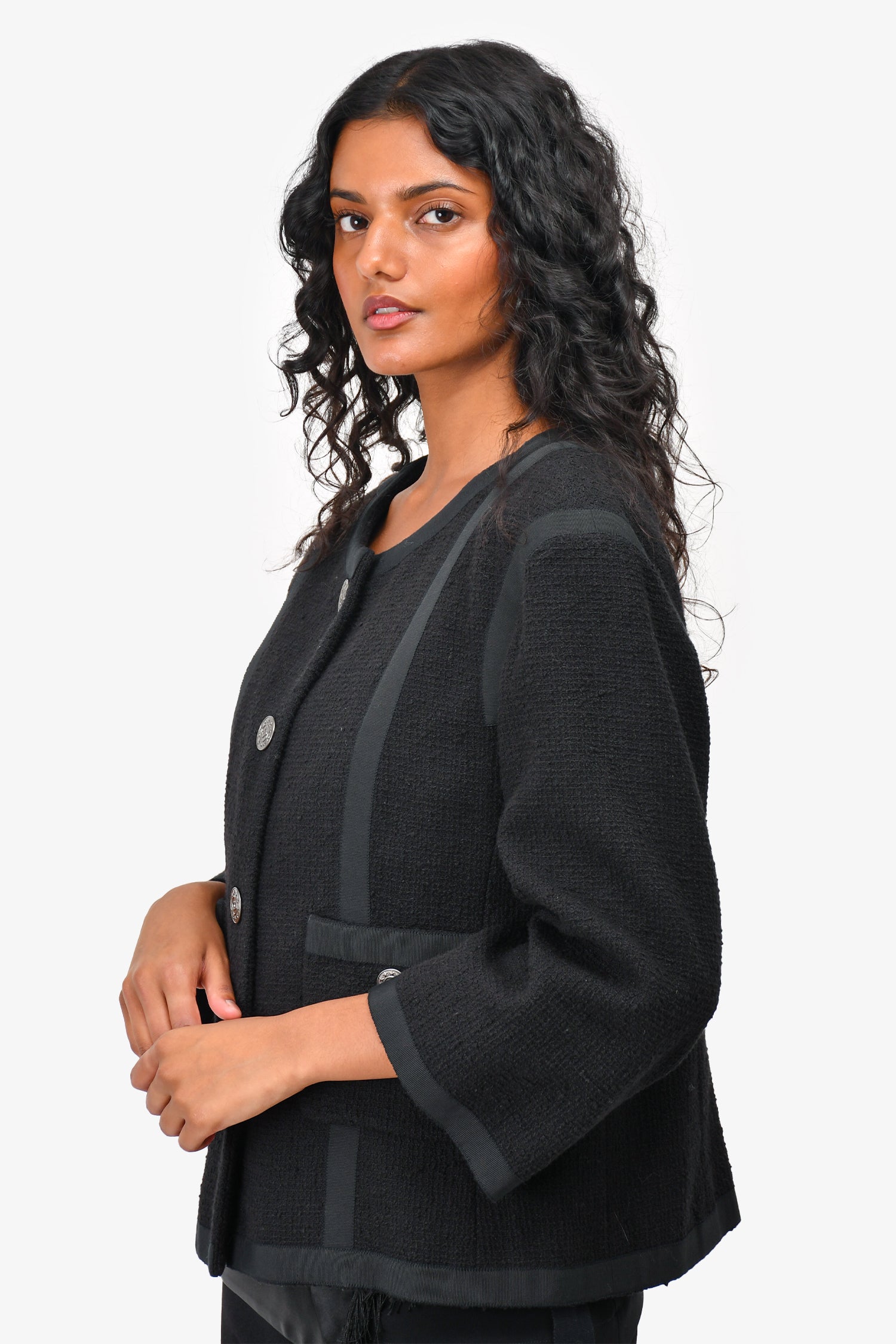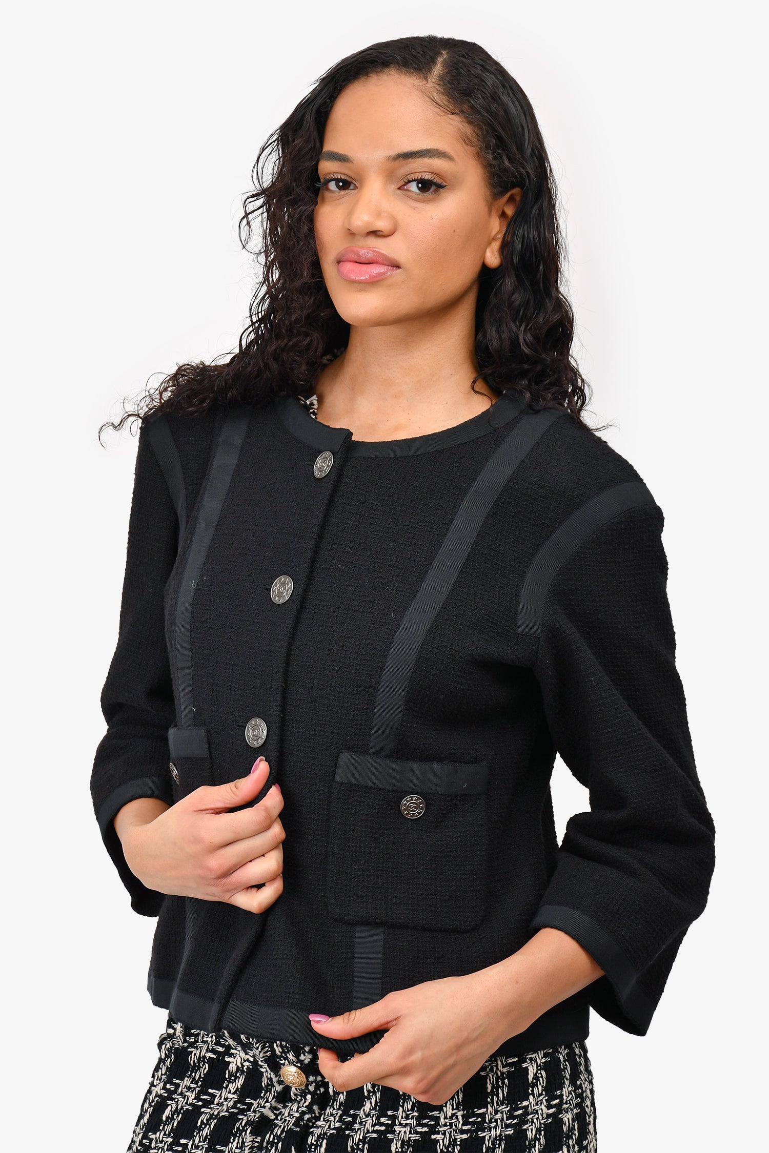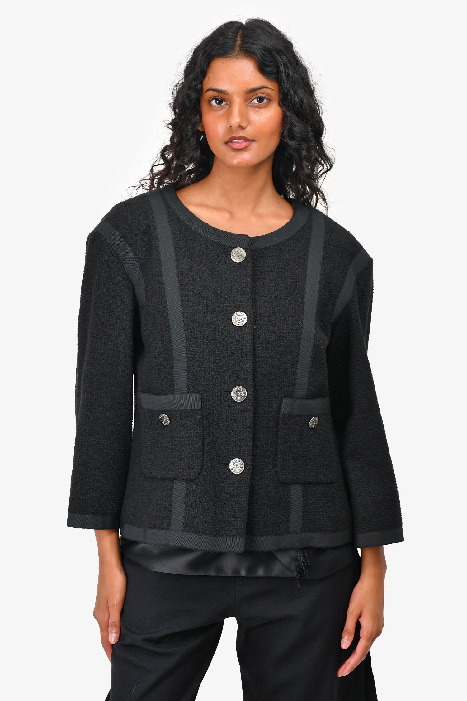 Refresh availabilityPre-Loved Chanel™ Black Cotton Gunmetal Buttoned 'Timeless' Jacket. Front button-up closure. Front pockets with button closure. Padded shoulders. Lined.