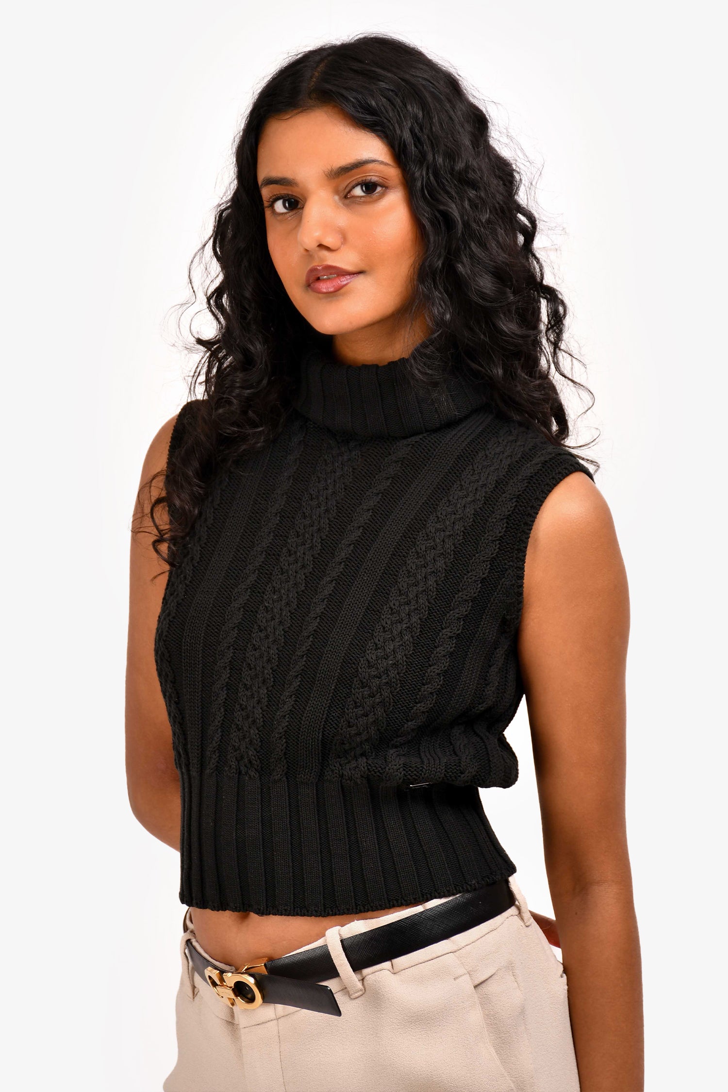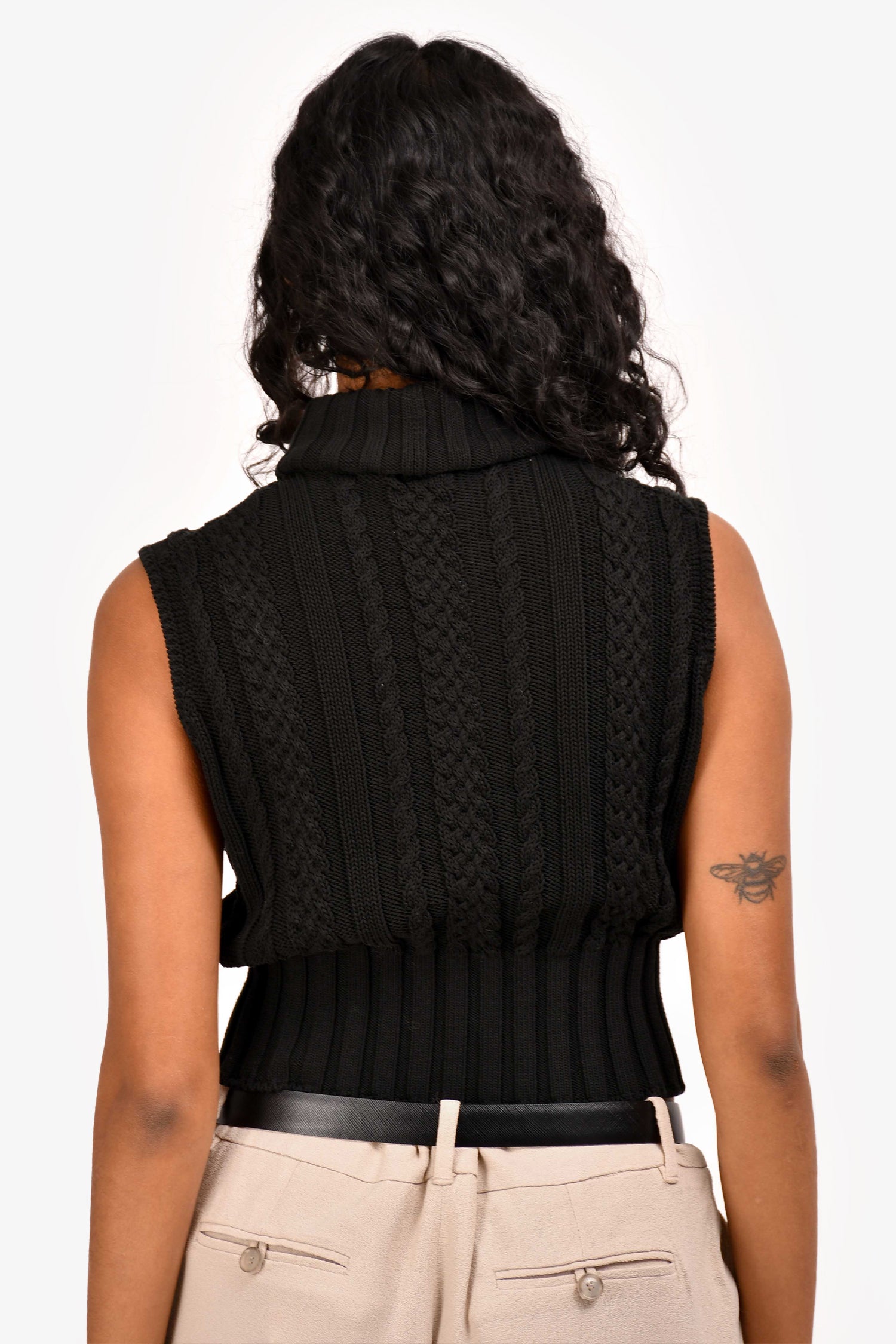 Pre-Loved Chanel™ Black Cotton Knit Vest. Pull-over. Mock-neck. Sleeveless. Ribbed neckline and hem. Silver-toned hardware. Tonal stitching.