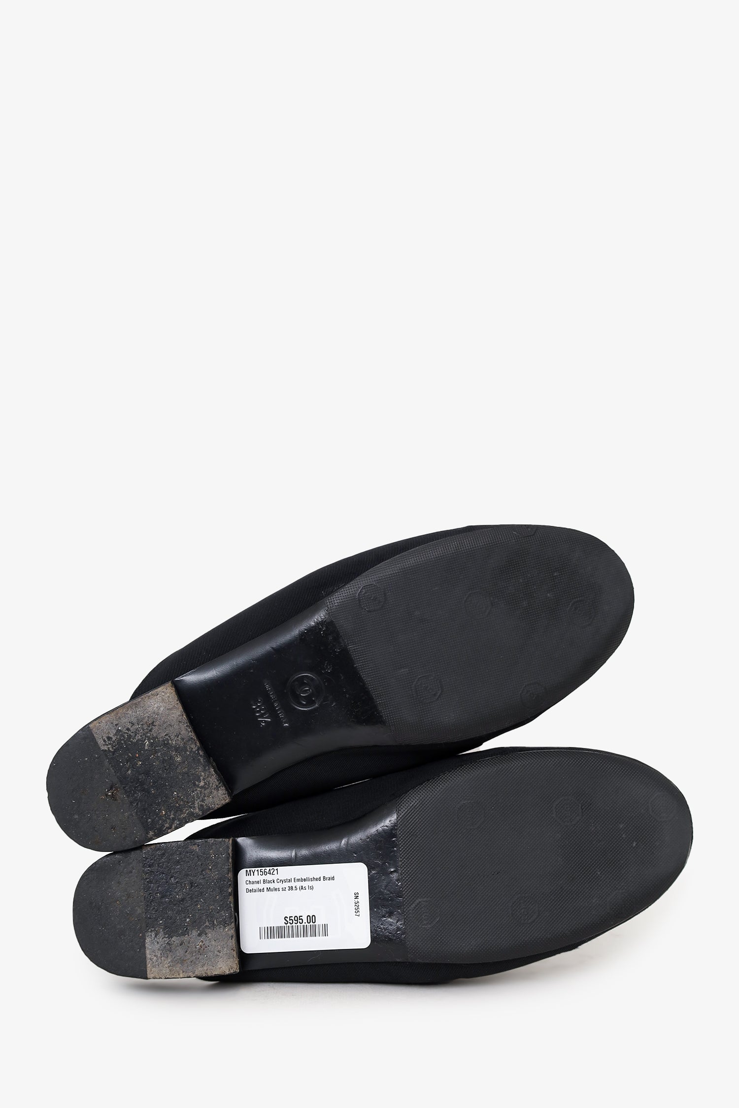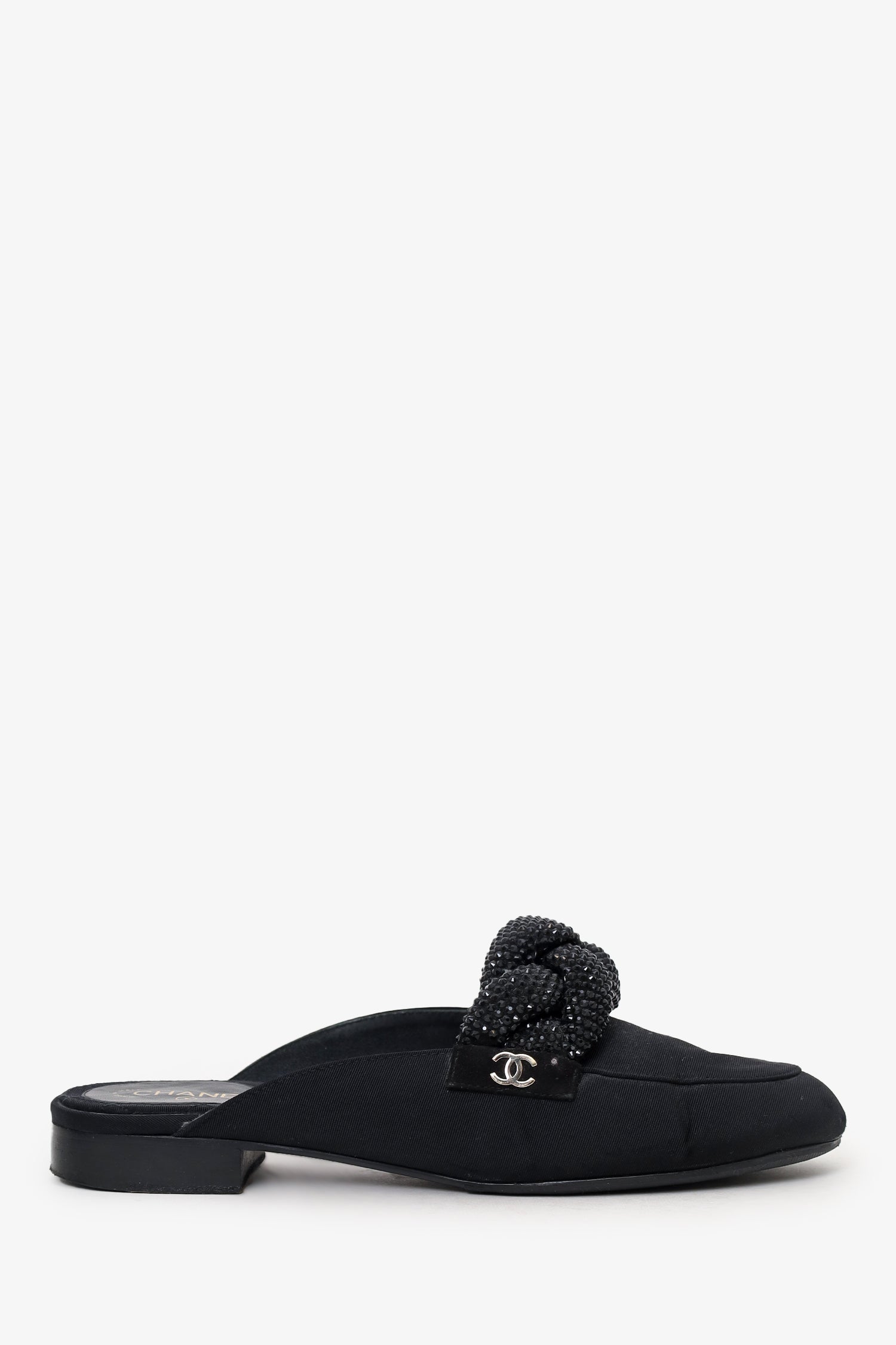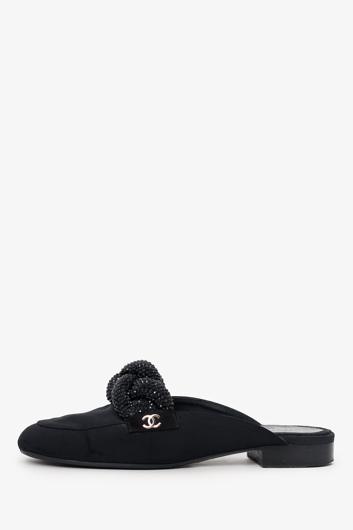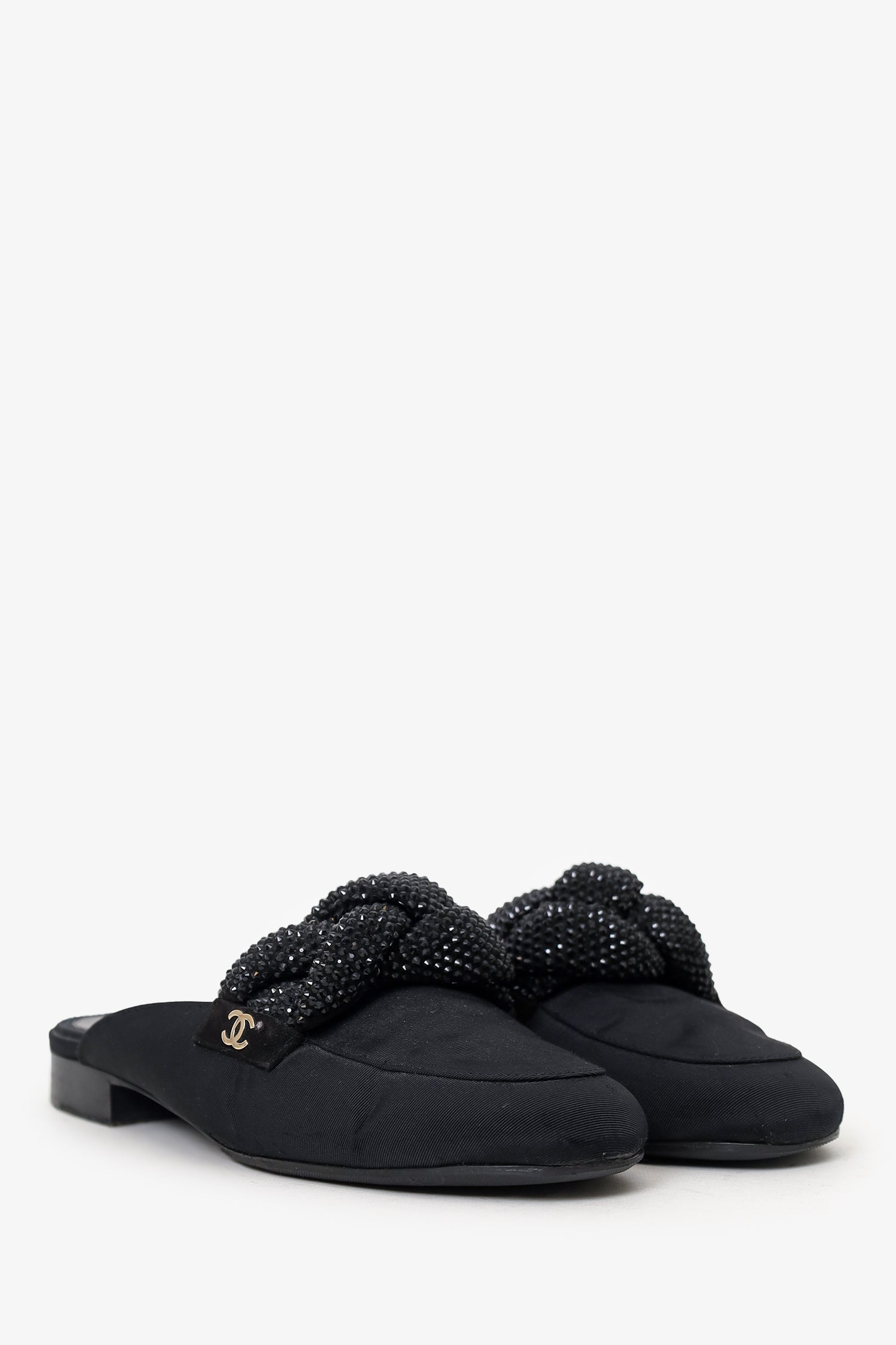 Refresh availabilityPre-Loved Chanel™ Black Crystal Embellished Braid Detailed Mules. Slip-on. Round toe. Quilted insoles. Gold-tone hardware. Tonal stitching.
