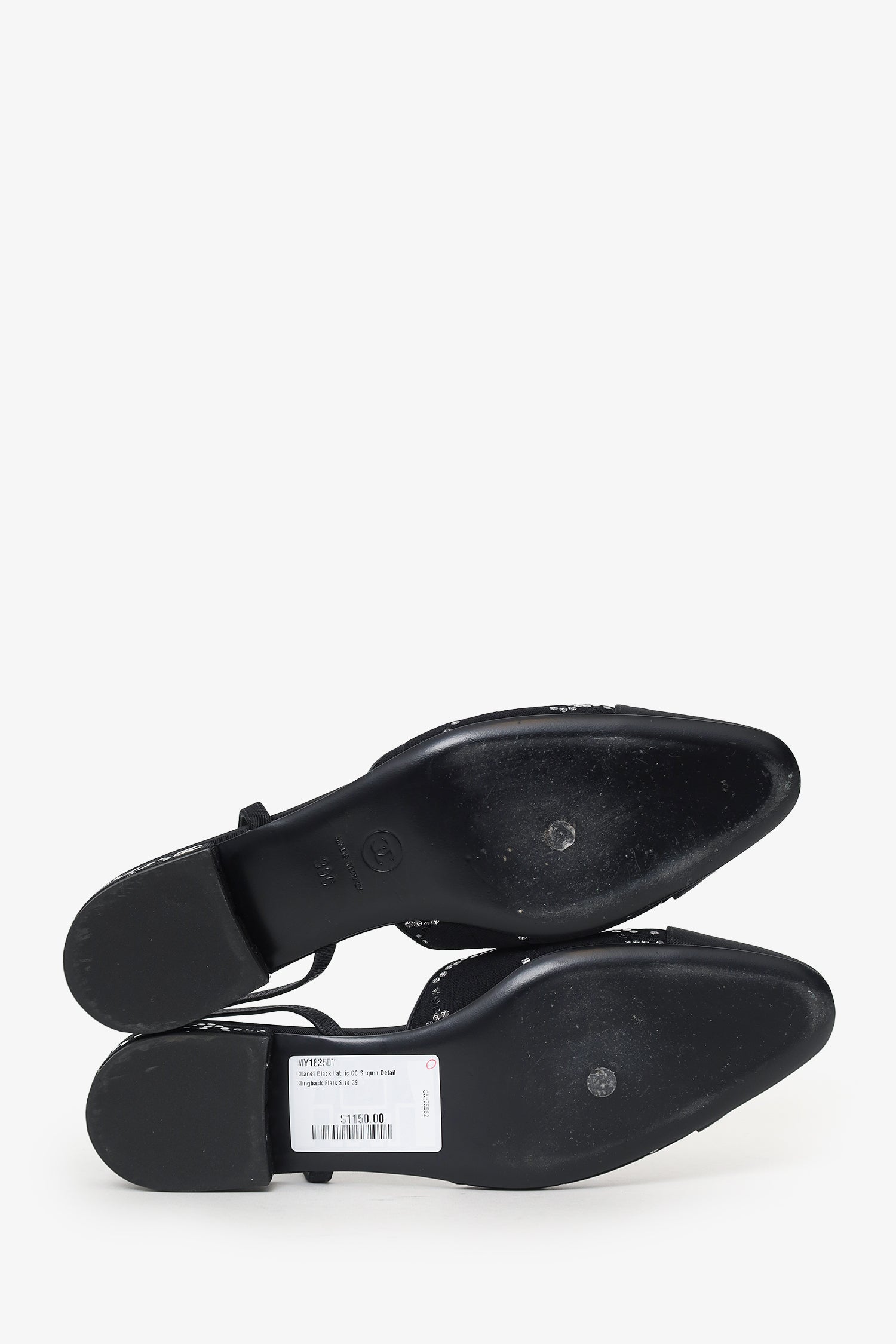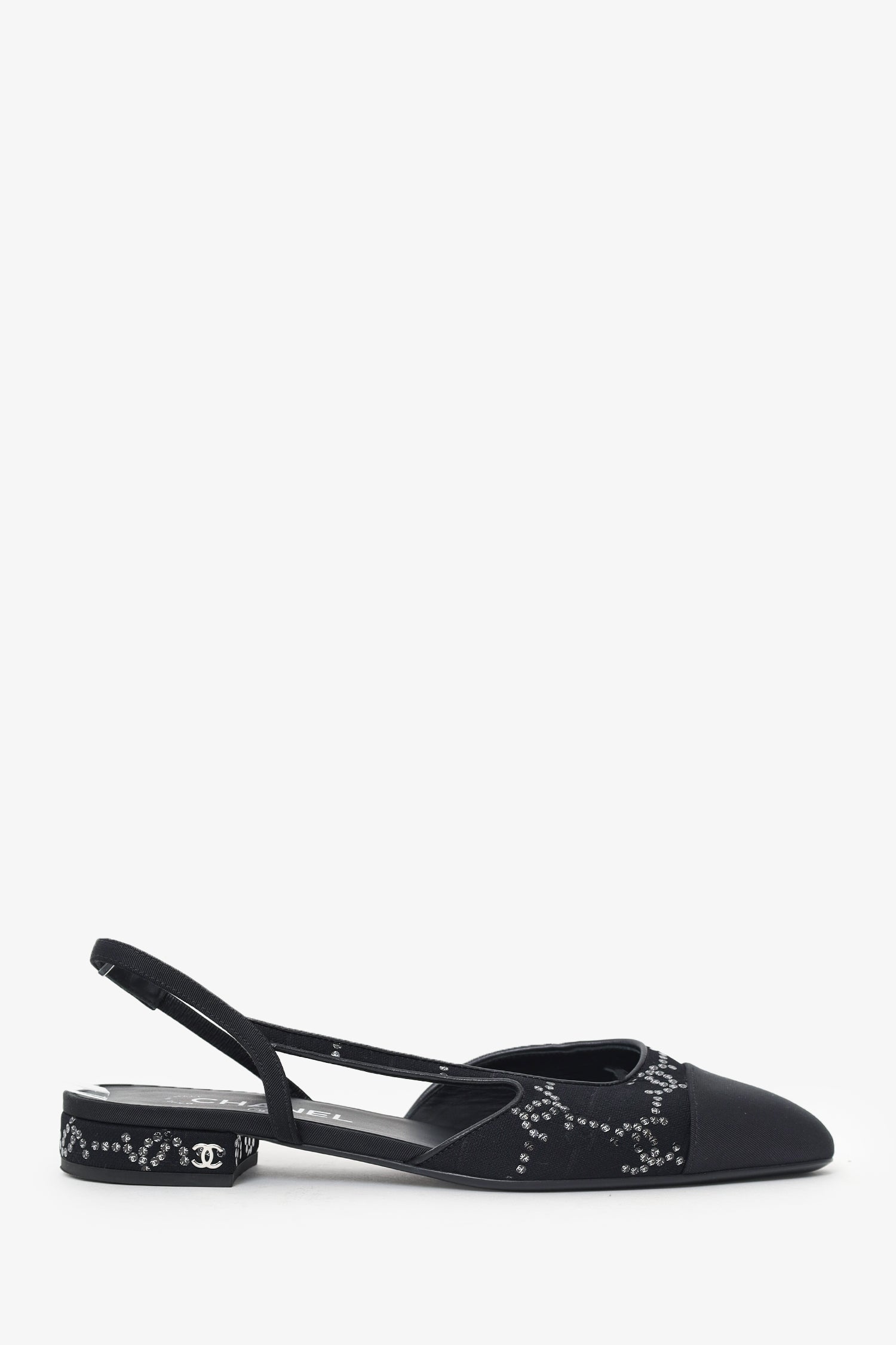 Refresh availabilityPre-Loved Chanel™ Black Fabric CC Sequin Detail Slingback Flats. Slip-on. Round toe. Block heel. Silver-tone hardware. Tonal stitching.