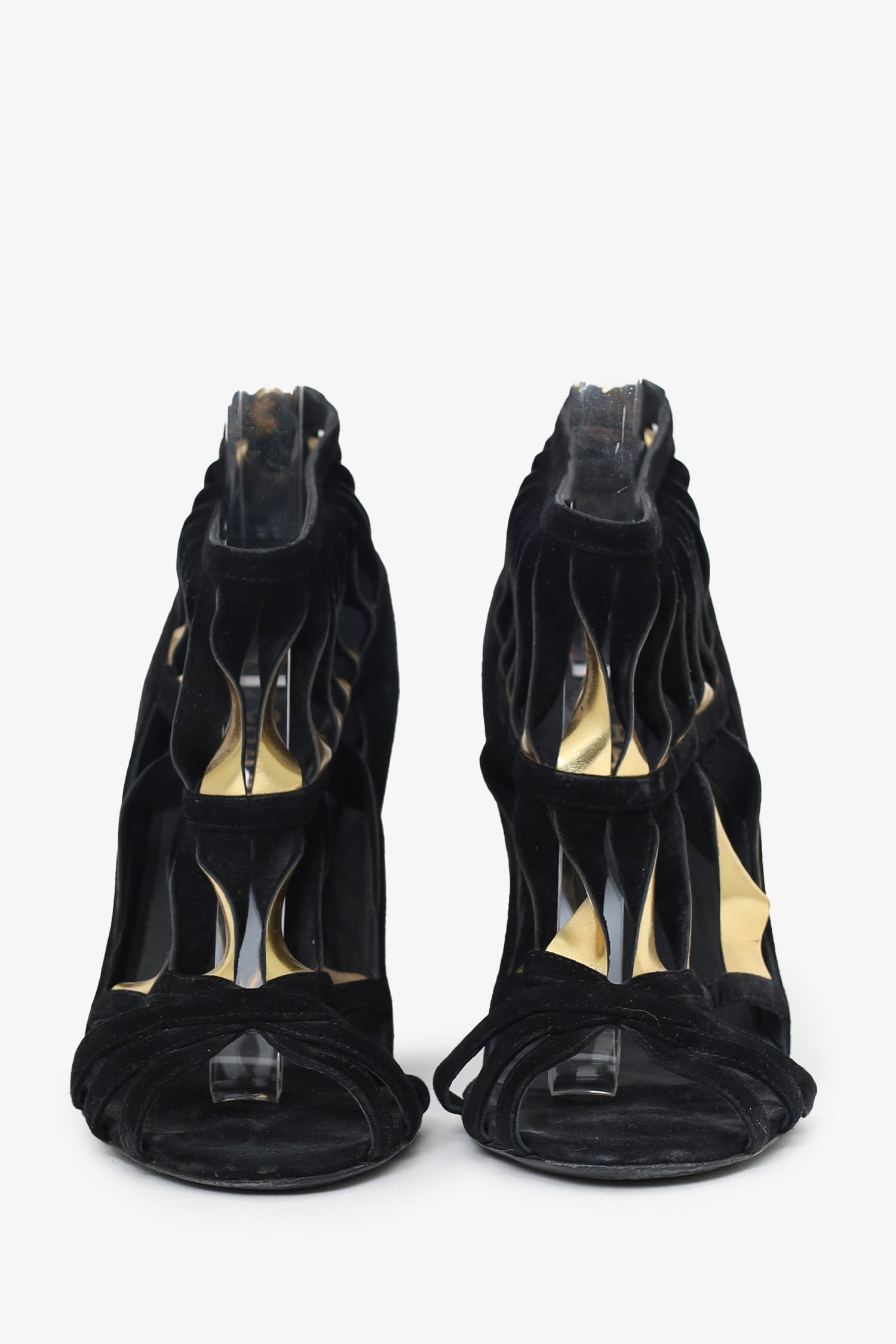 Refresh availabilityPre-Loved Chanel™ Black/Gold Suede Wedges. Pull-on with rear zip closure. Pointed open toe. Tonal Stitching. Gold-tone hardware.