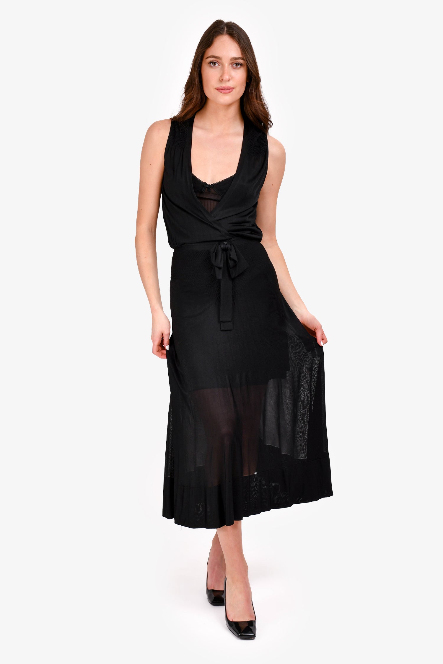 Refresh availabilityPre-Loved Chanel Black Knit V-Neck Dress with Bustier Detail Slip Dress. V-neckline. Sleeveless. Includes matching slip dress. Pull-on. Tonal stitching.