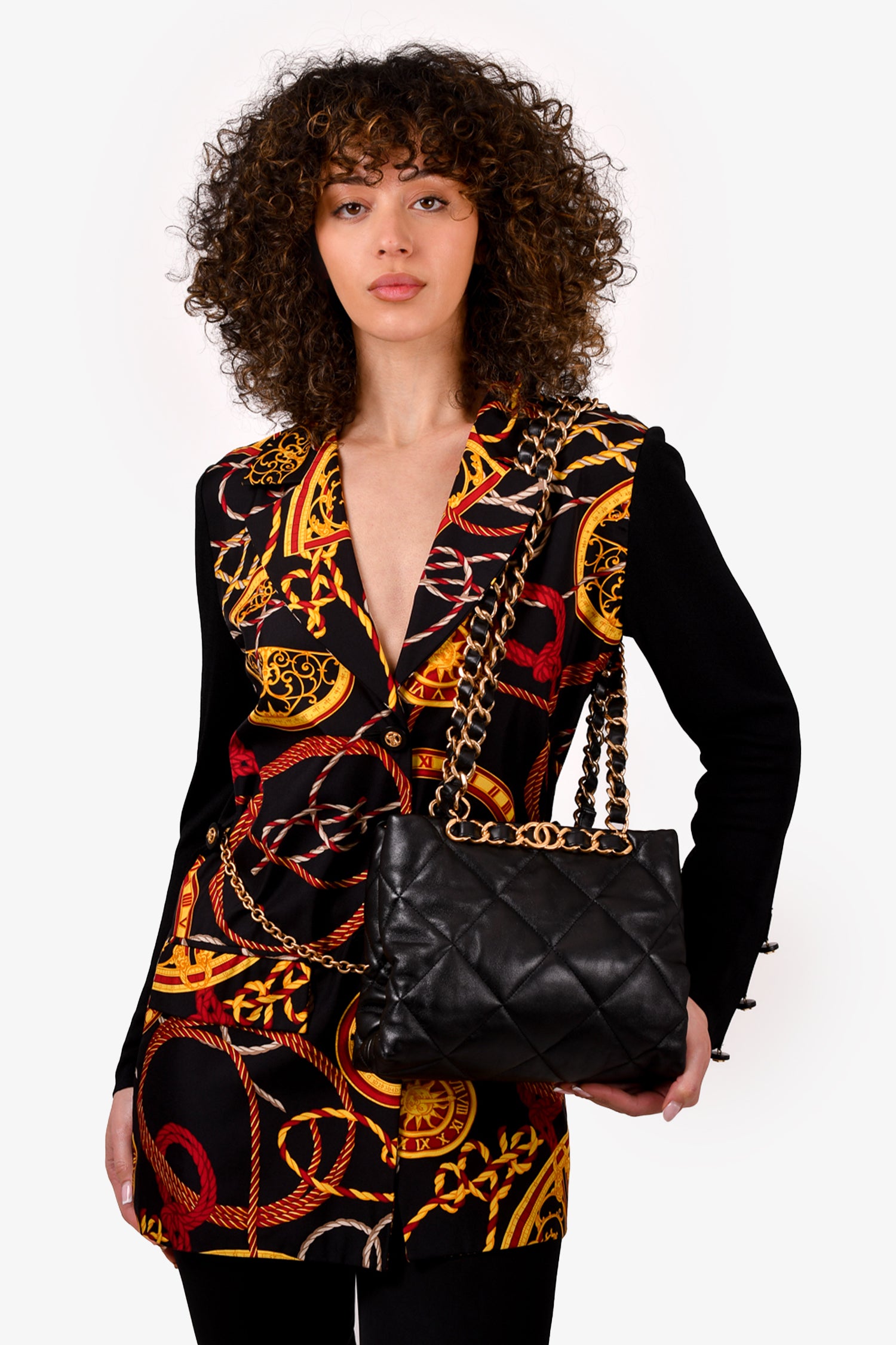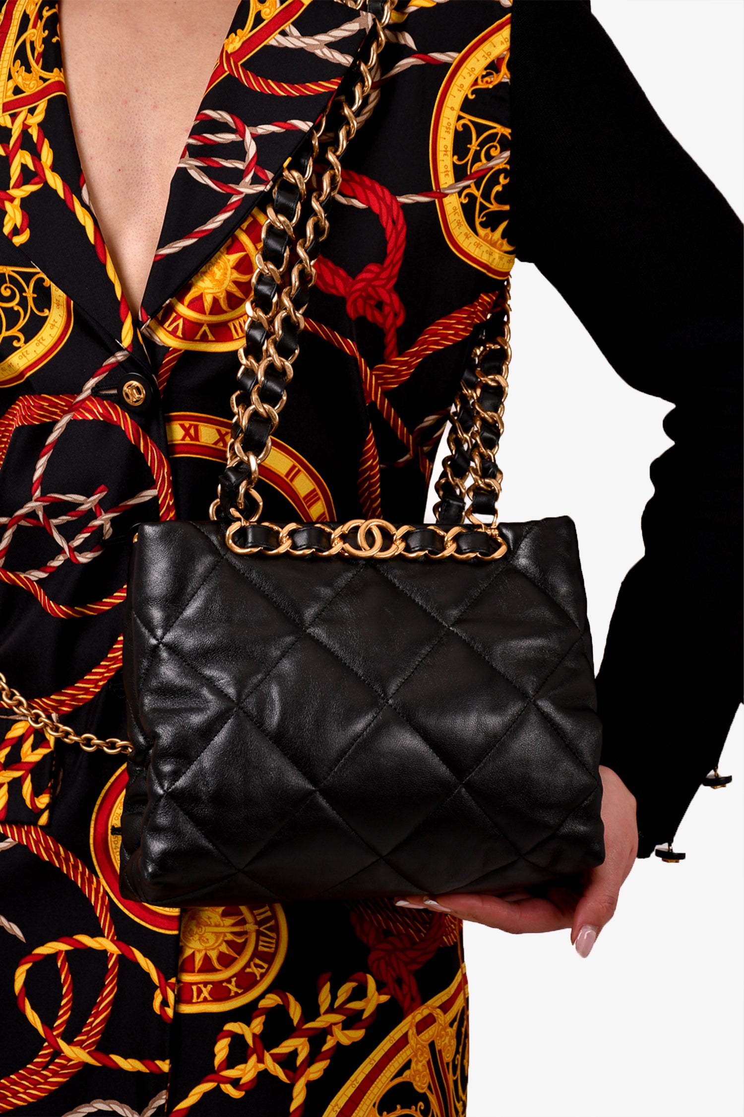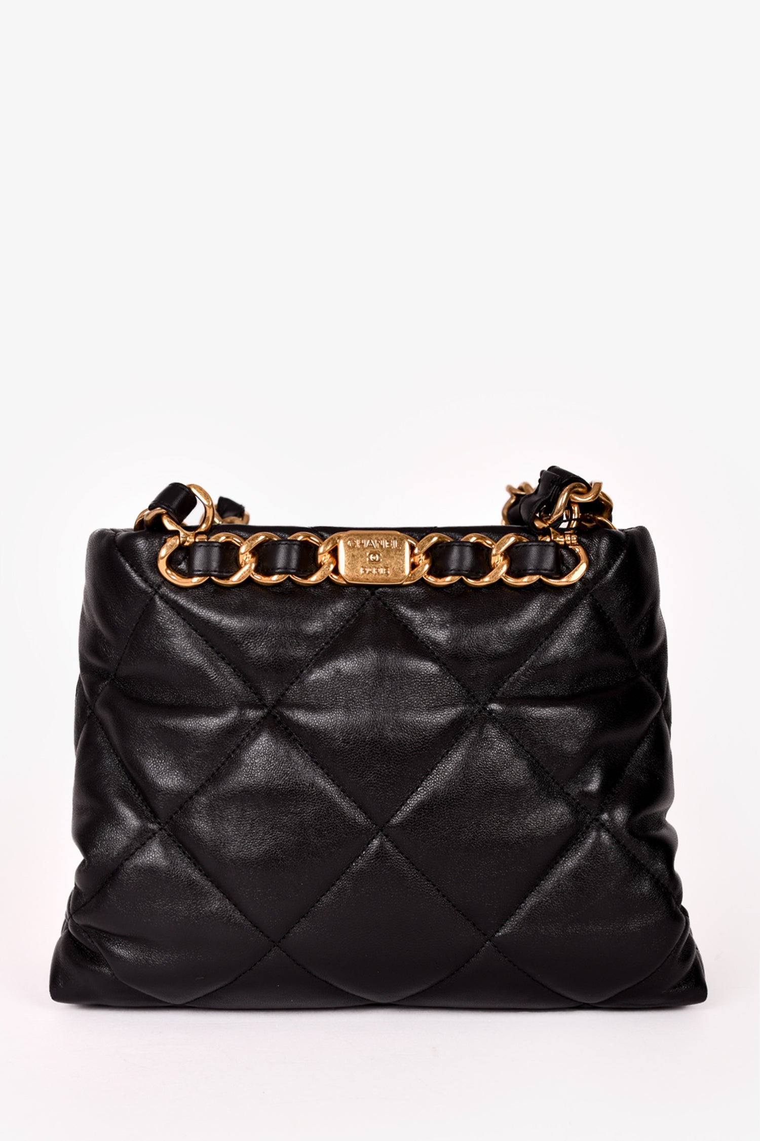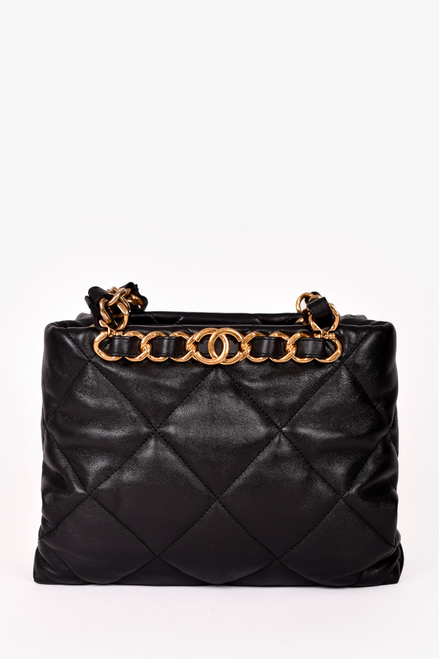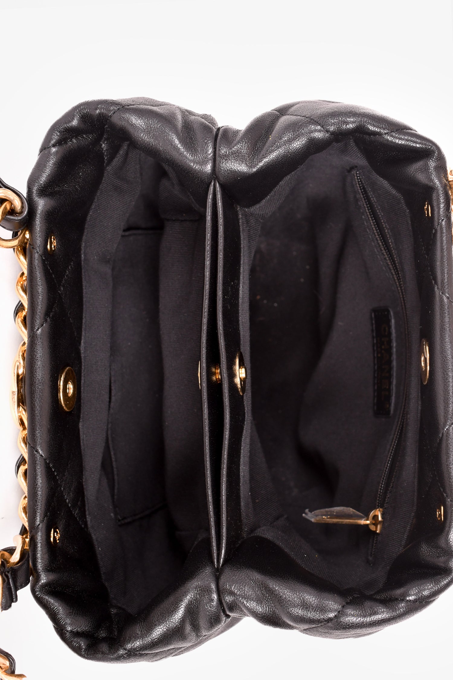 Refresh availabilityPre-loved Chanel™ Black Lambskin Quilted Small Shopping Shoulder Bag. Lined. 1 interior slip pocket. 1 interior zip pocket. 1 interior button pocket. Button closure. Gold-tone hardware. Tonal stitching.