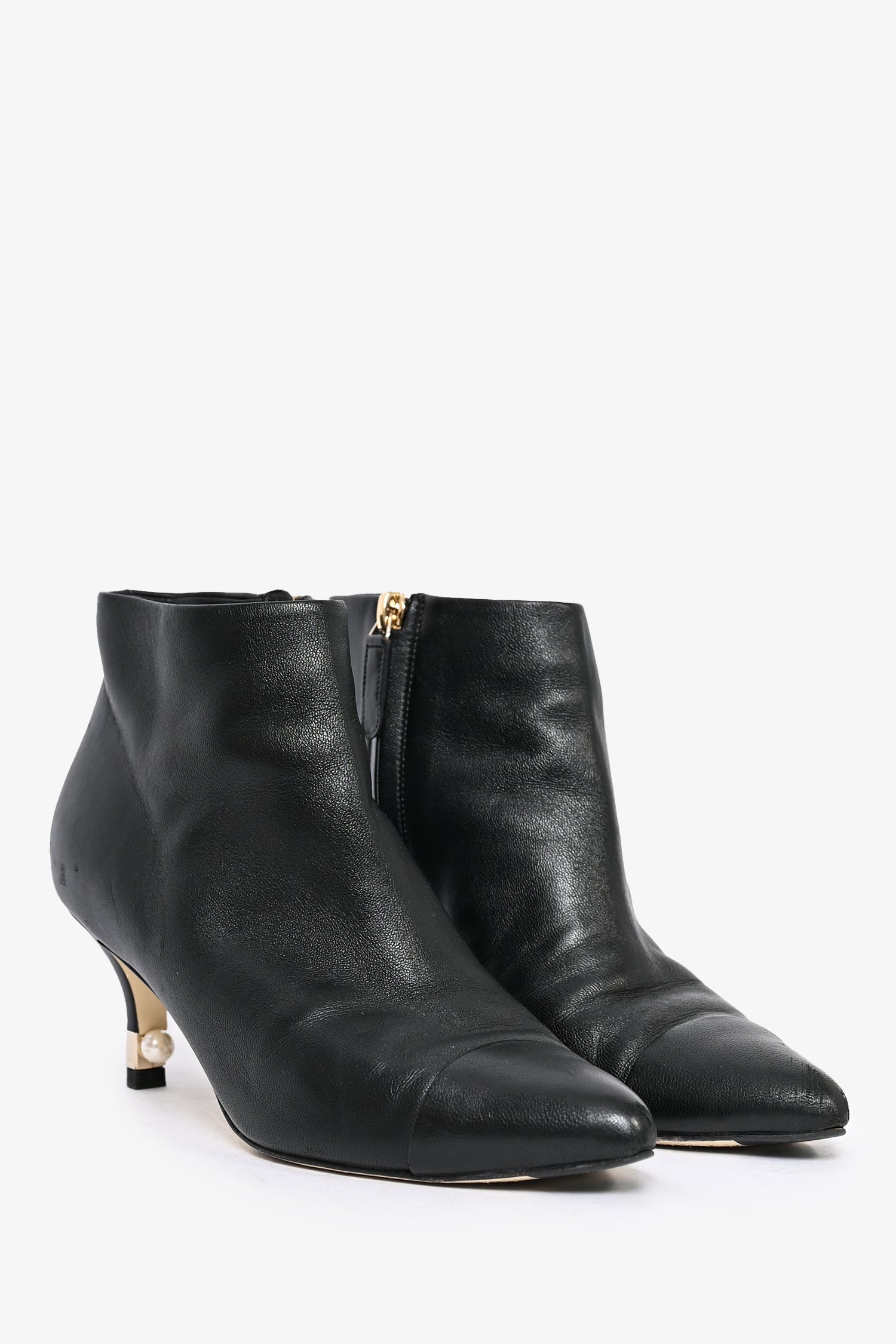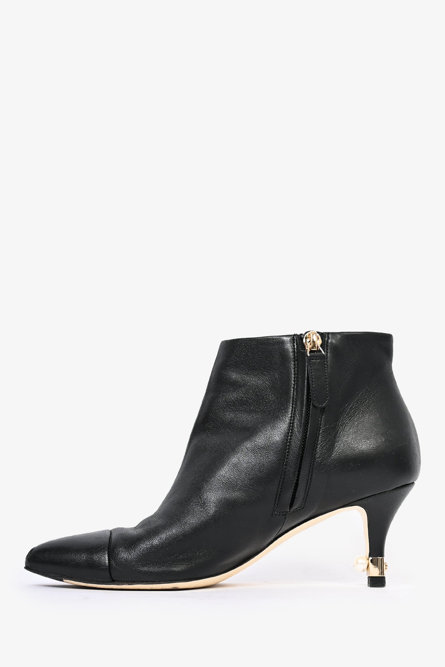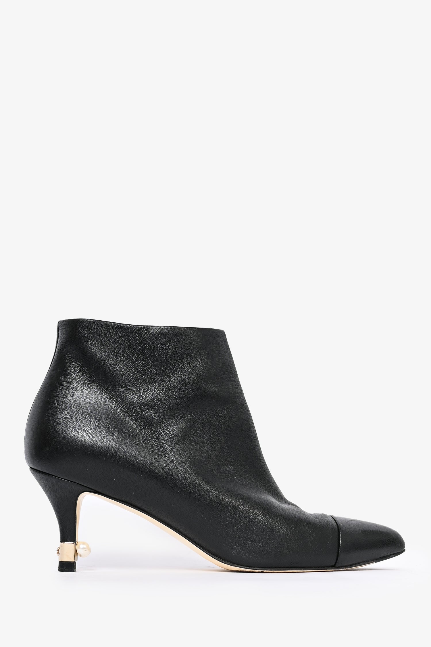 Refresh availabilityPre-Loved Chanel™ Black Leather CC Pearl Kitten Heel Ankle Boots. Pointed toe. Side zip closure.