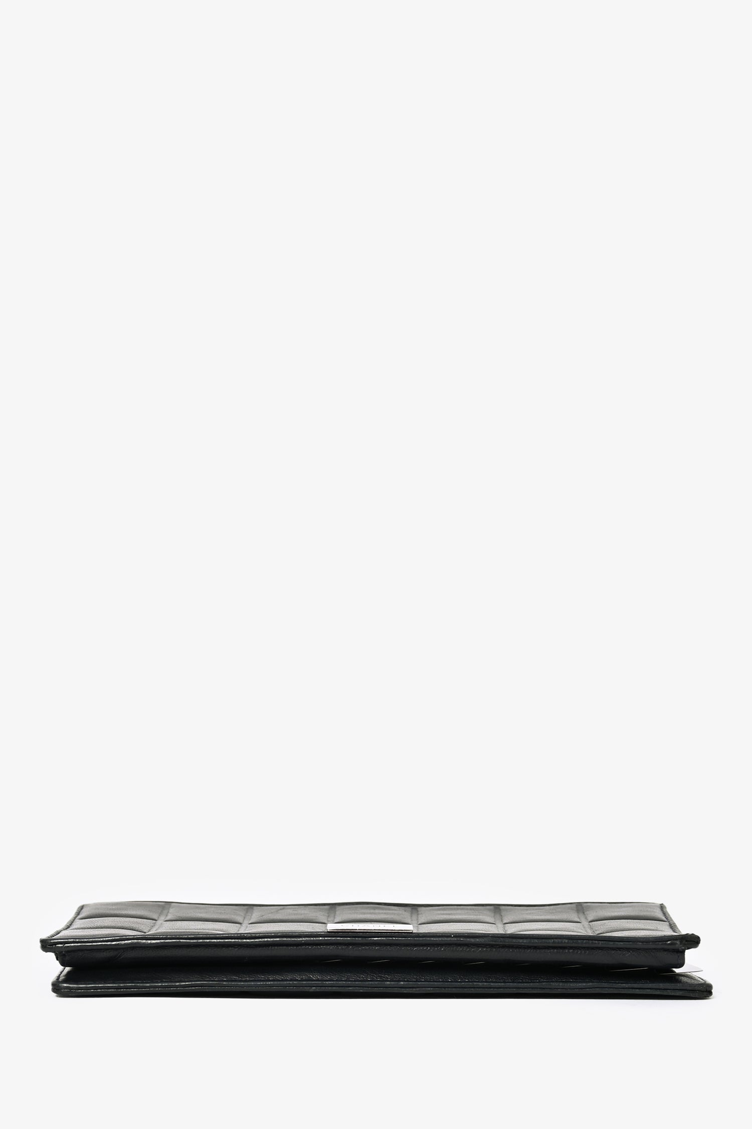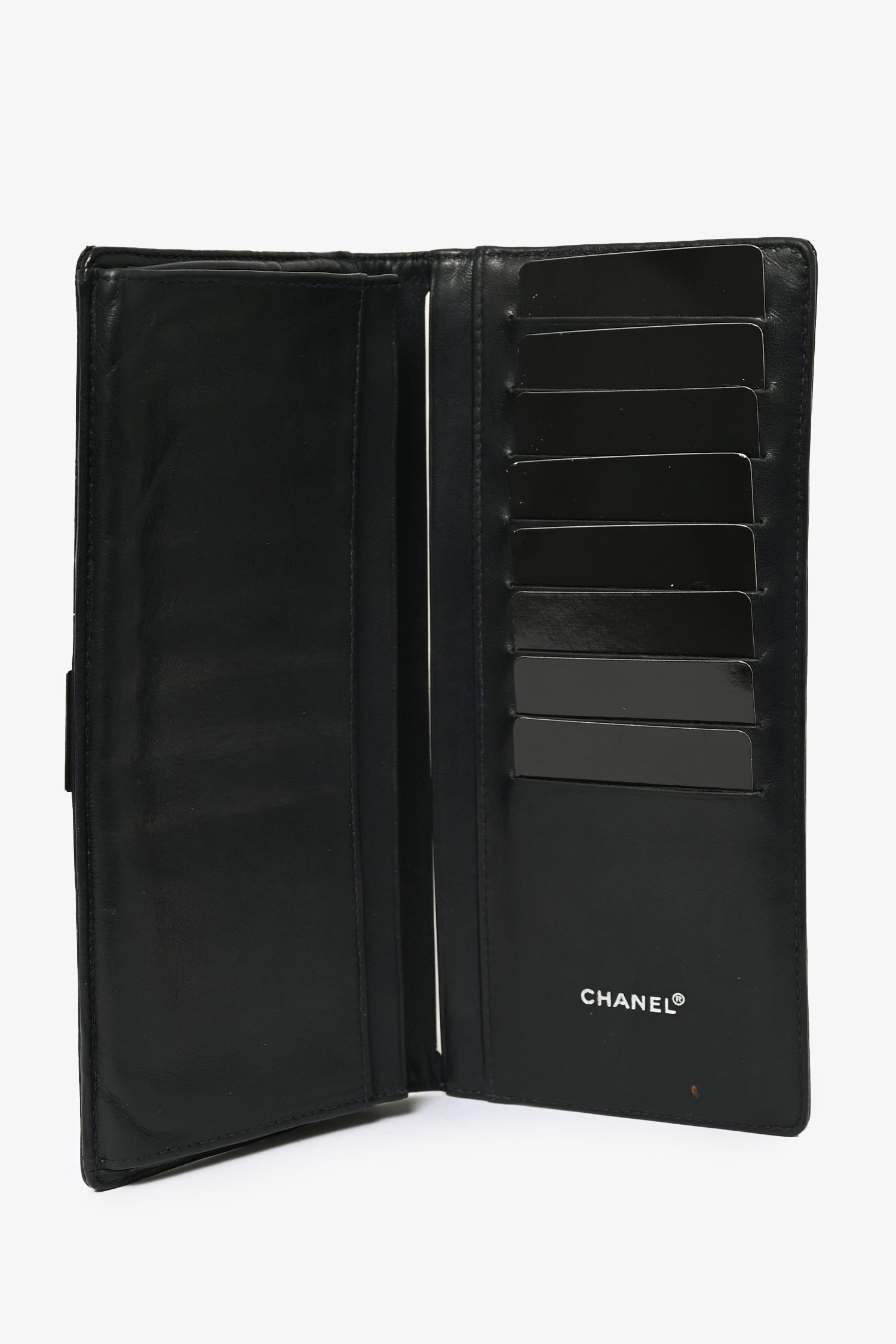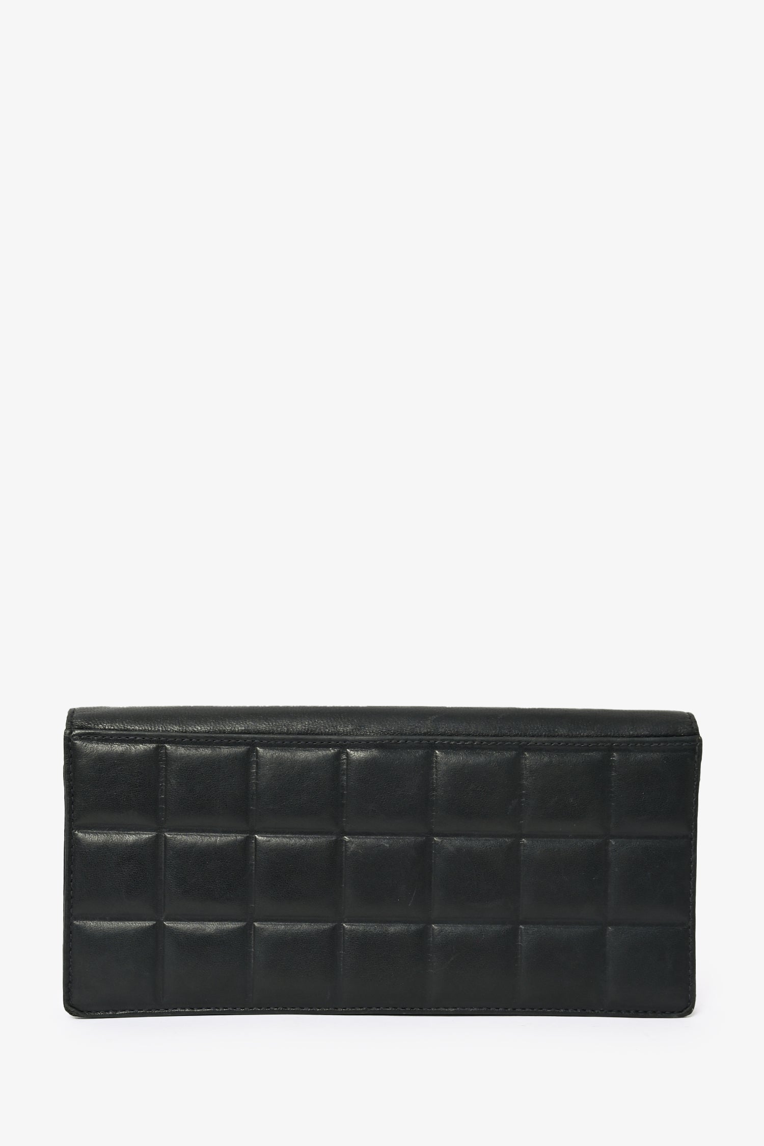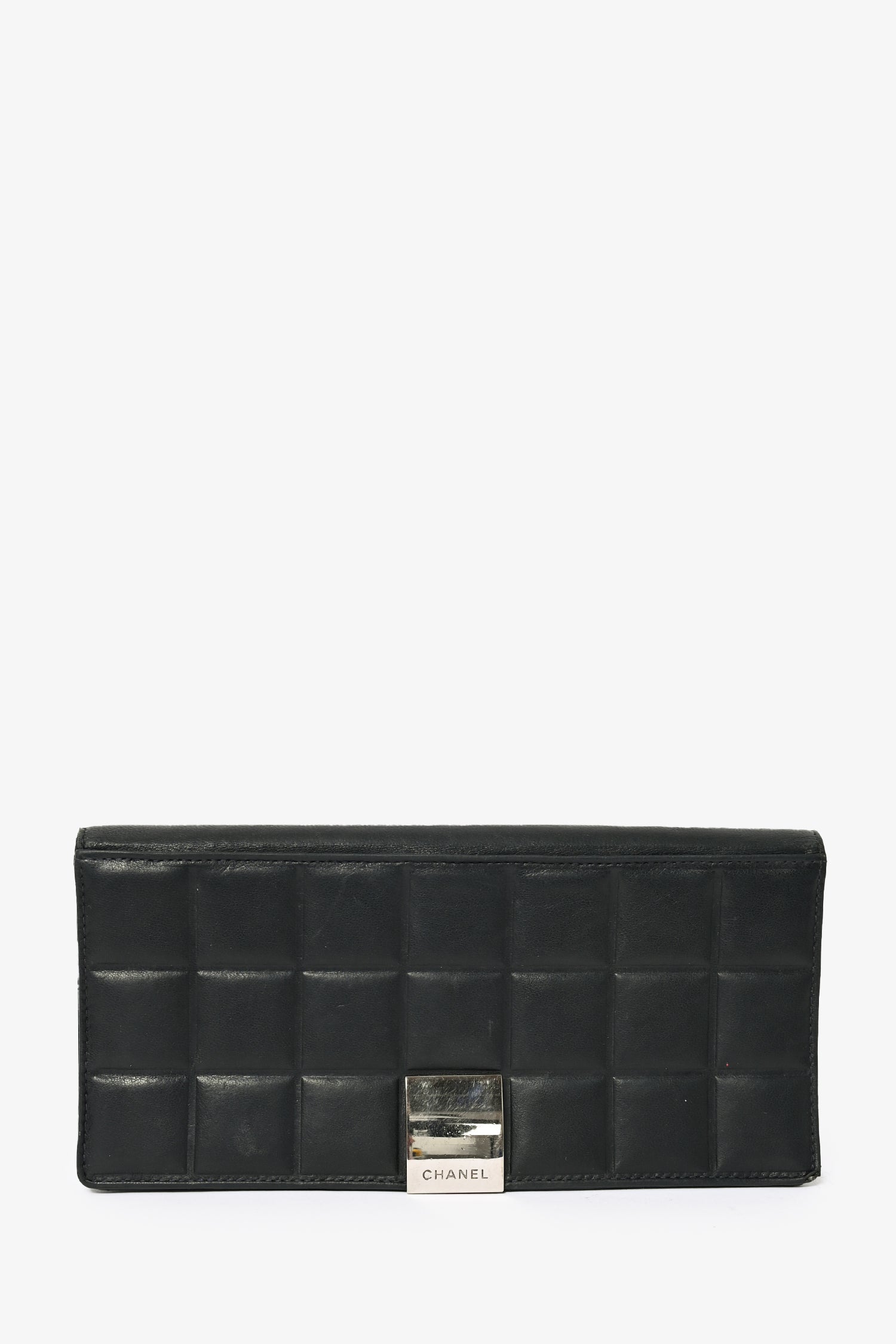 Pre-Loved Chanel™ Black Leather Chocolate Bar Wallet. 8 card slots. 4 interior compartments. Tonal stitching. Silver-foil CHANEL logo in interior. Quilt detail throughout. Silver-toned hardware at centre.