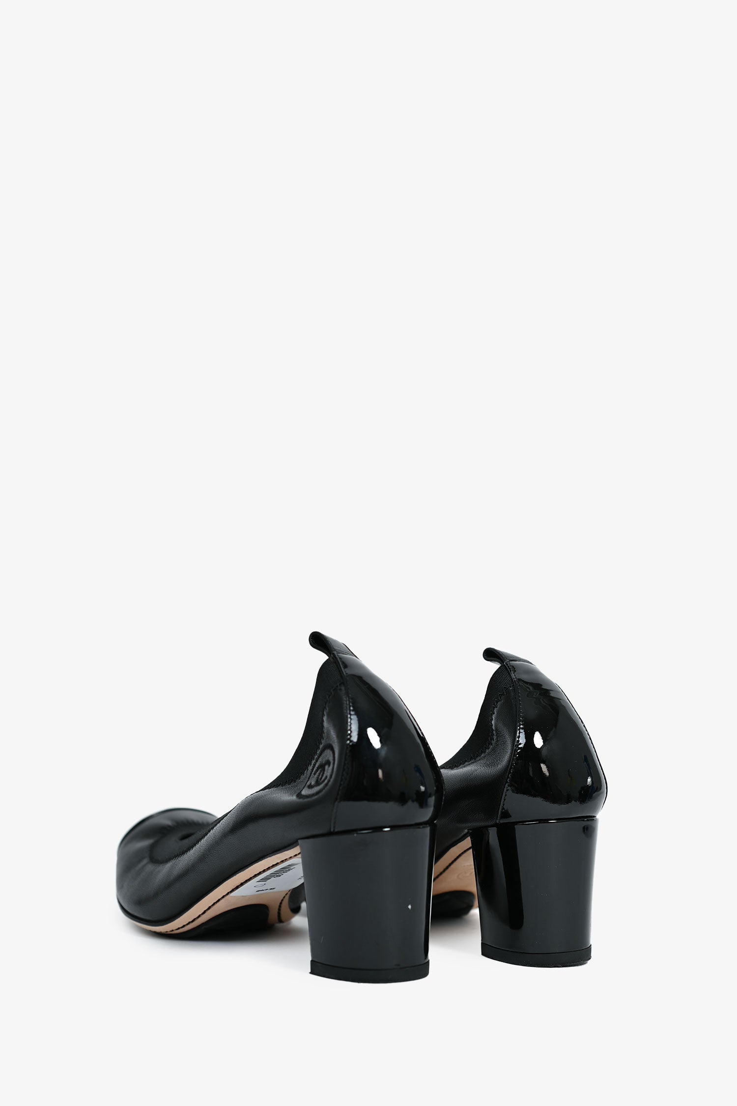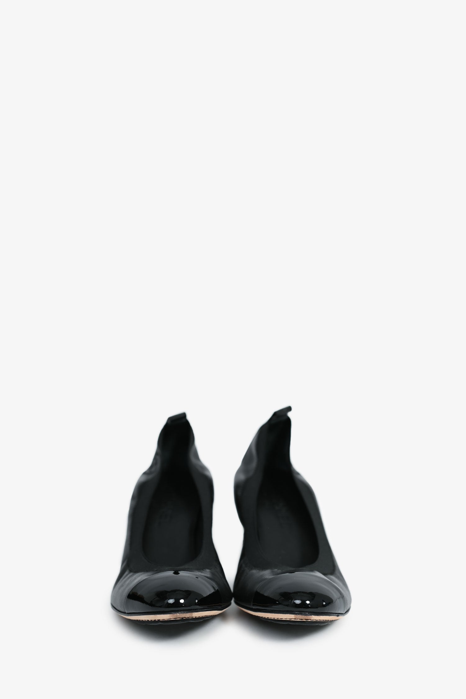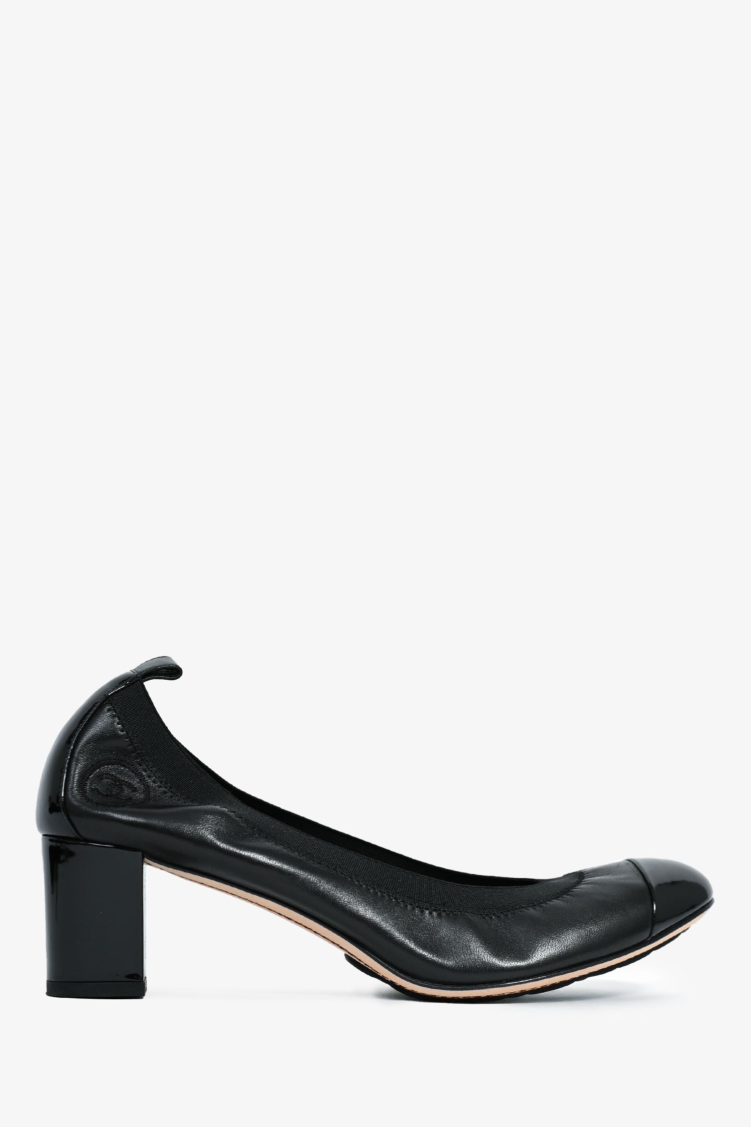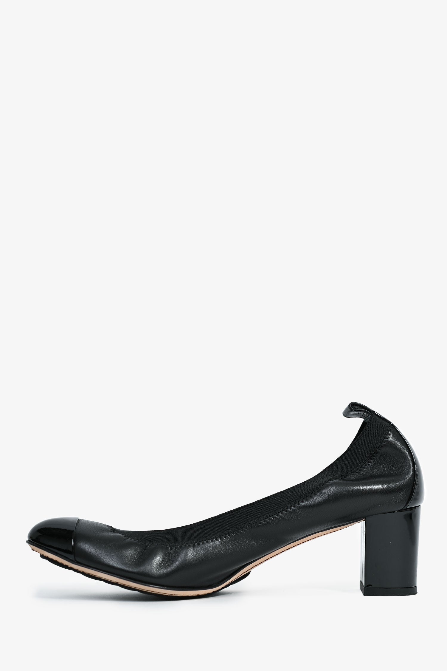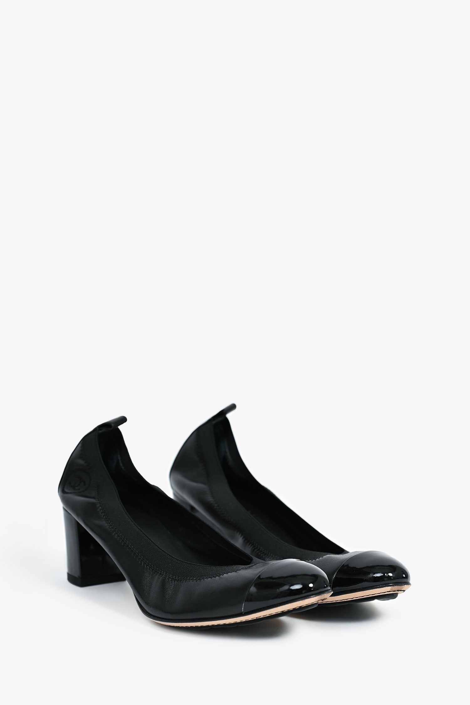 Refresh availabilityPre-Loved Chanel™ Black Leather Interlocking CC Cap Toe Heels. Slip-on. Round toe. Block heel.