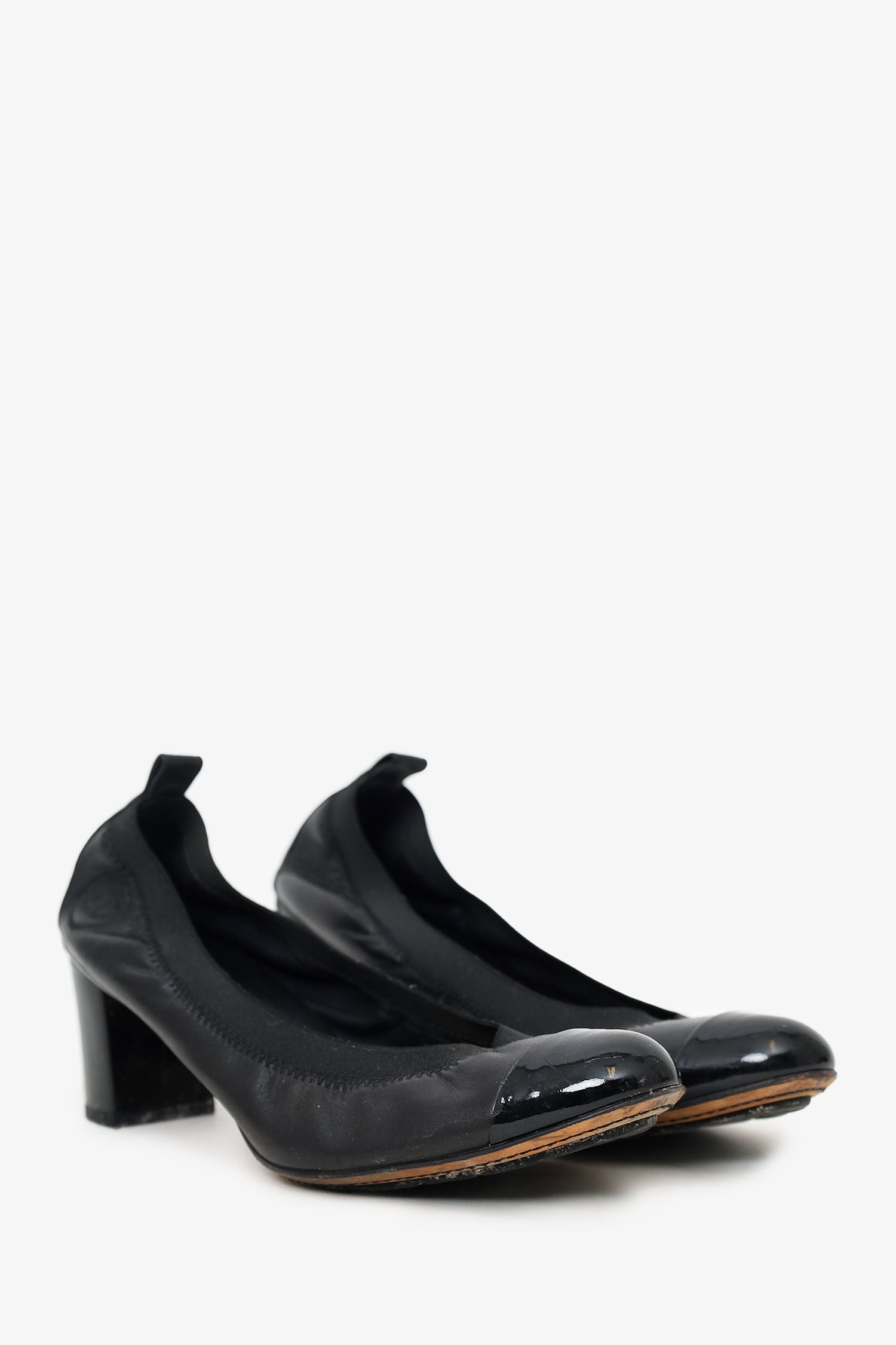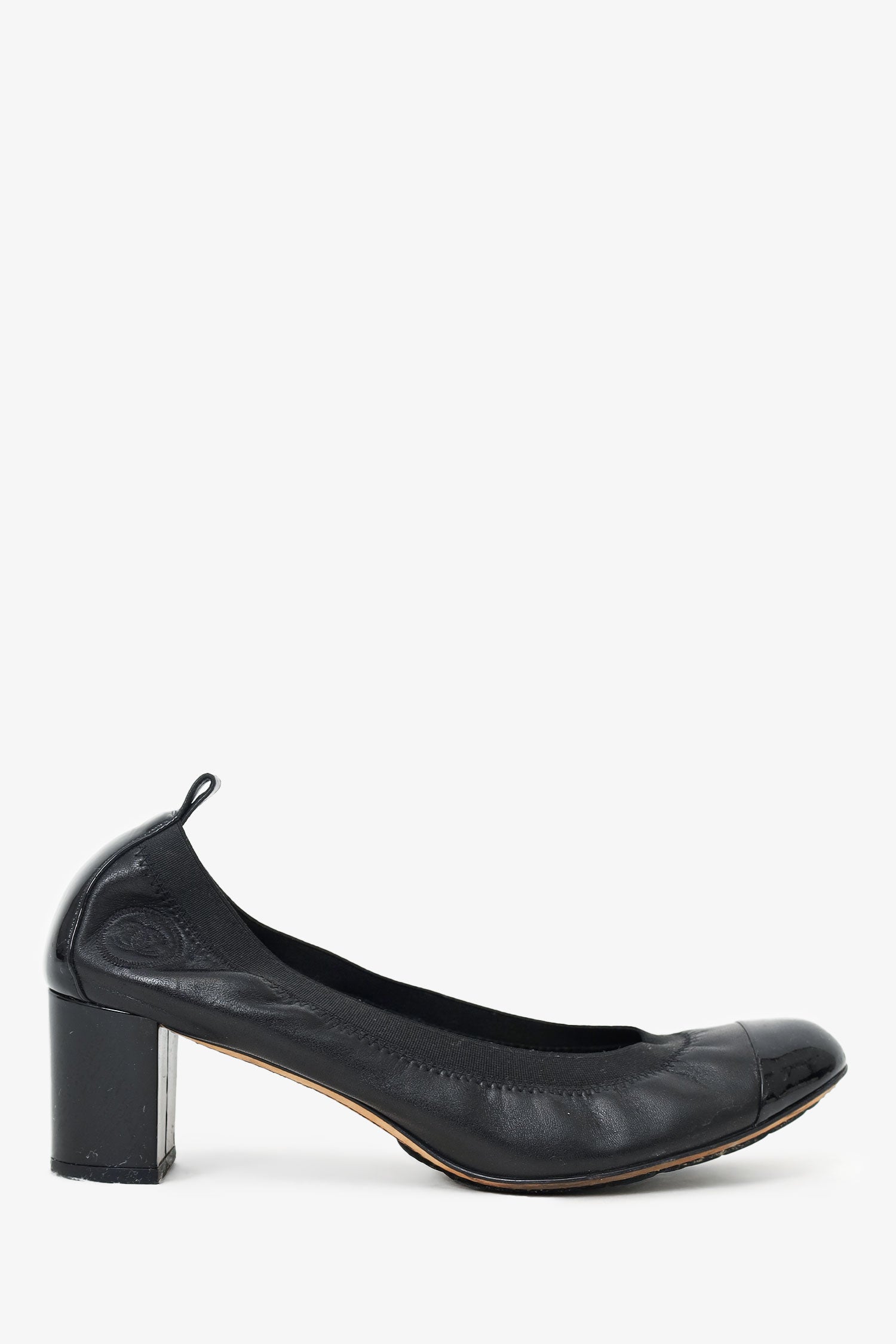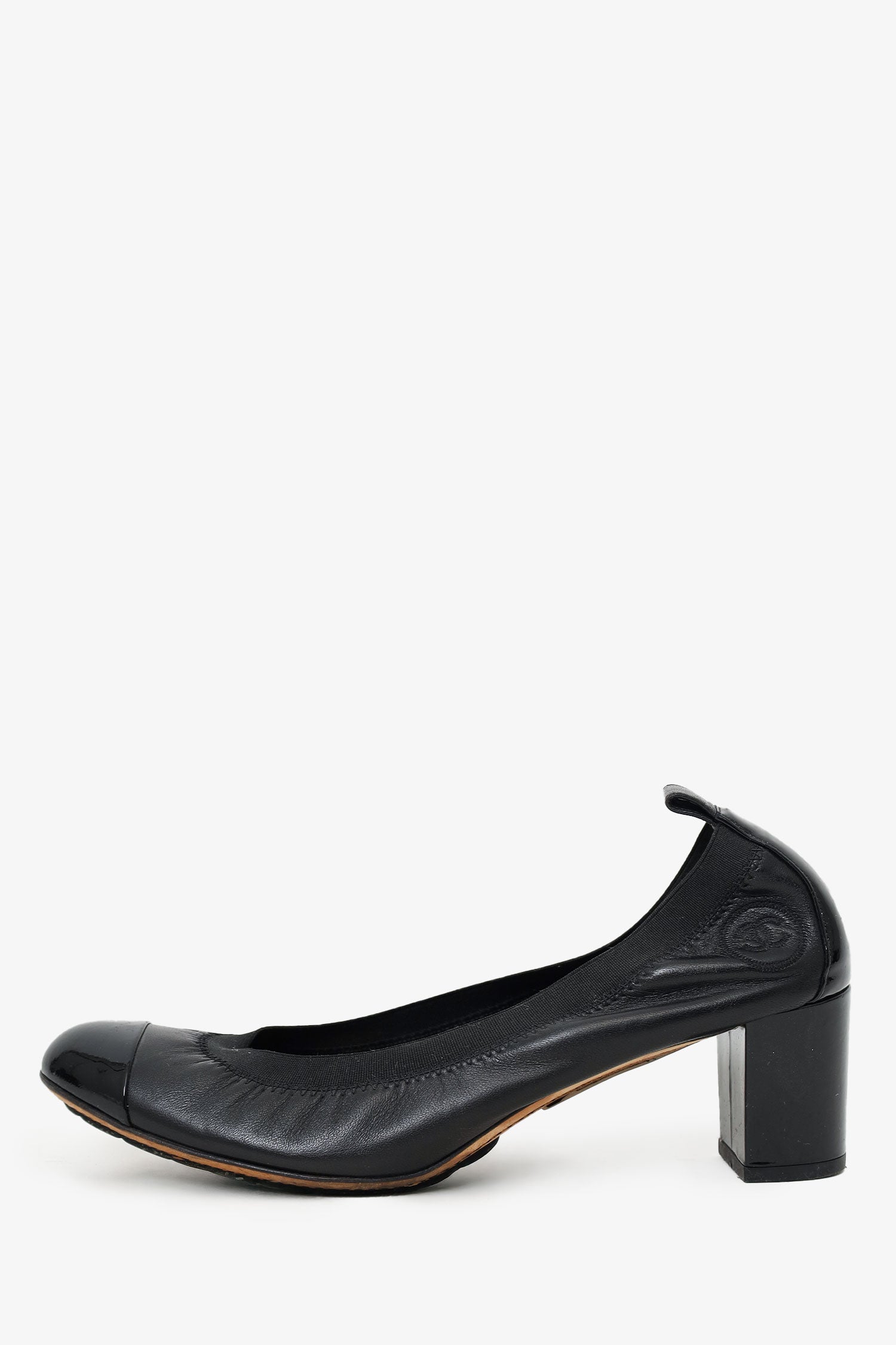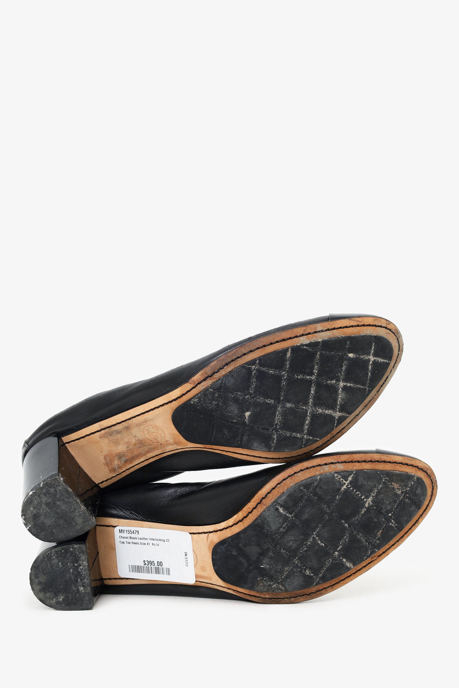 Refresh availabilityPre-loved Chanel™ Black Leather Interlocking CC Cap Toe Heels. Slip-on. Round toe. Rear pull tabs. Tonal stitching.