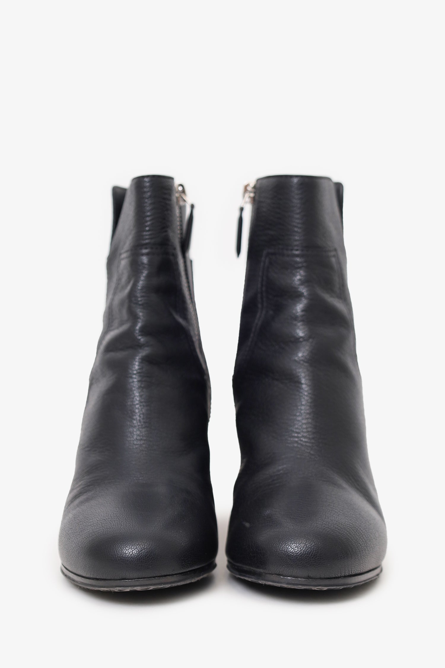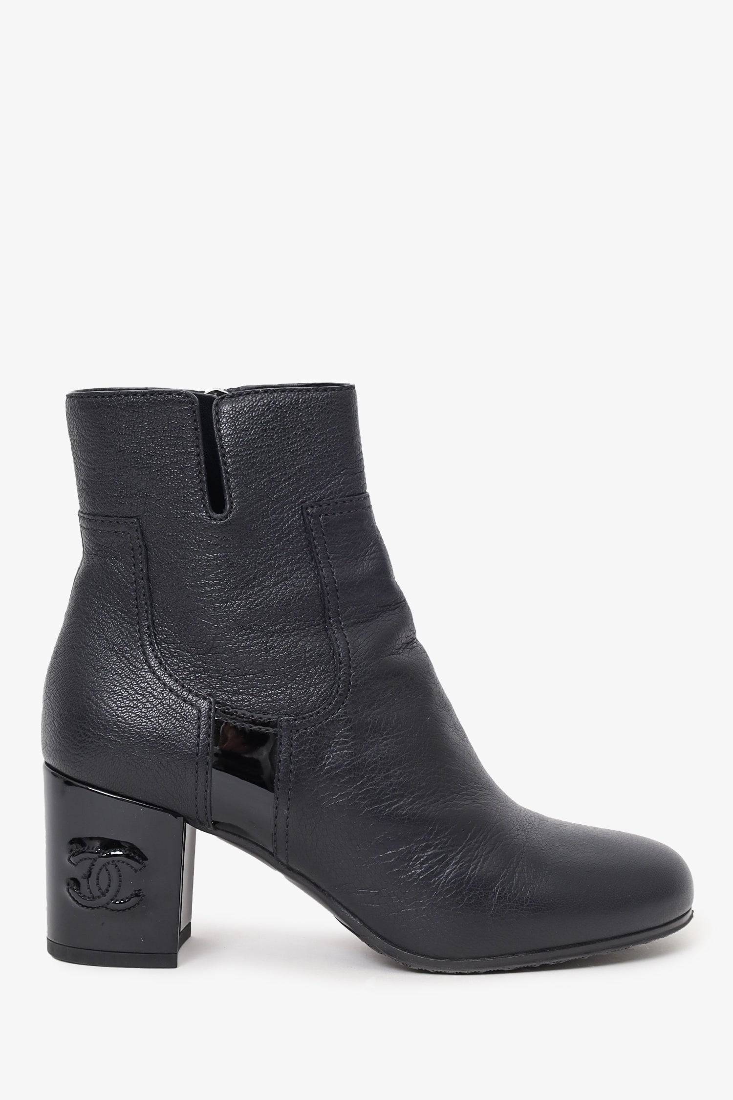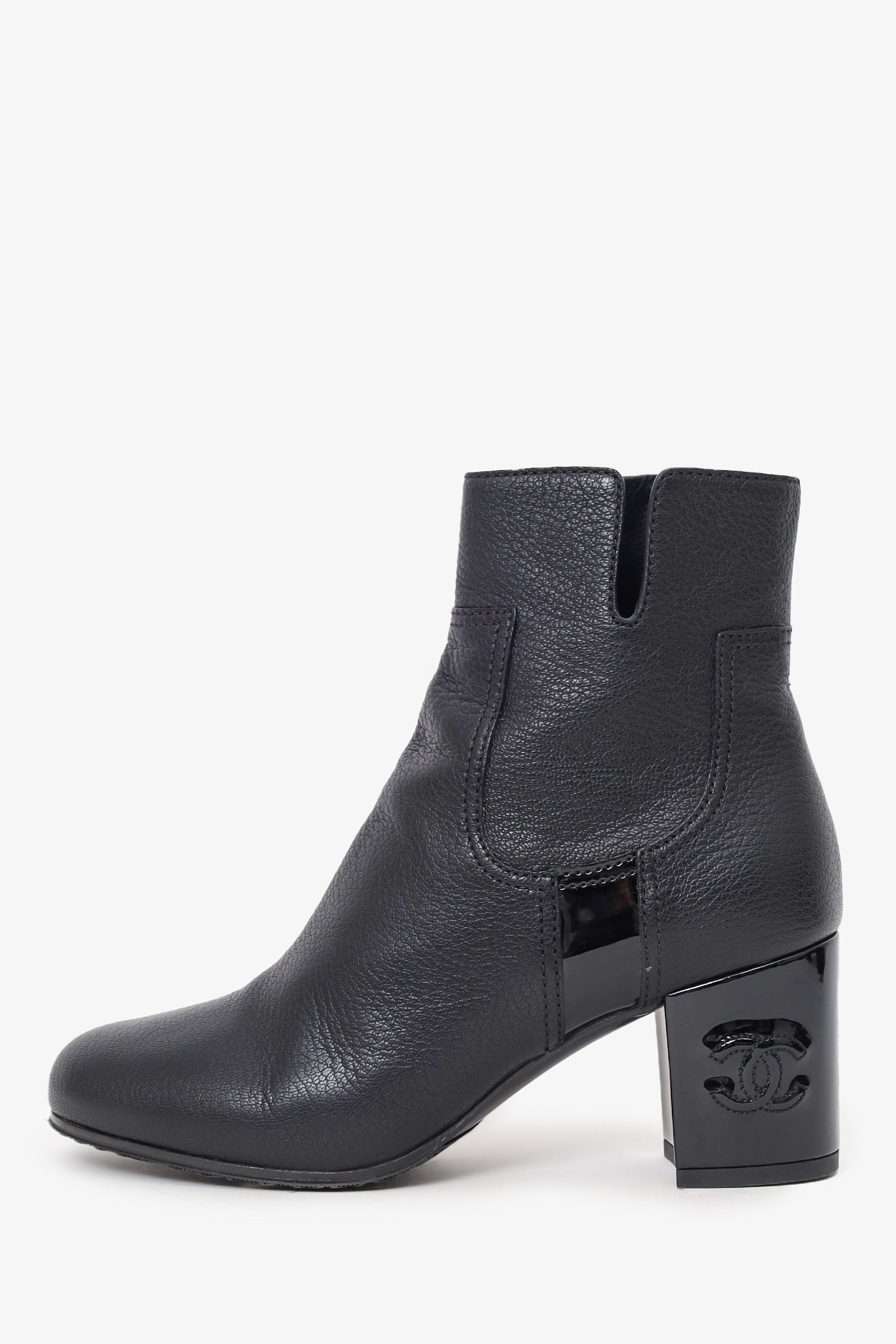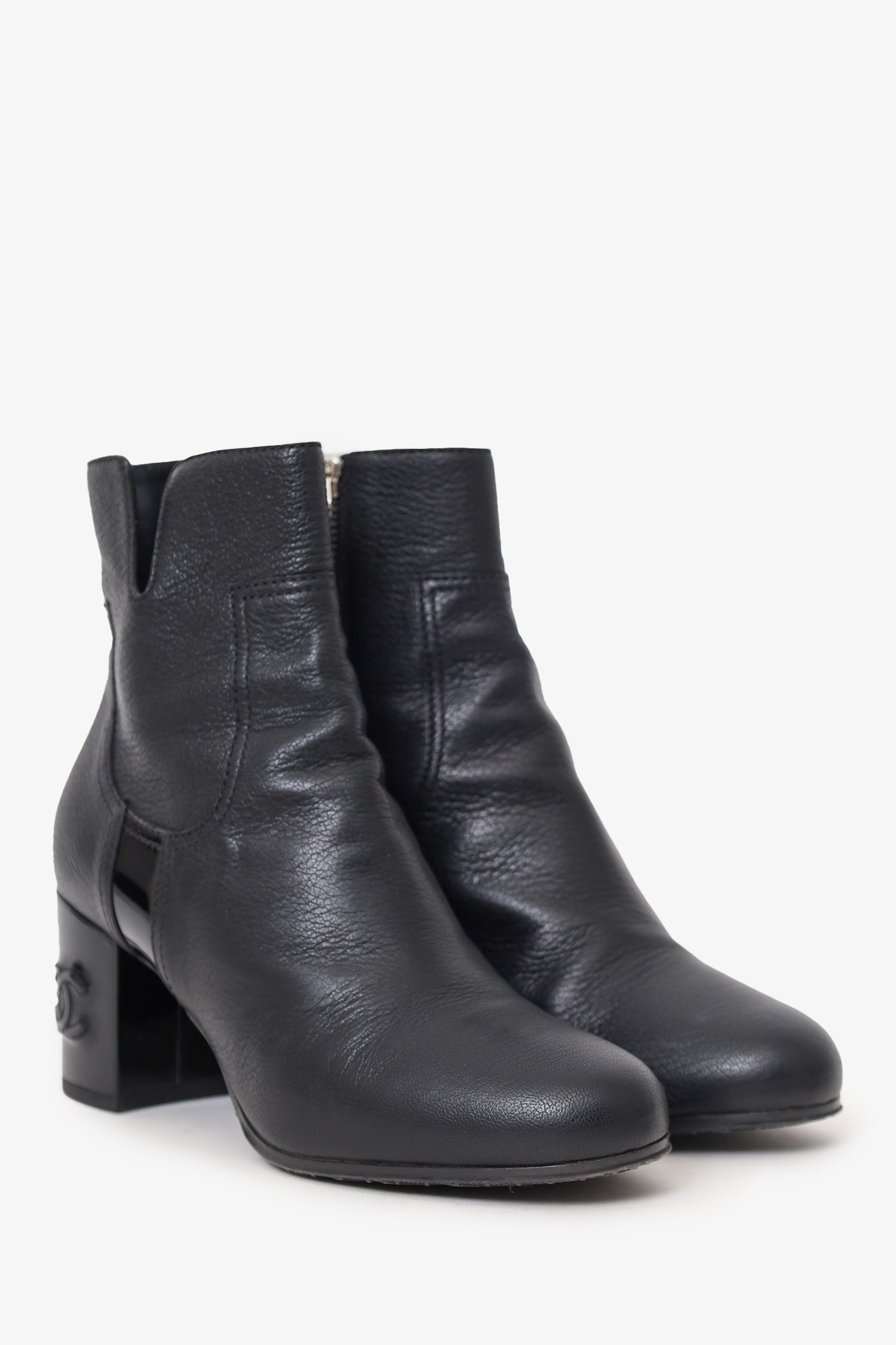Refresh availabilityPre-loved Chanel™ Black Leather Interlocking CC Logo Boots. Side zip closure. Round toe. Block heel. Tonal stitching.