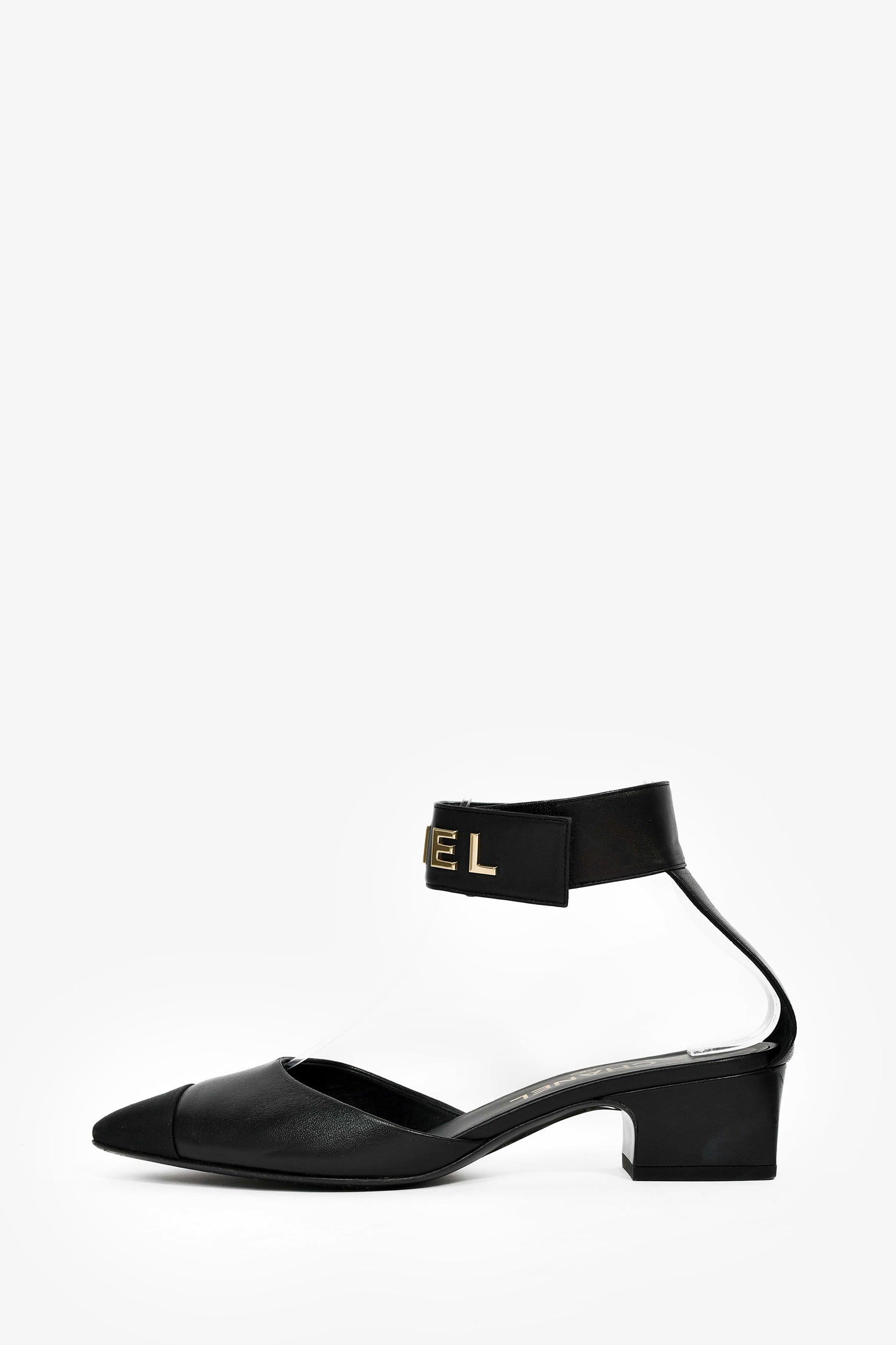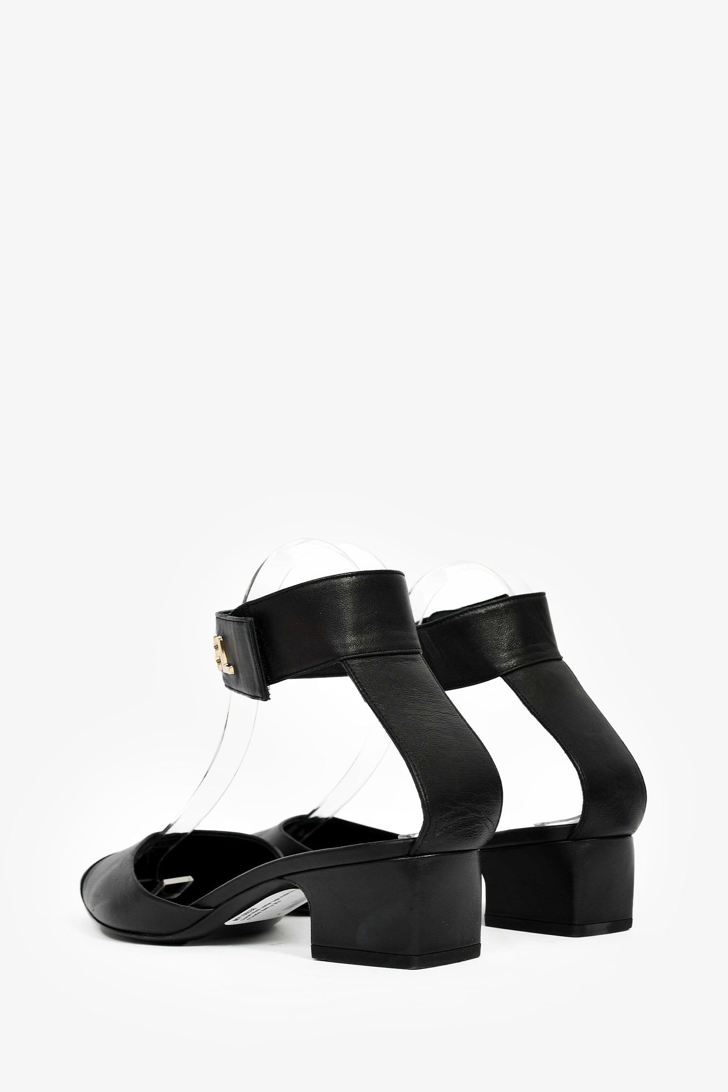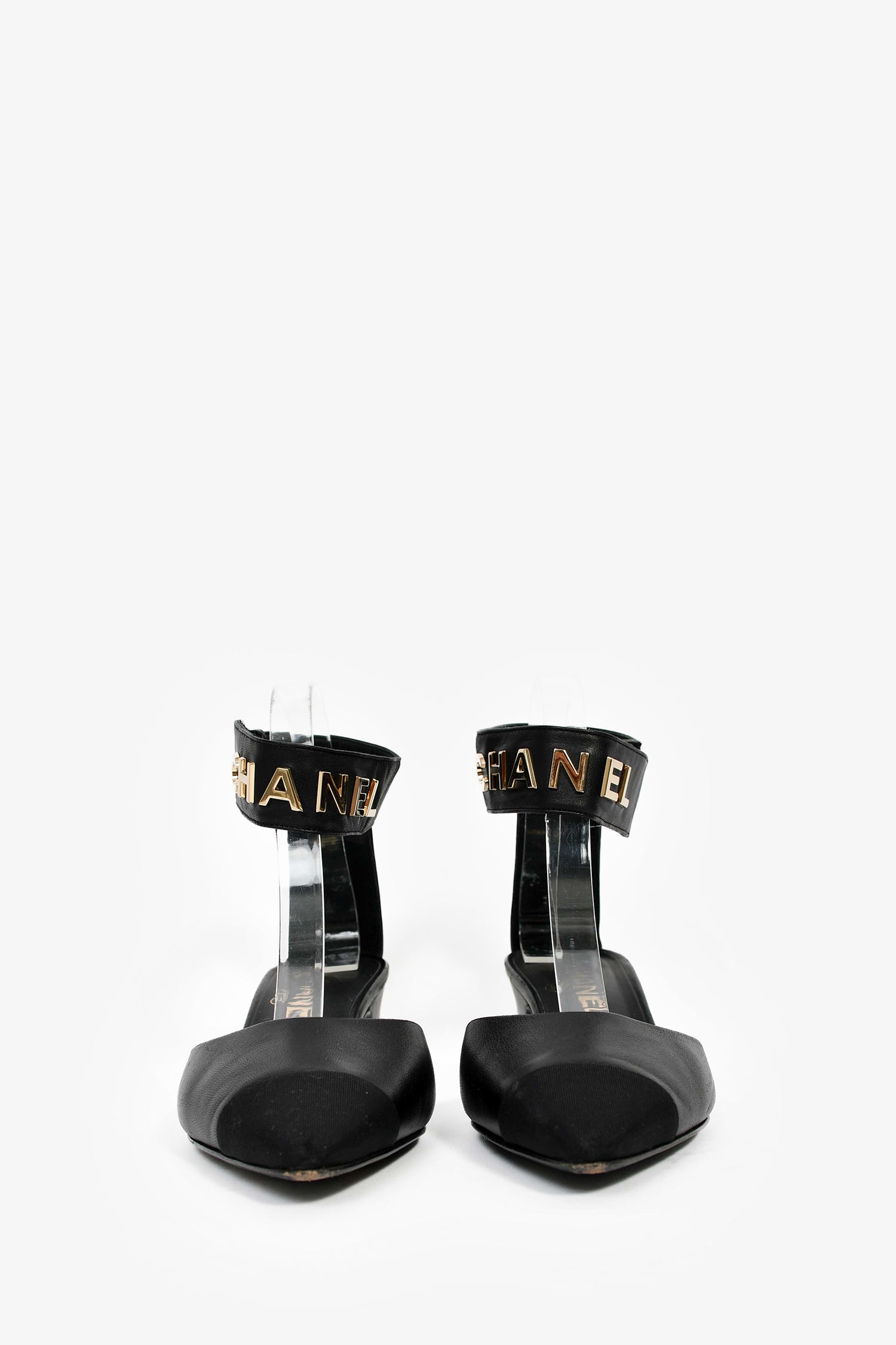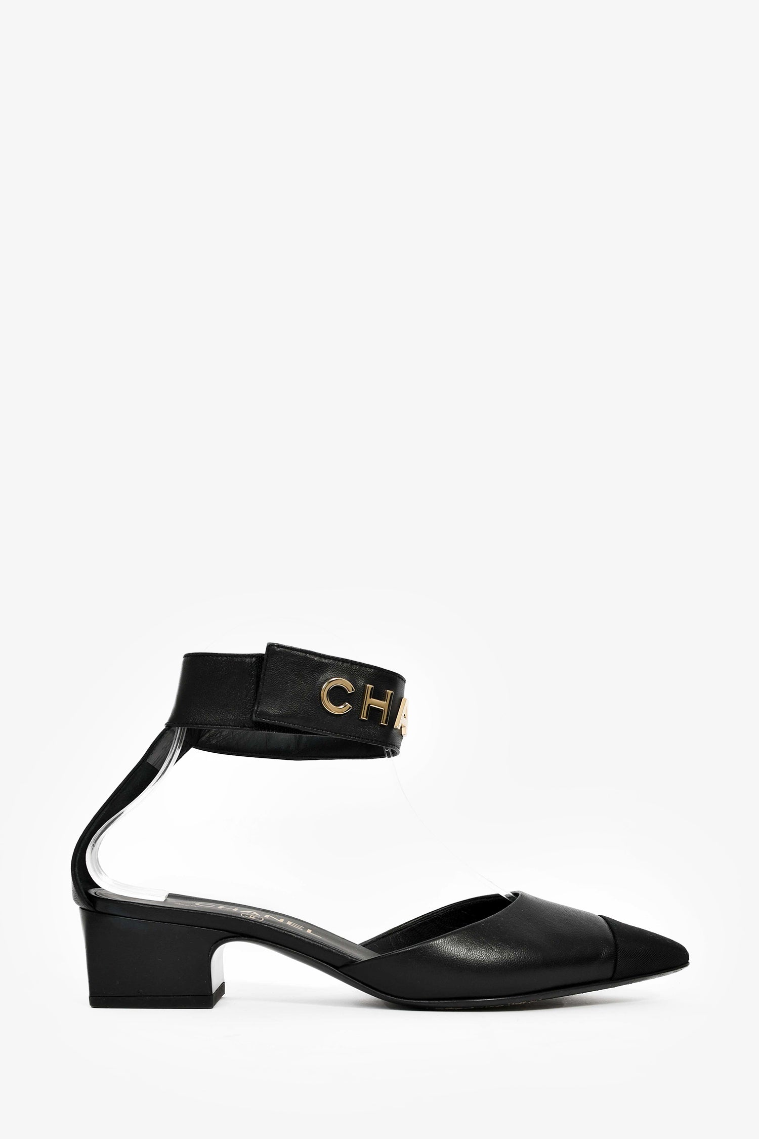 Refresh availabilityPre-Loved Chanel™ Black Leather Logo Ankle Strap D'Orsday Heels. Pointed toe. Block heel. Gold-tone hardware detail on the ankle strap.