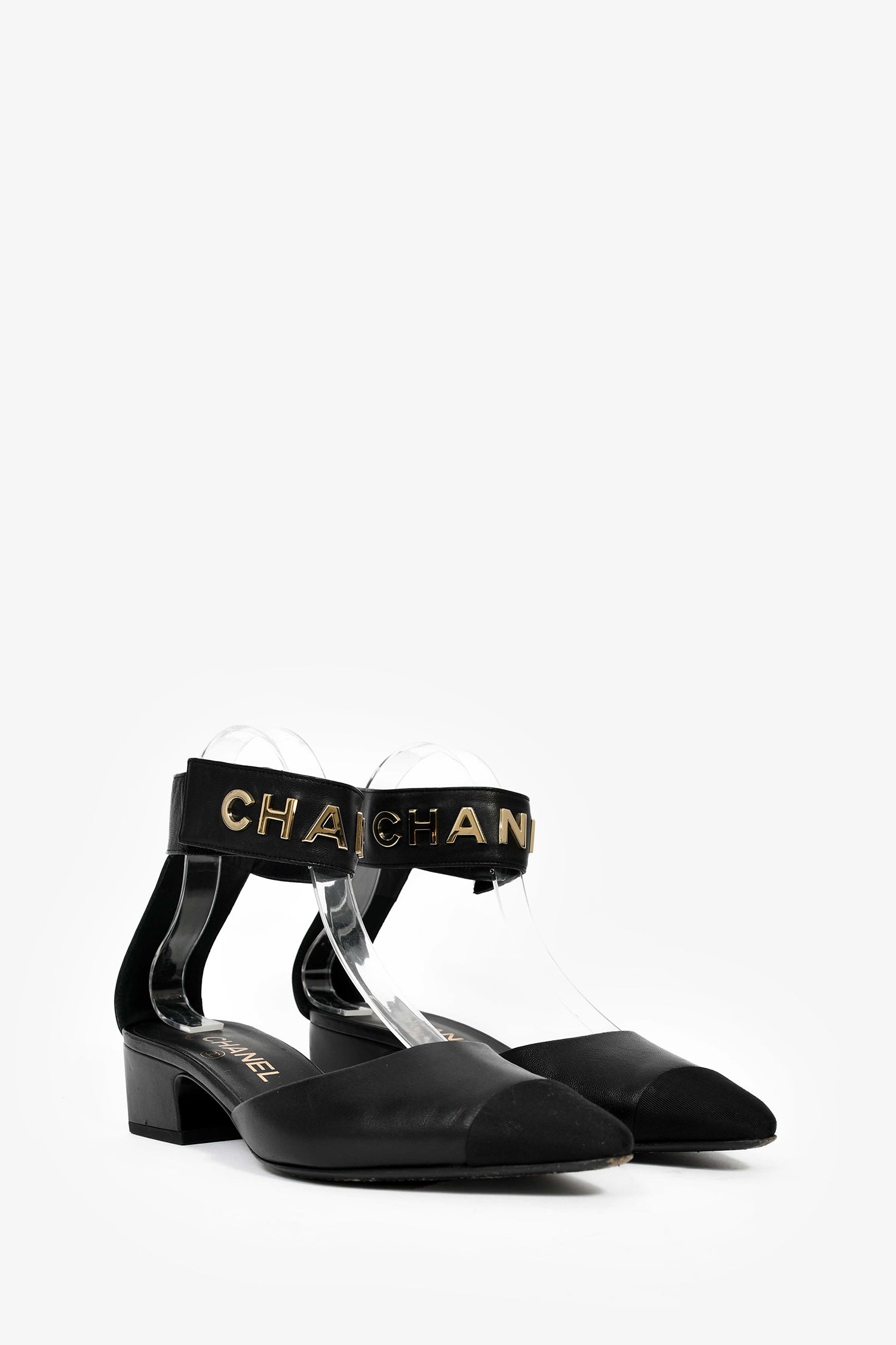 Pre-Loved Chanel™ Black Leather Logo Ankle Strap D'Orsday Heels Size 38.5