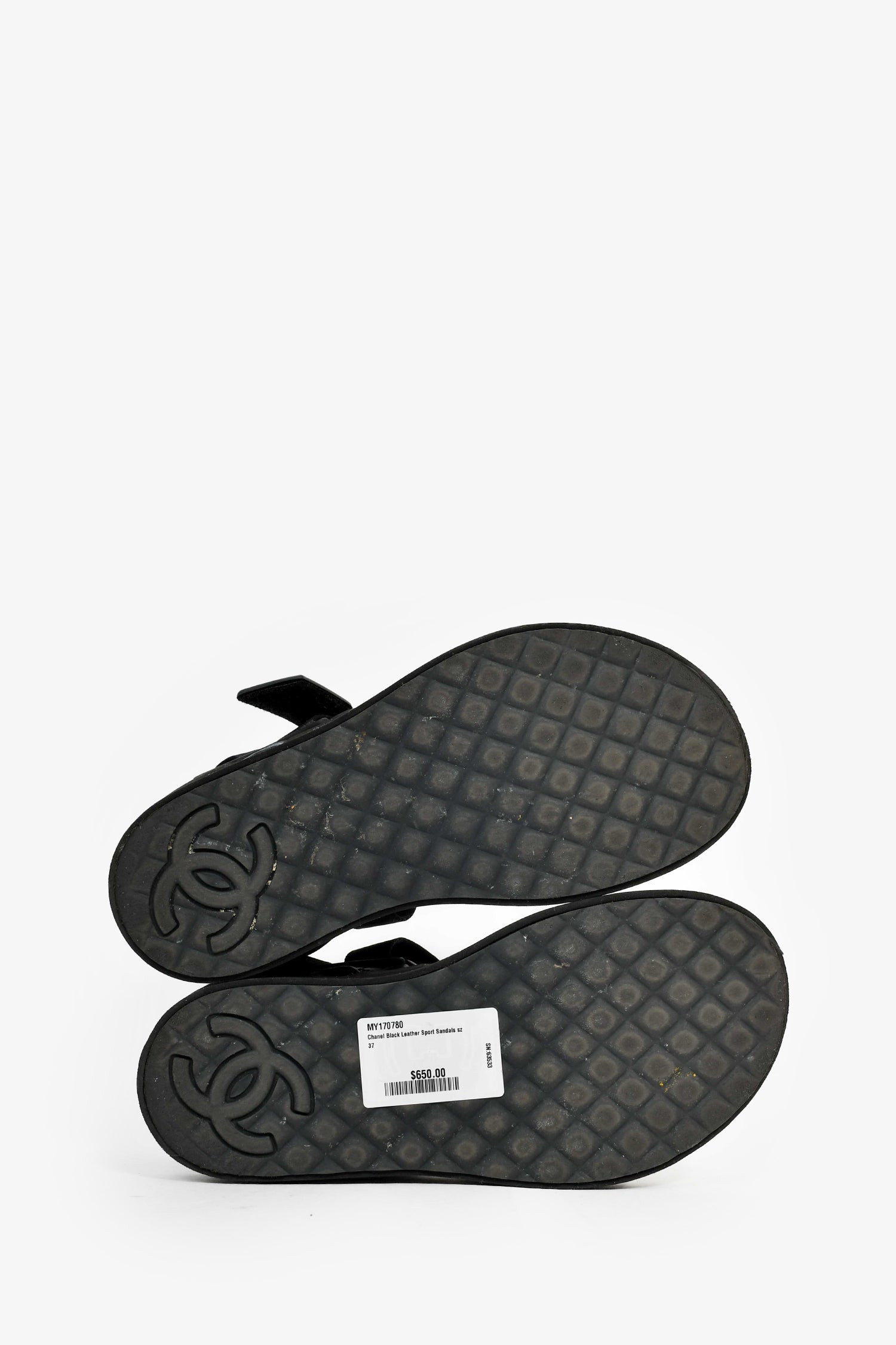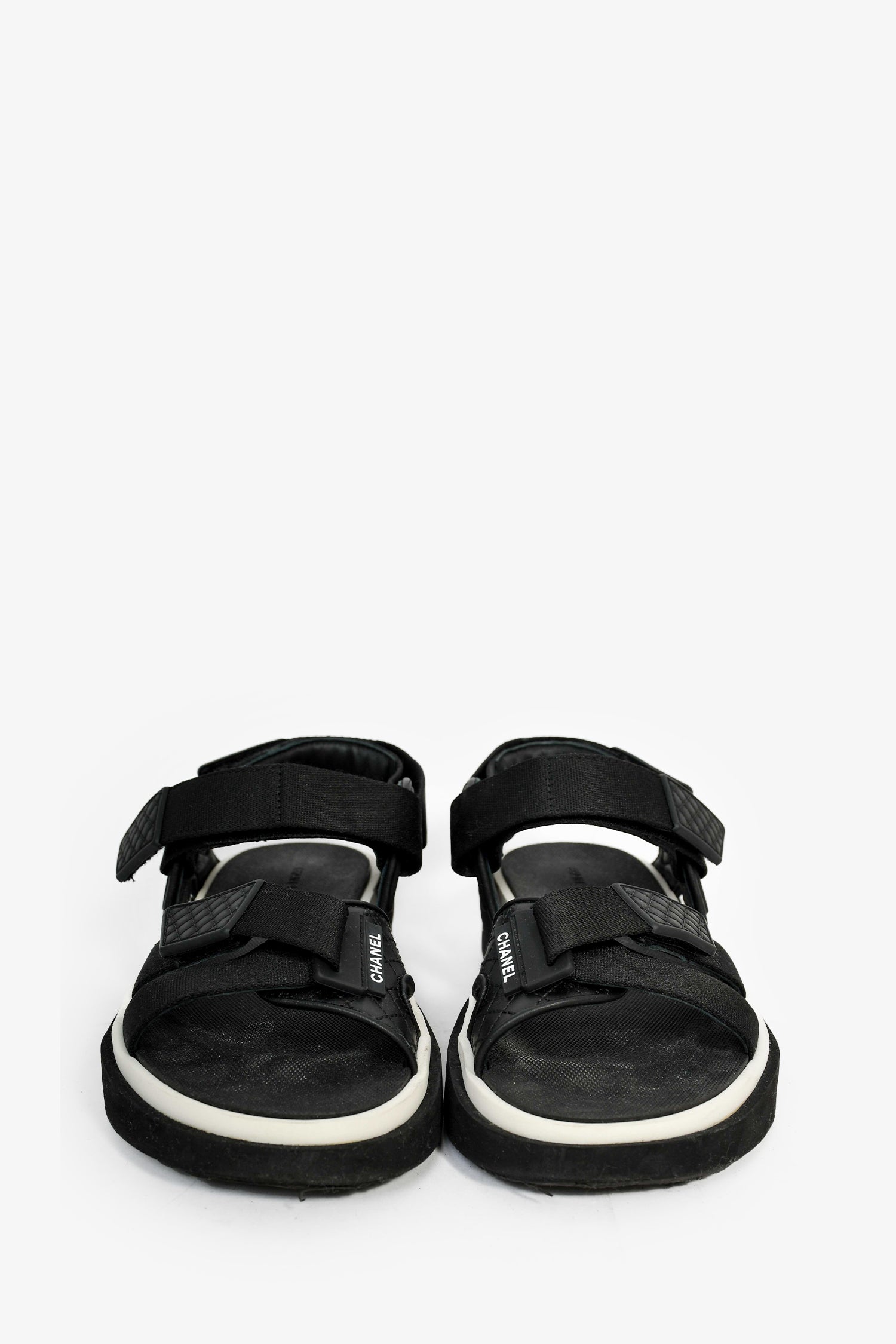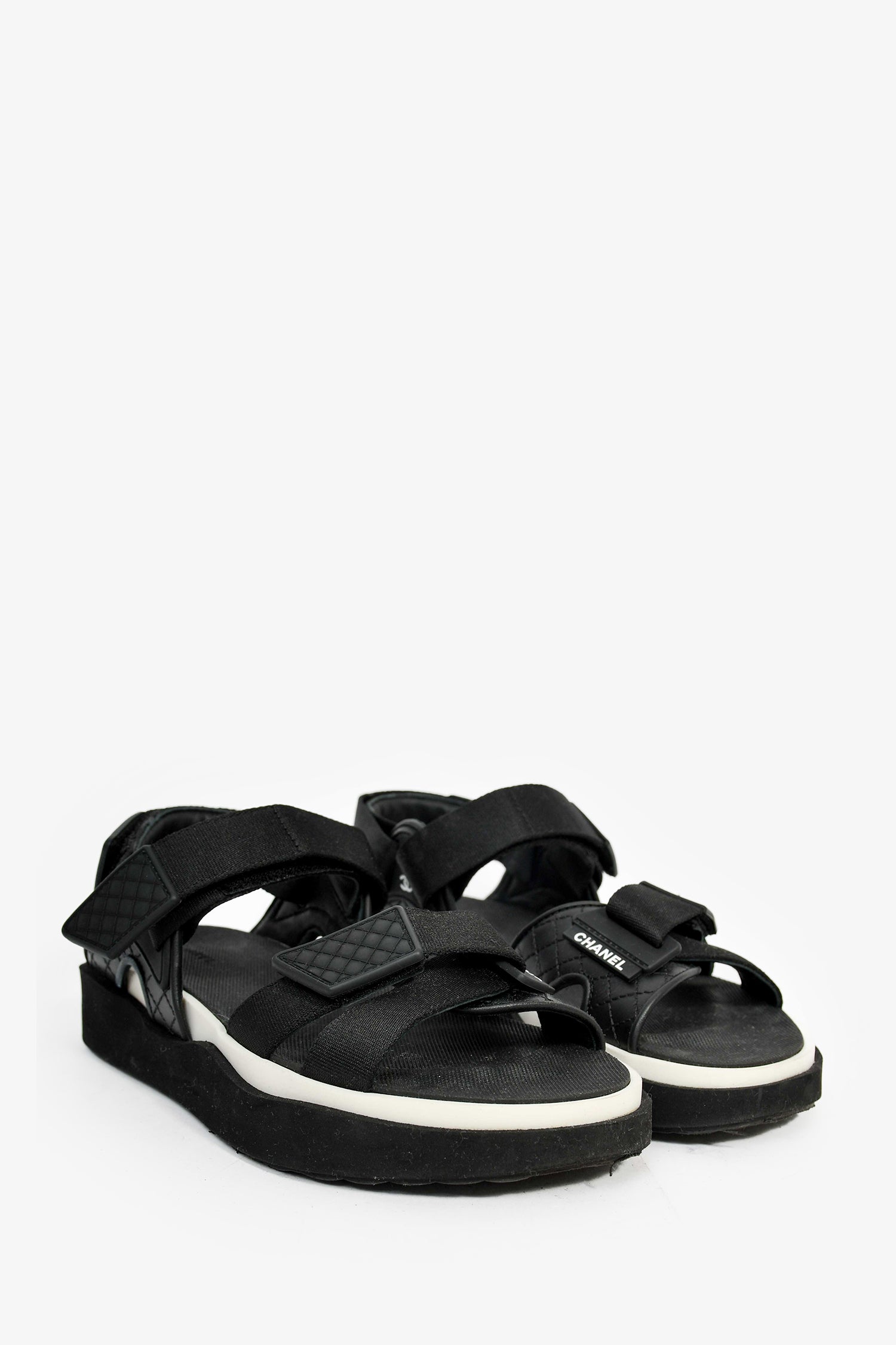 Refresh availabilityPre-Loved Chanel™ Black Leather Sport Sandals. Velcro straps. Rubber insoles. Suede trim and outsoles. Leather trim. Tonal stitching.