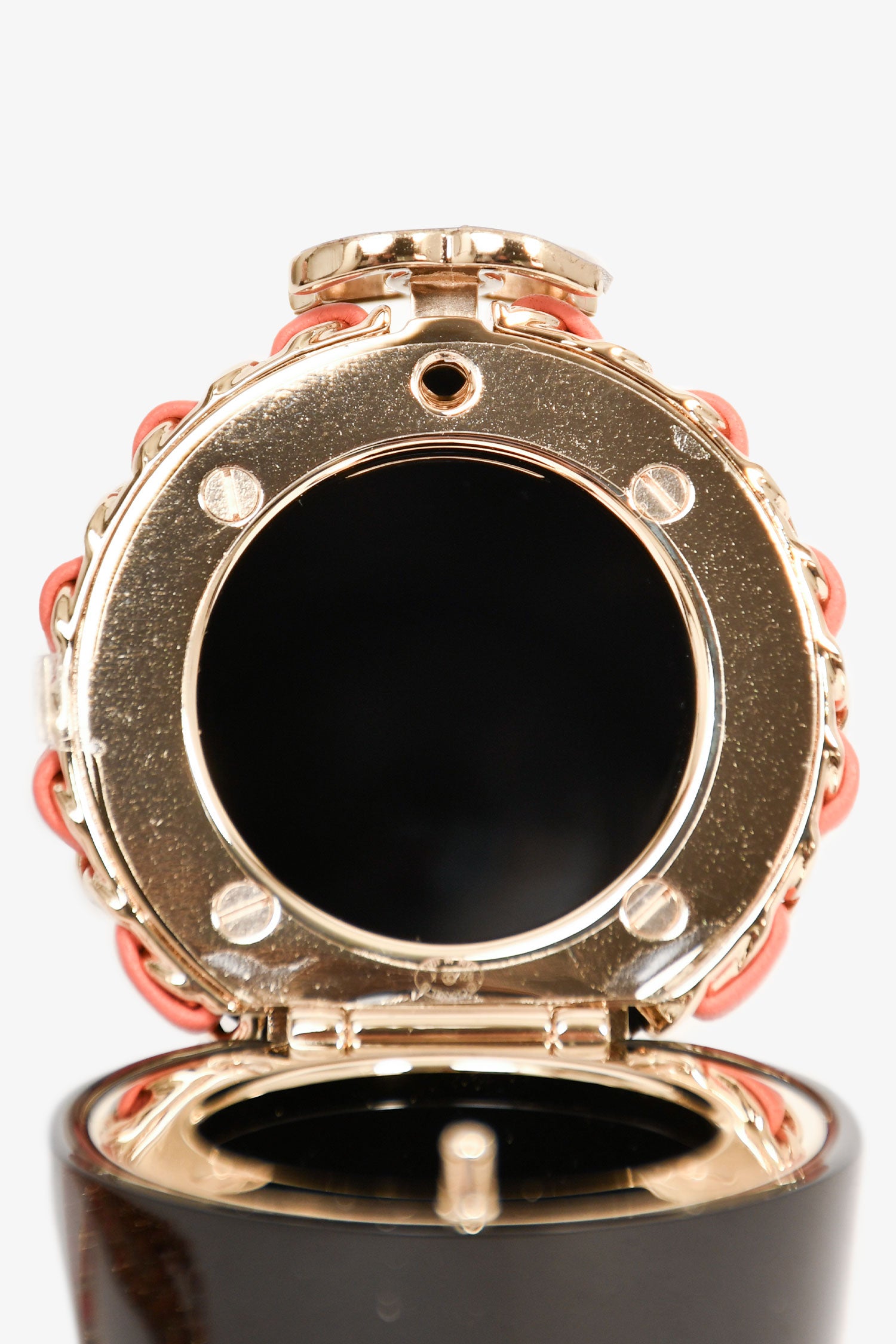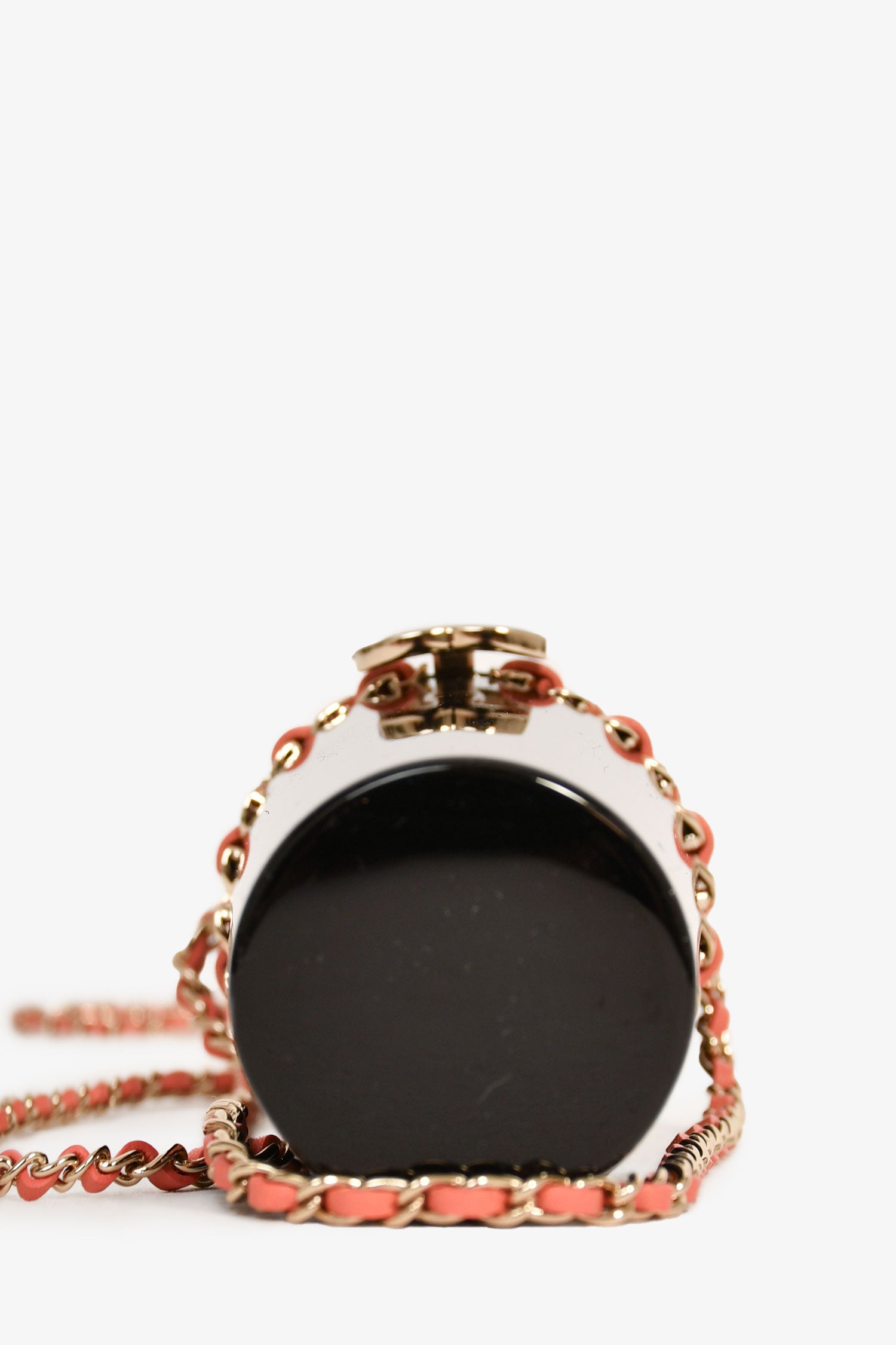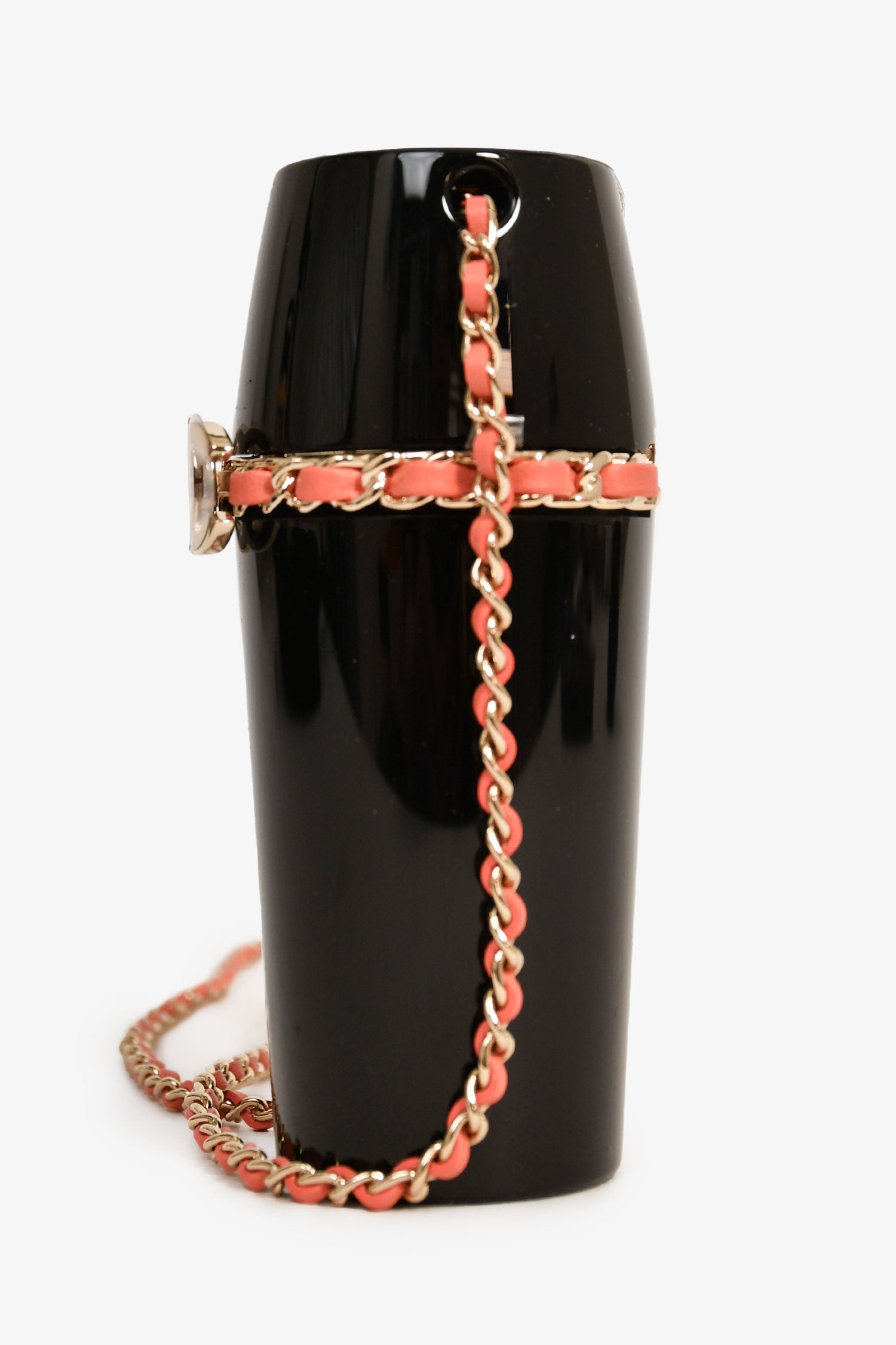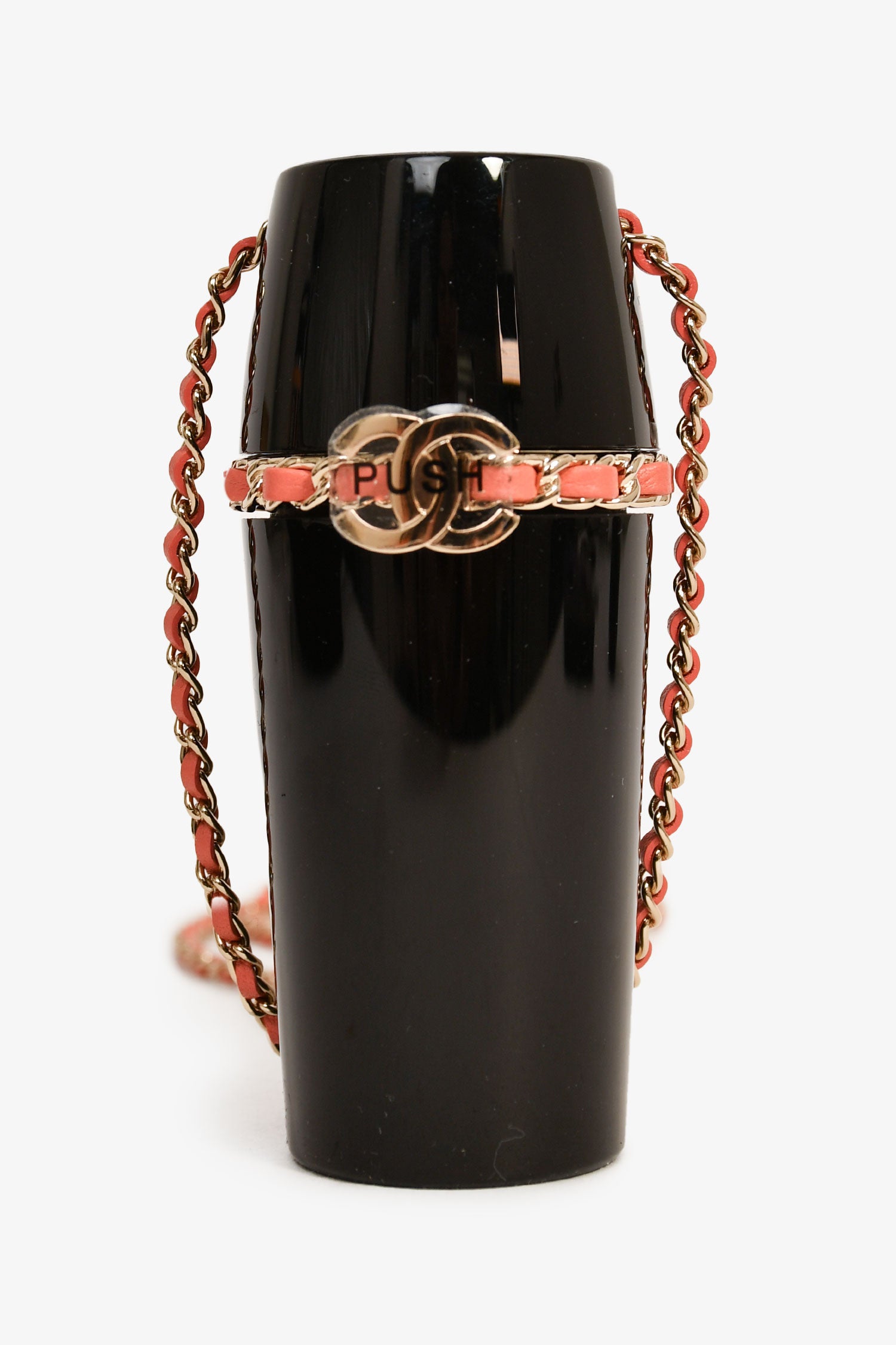Refresh availabilityPre-Loved Chanel™ Black Lucite Leather Pink Chain Trim Lipstick Case Necklace. Flip-cap with a push lock closure. Lucite exterior. Gold-tone hardware.