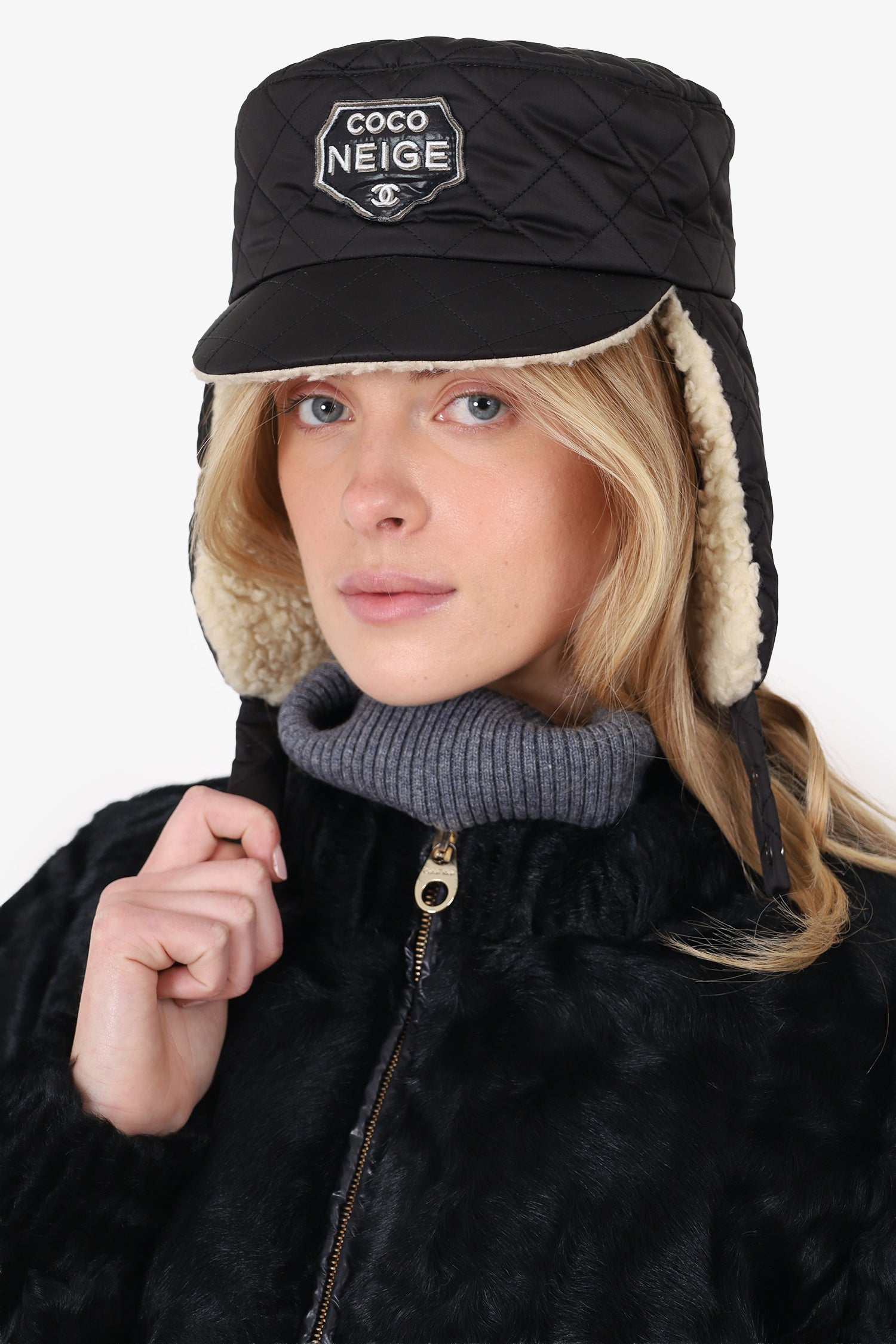 Refresh availabilityPre-Loved Chanel™ Black Quilted Trapper 'Coco Neige' Hat With Cream Shearling. Adjustable chin strap with snap-button-up closure. Shearling-lined interior. Palladium-tone hardware. Contrast and tonal stitching.