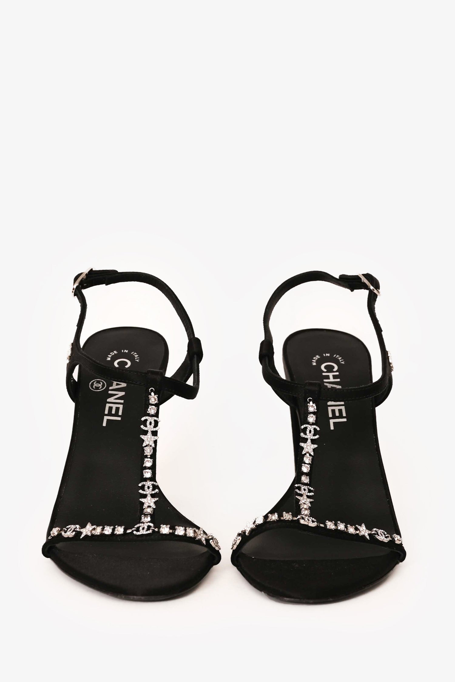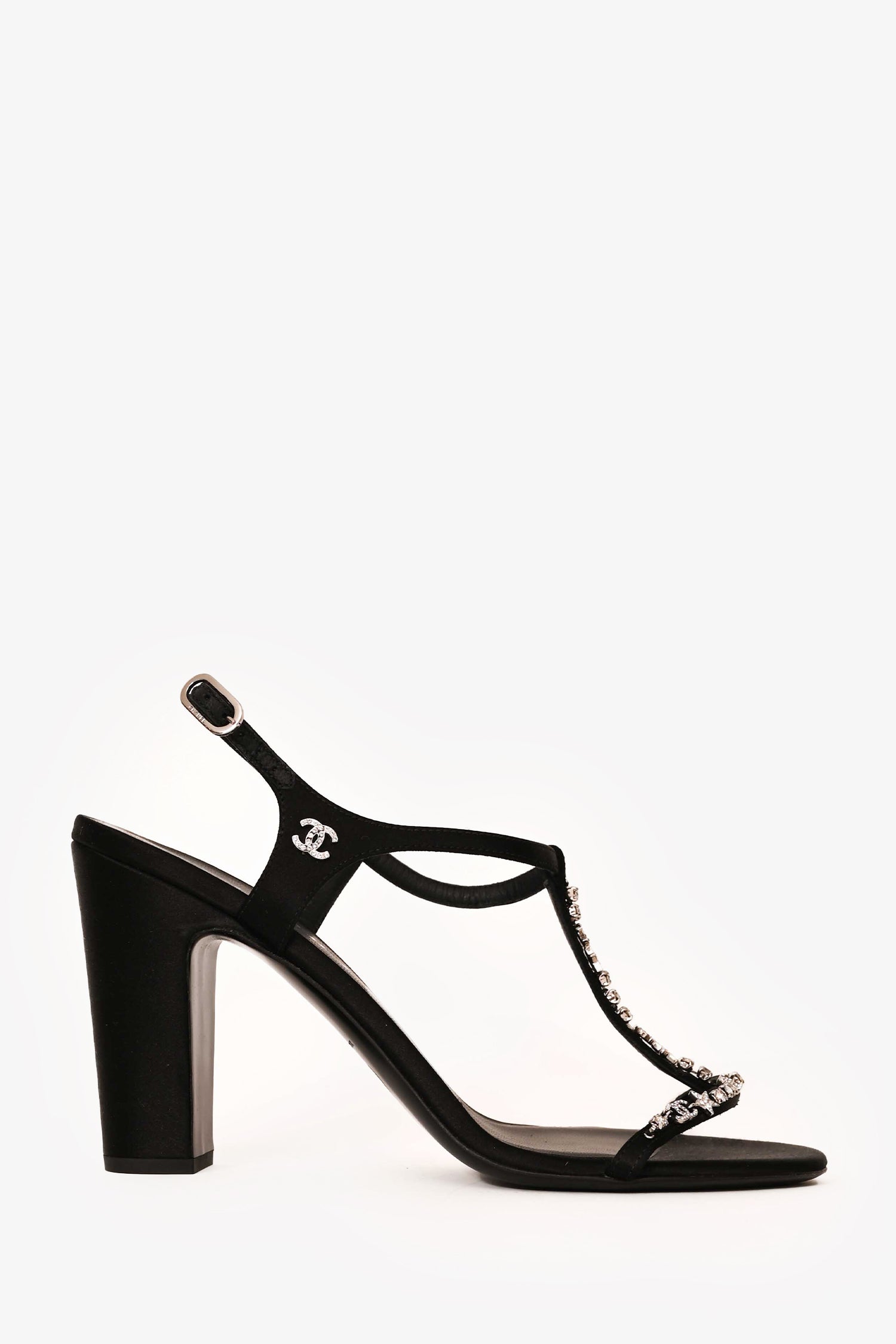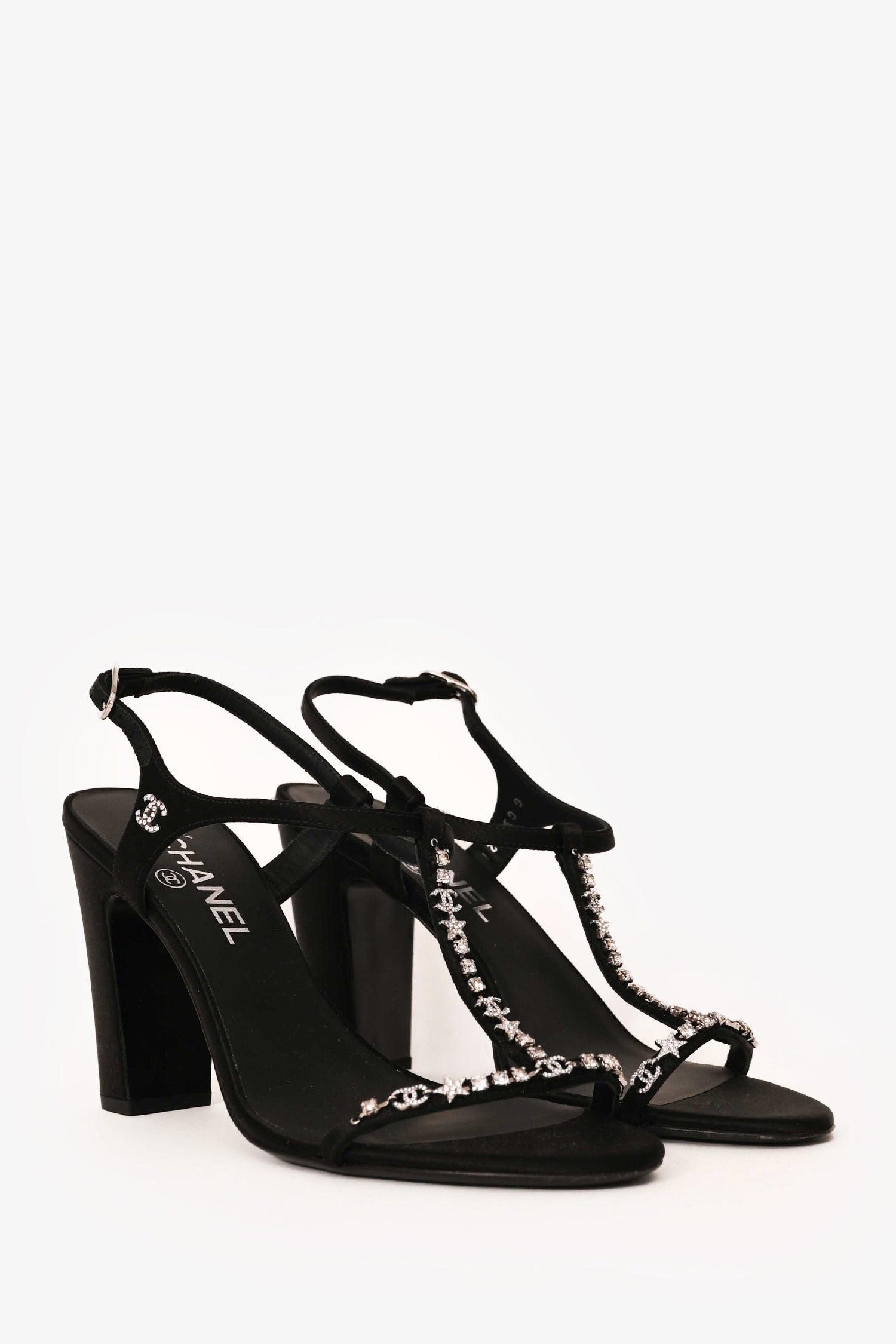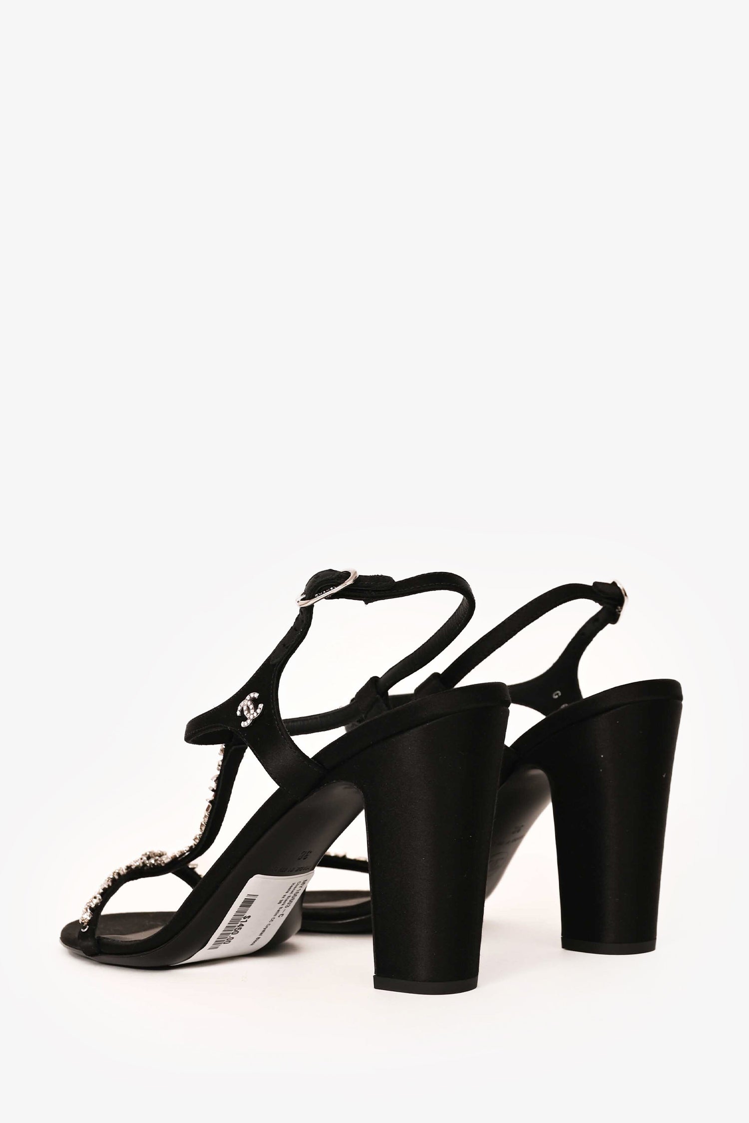 Refresh availabilityPre-Loved Chanel™ Black Satin CC Crystal Block Heels. Rounded almond toe. Leather insole. Covered satin exterior. Crystal charms. Tonal stitching.