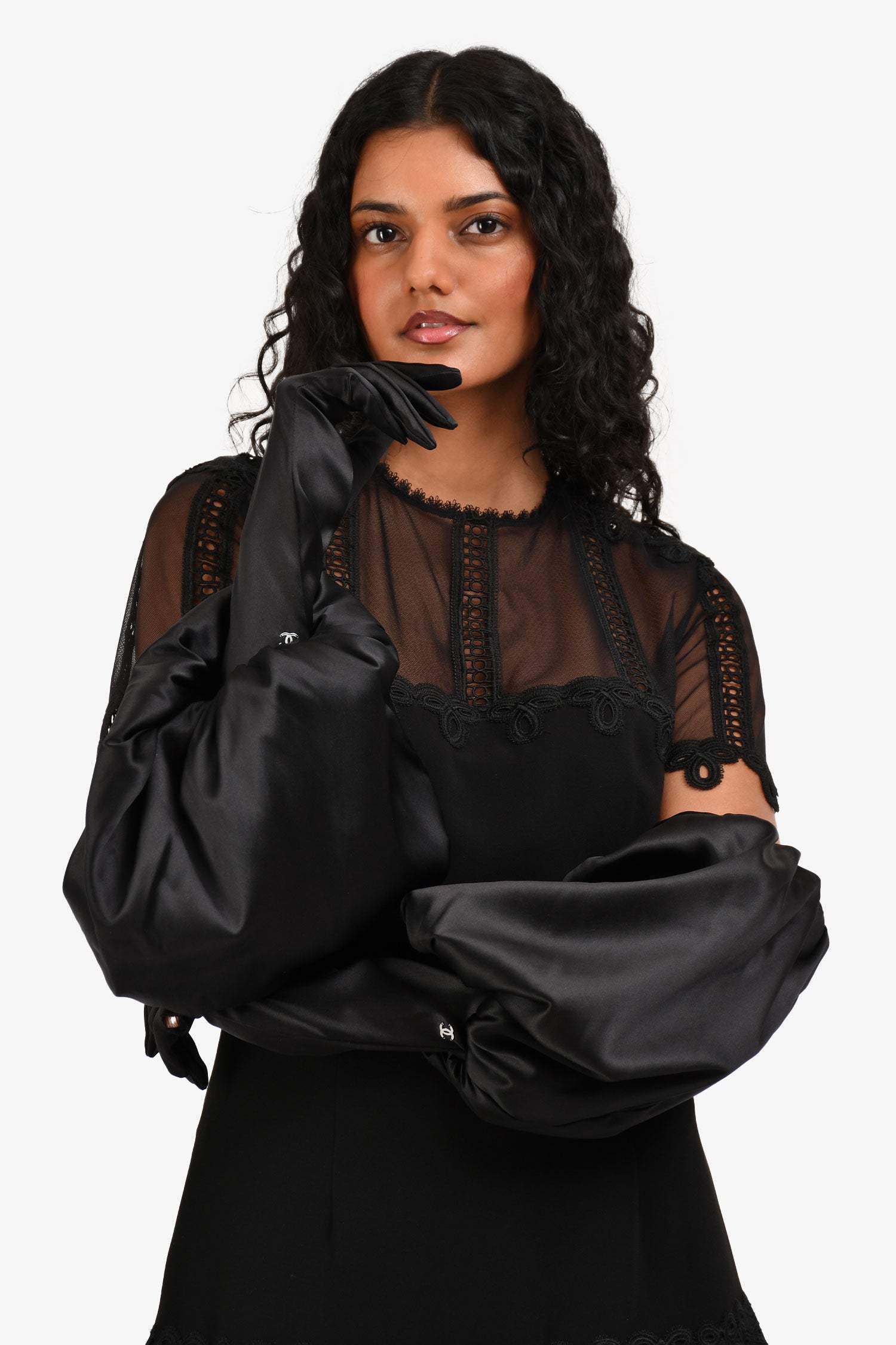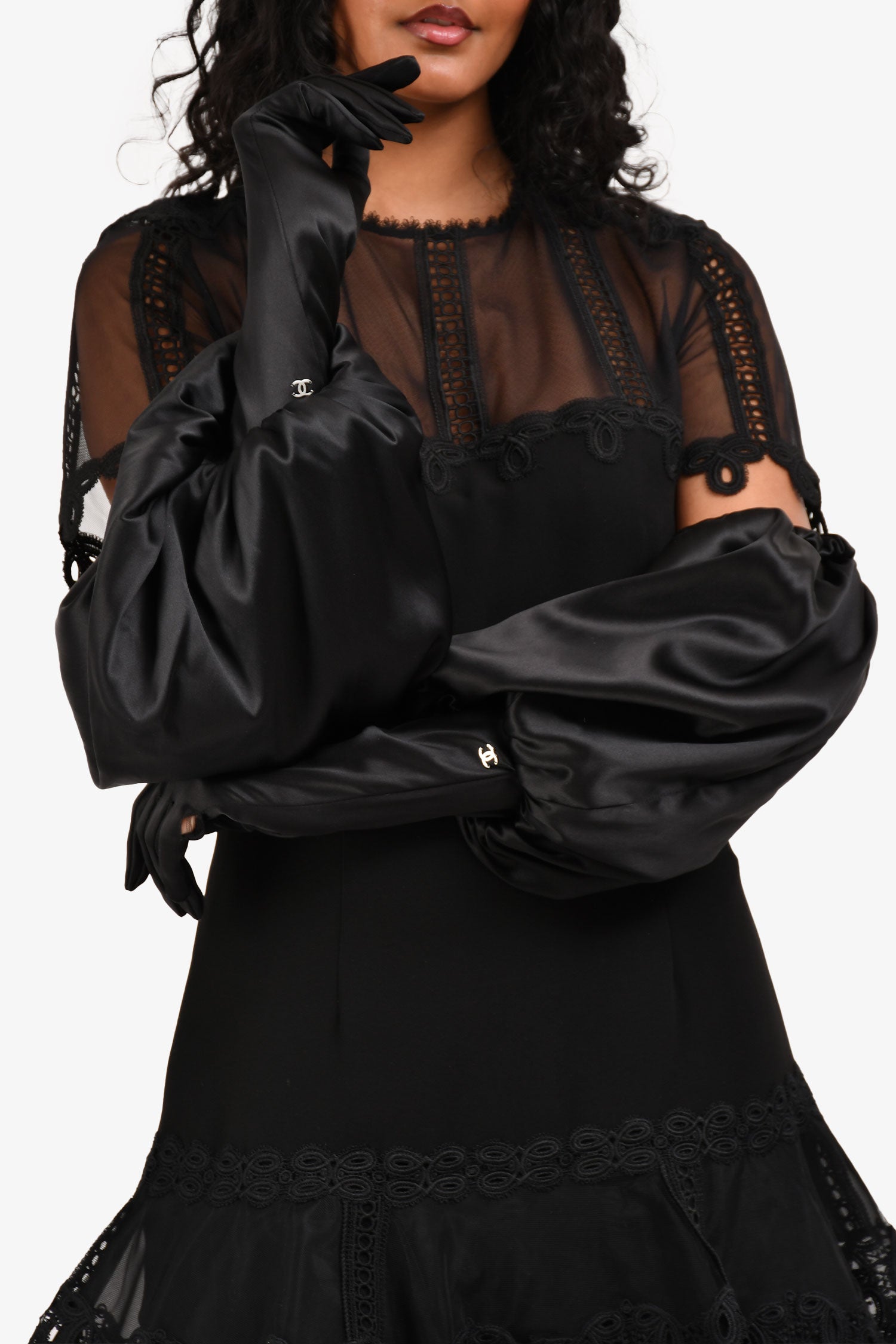 Refresh availabilityPre-Loved Chanel™ Black Silk Blend Logo Puff Sleeve Gloves. Pull-on. Puffy style on the sleeves. Elasticized hem. Tonal stitching.
