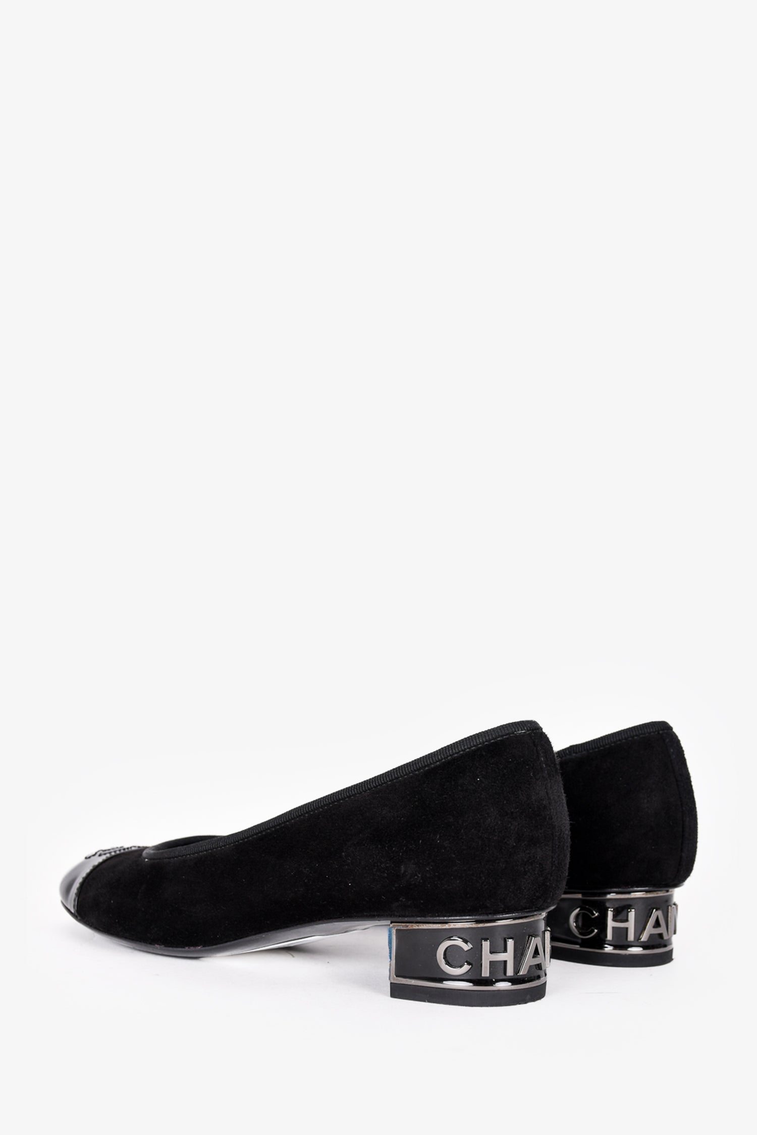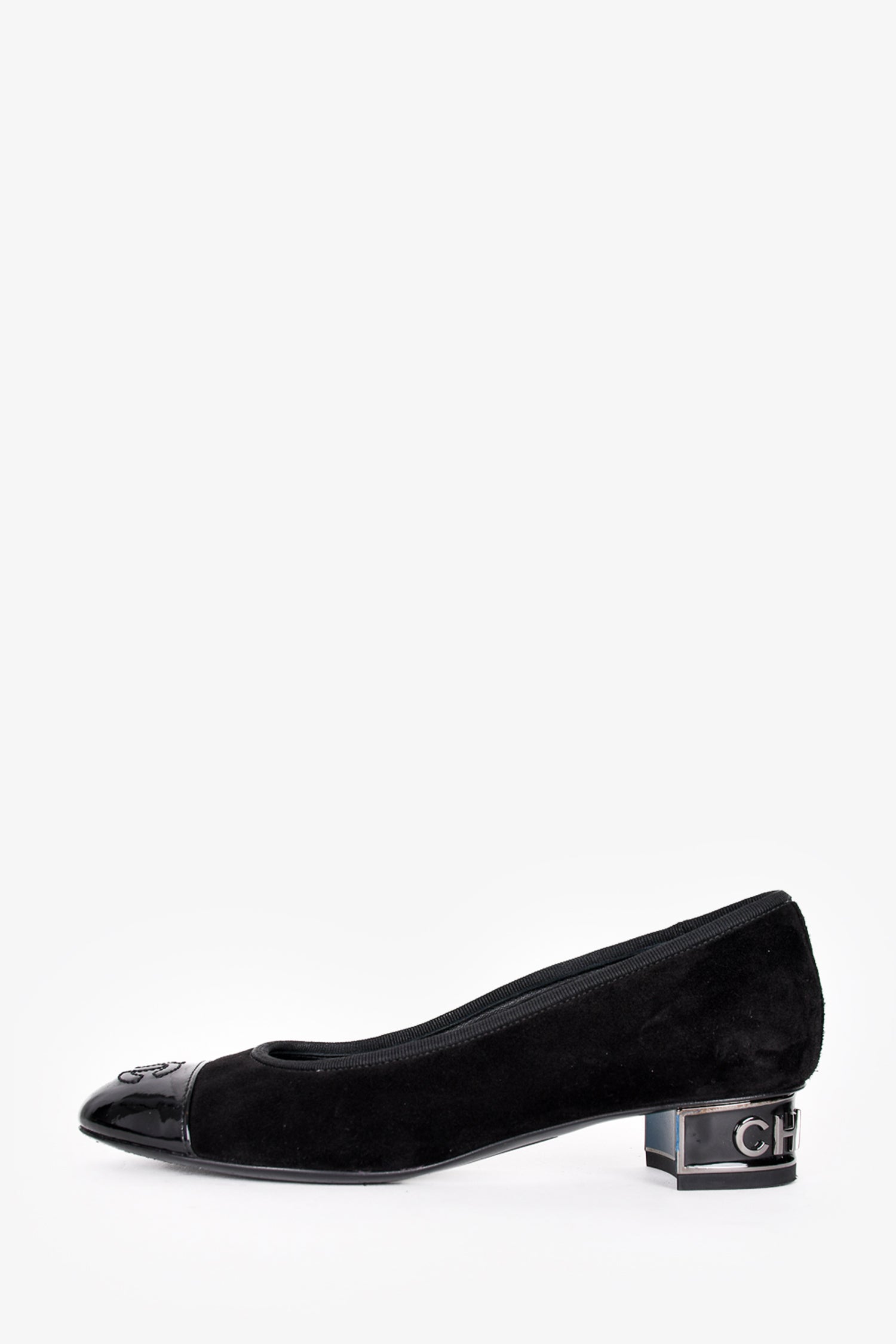 Refresh availabilityPre-Loved Chanel™ Black Suede/Patent CC Cap Toe Logo Block Heels. Slip-on. Round toe.