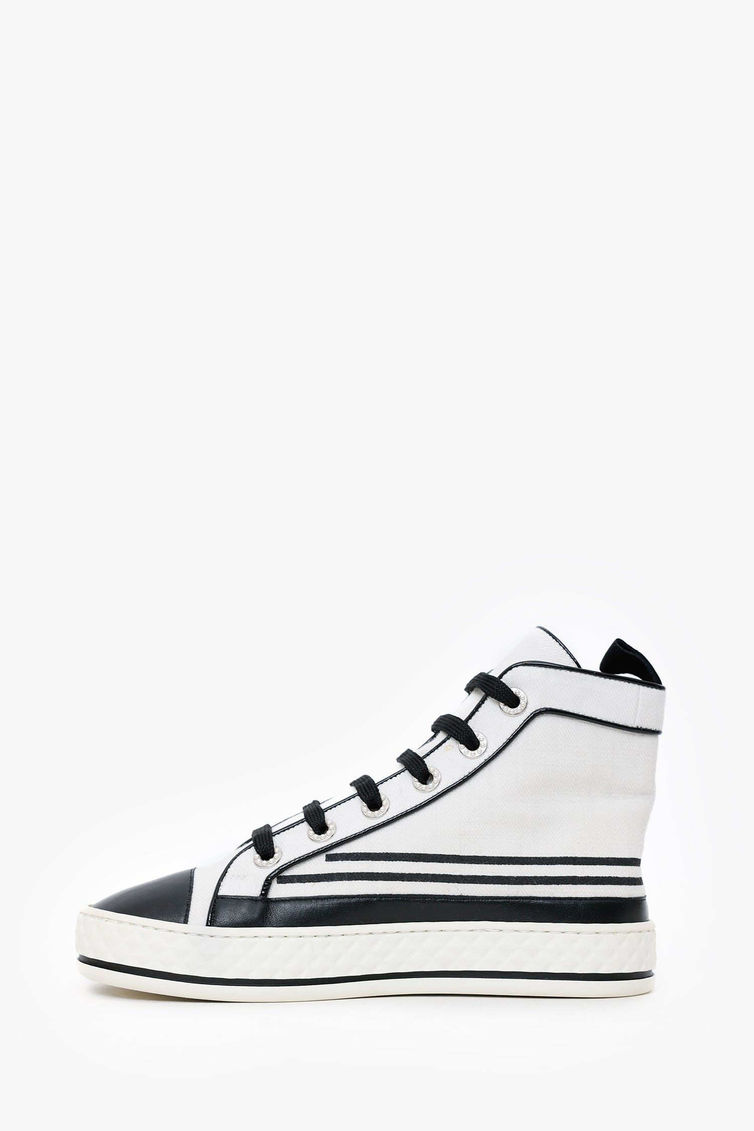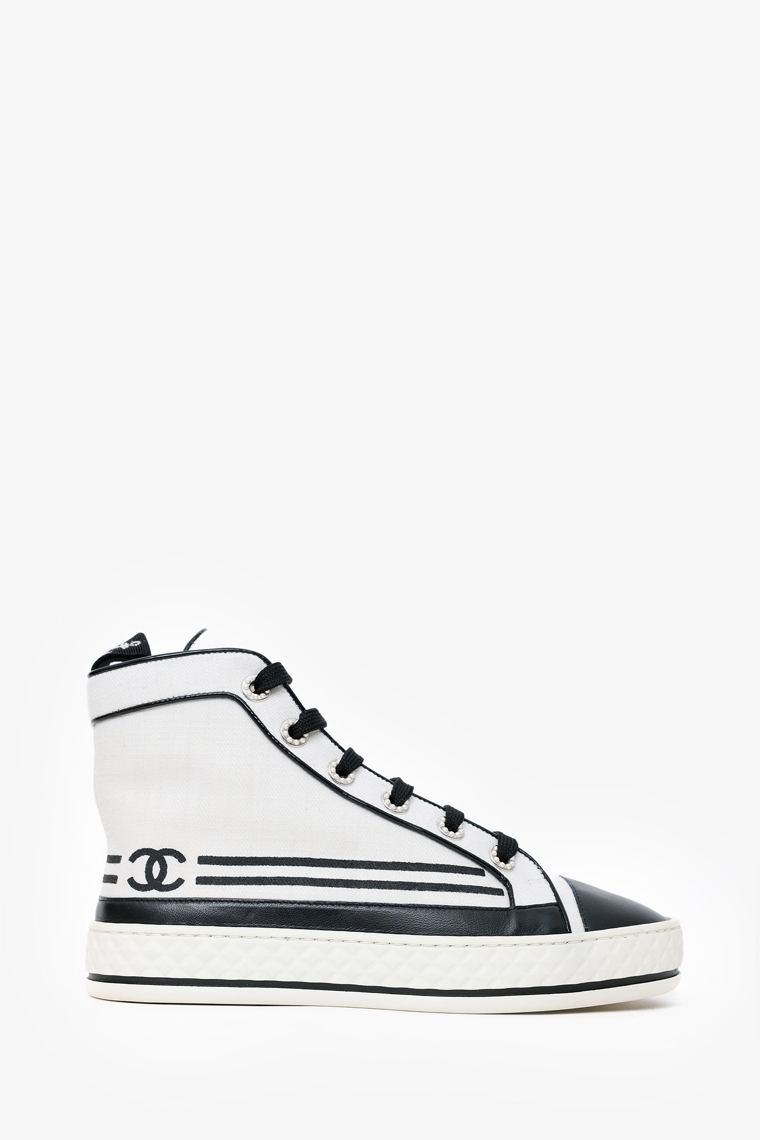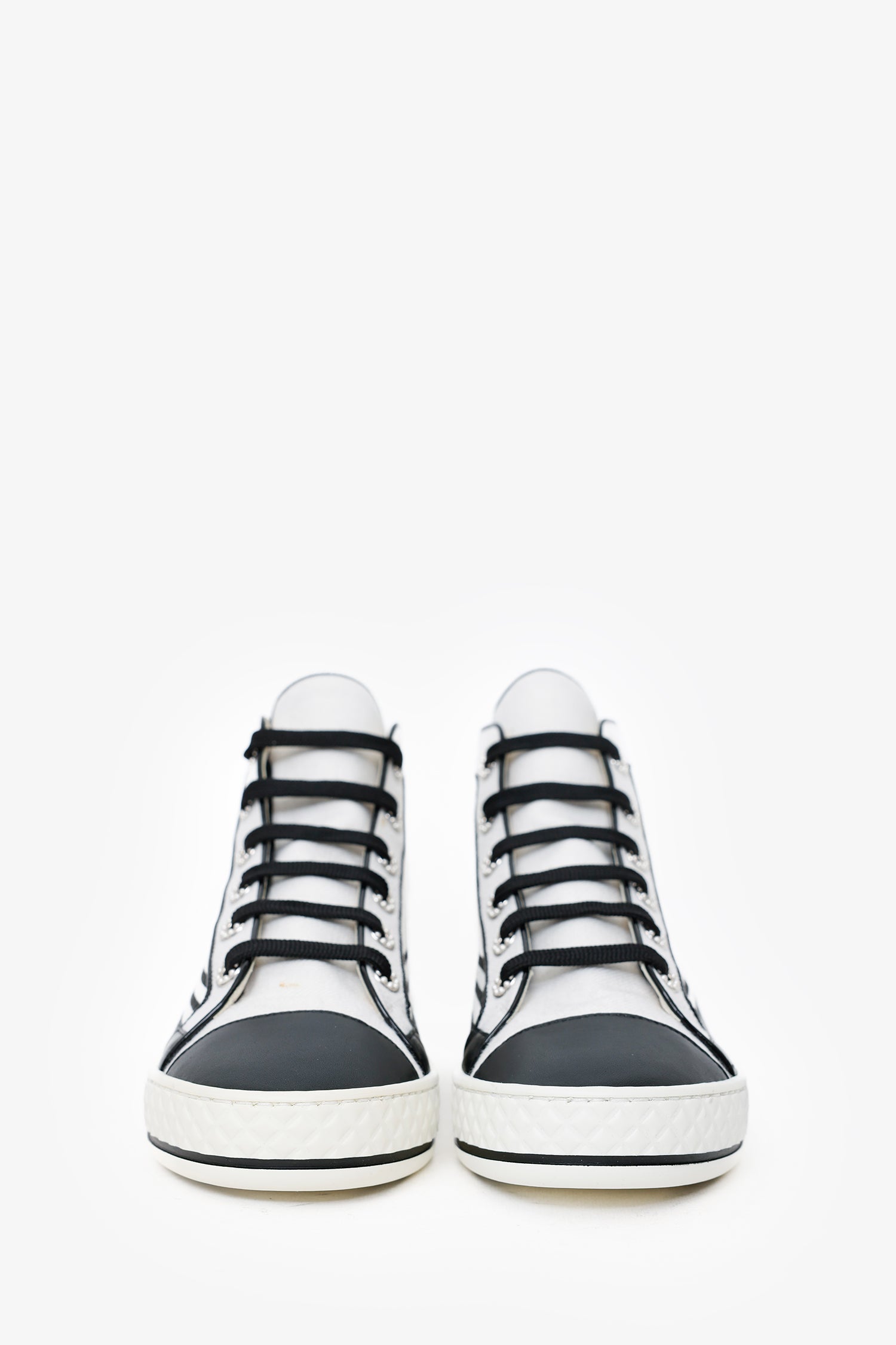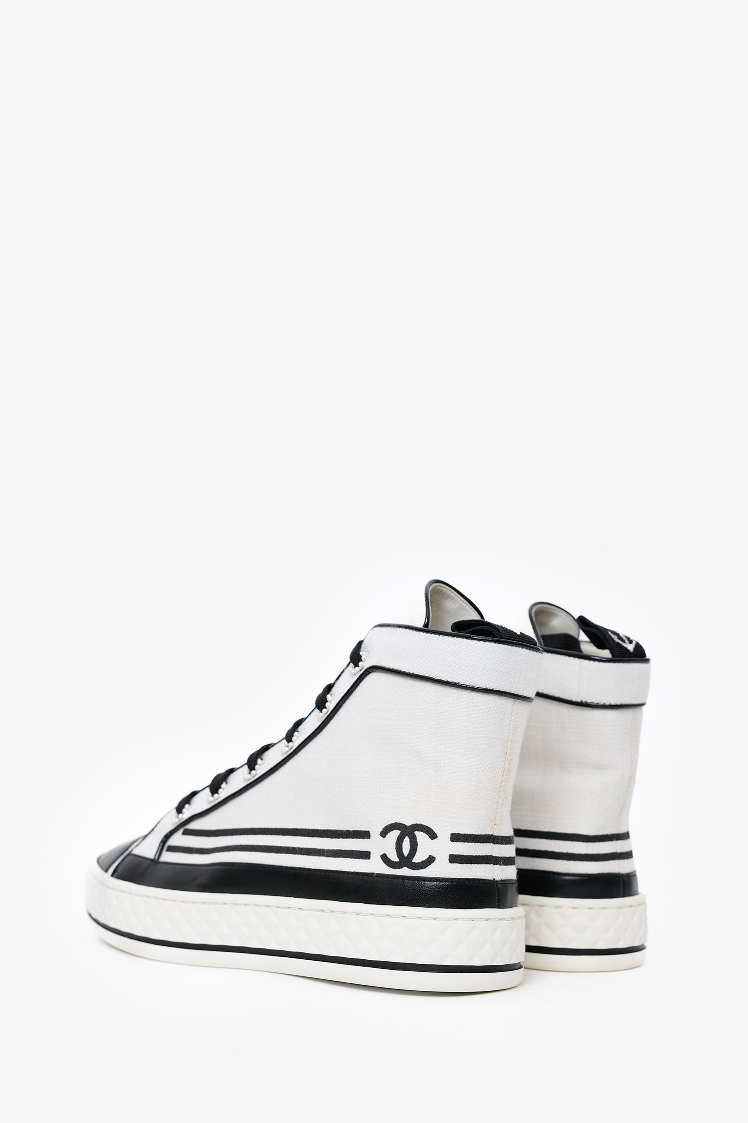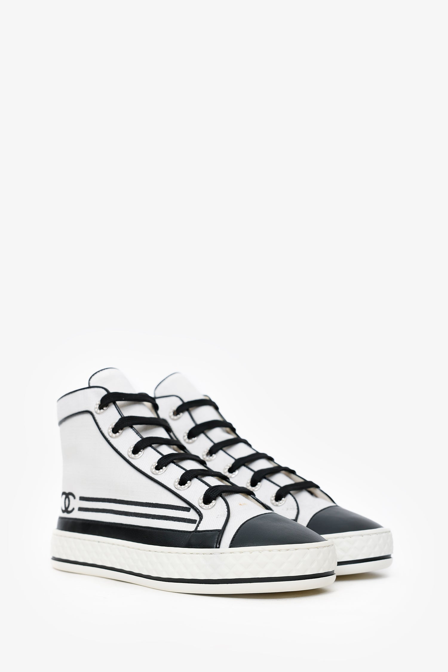 Refresh availabilityPre-Loved Chanel™ Black/White High Top Sneakers. Round toe. Front lace-up closure. Silver-tone hardware. Tonal stitching.