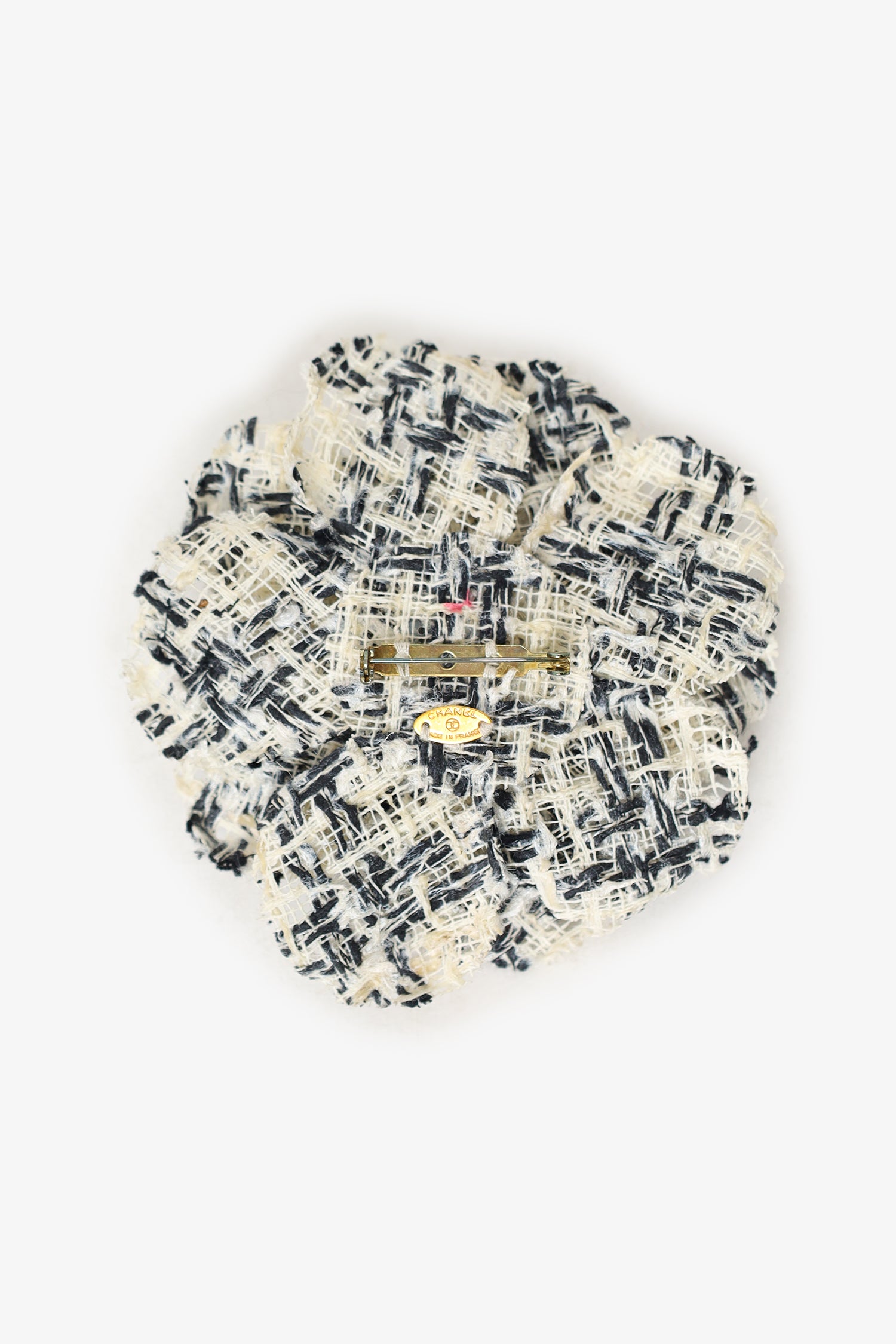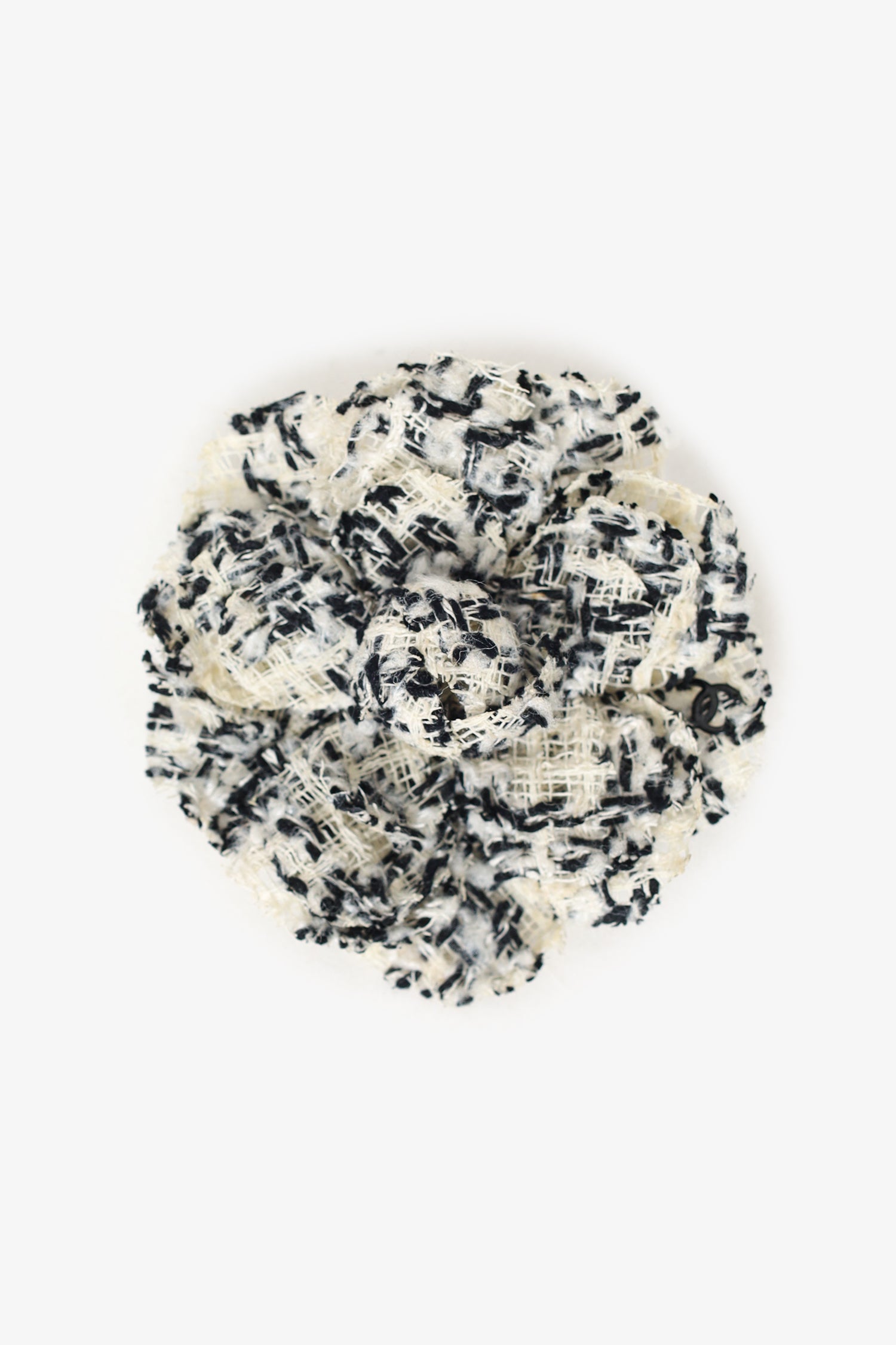 Refresh availabilityPre-Loved Chanel™ Black/White Tweed Camellia Flower Brooch. Rear pin closure. Tonal stitching.