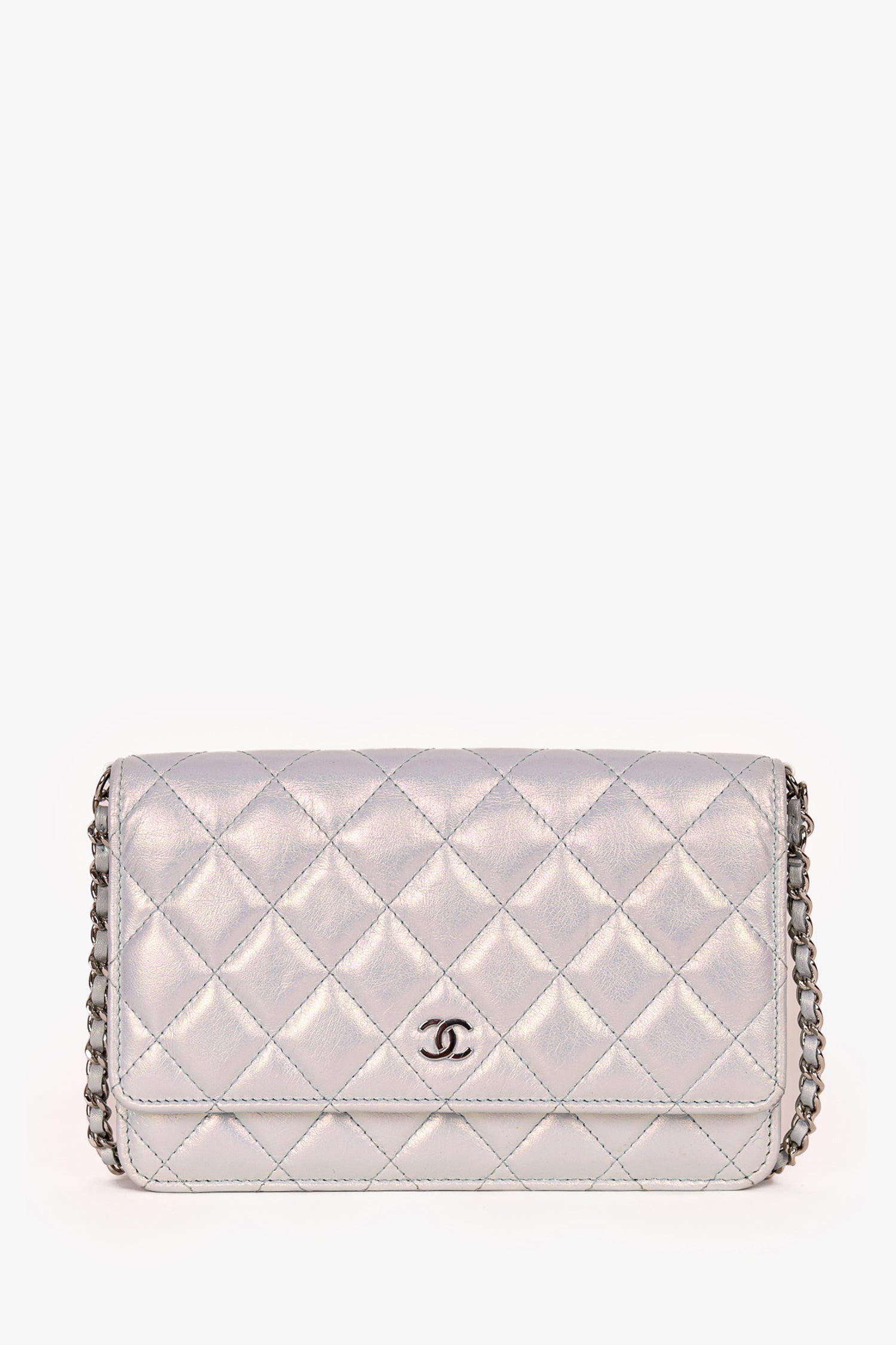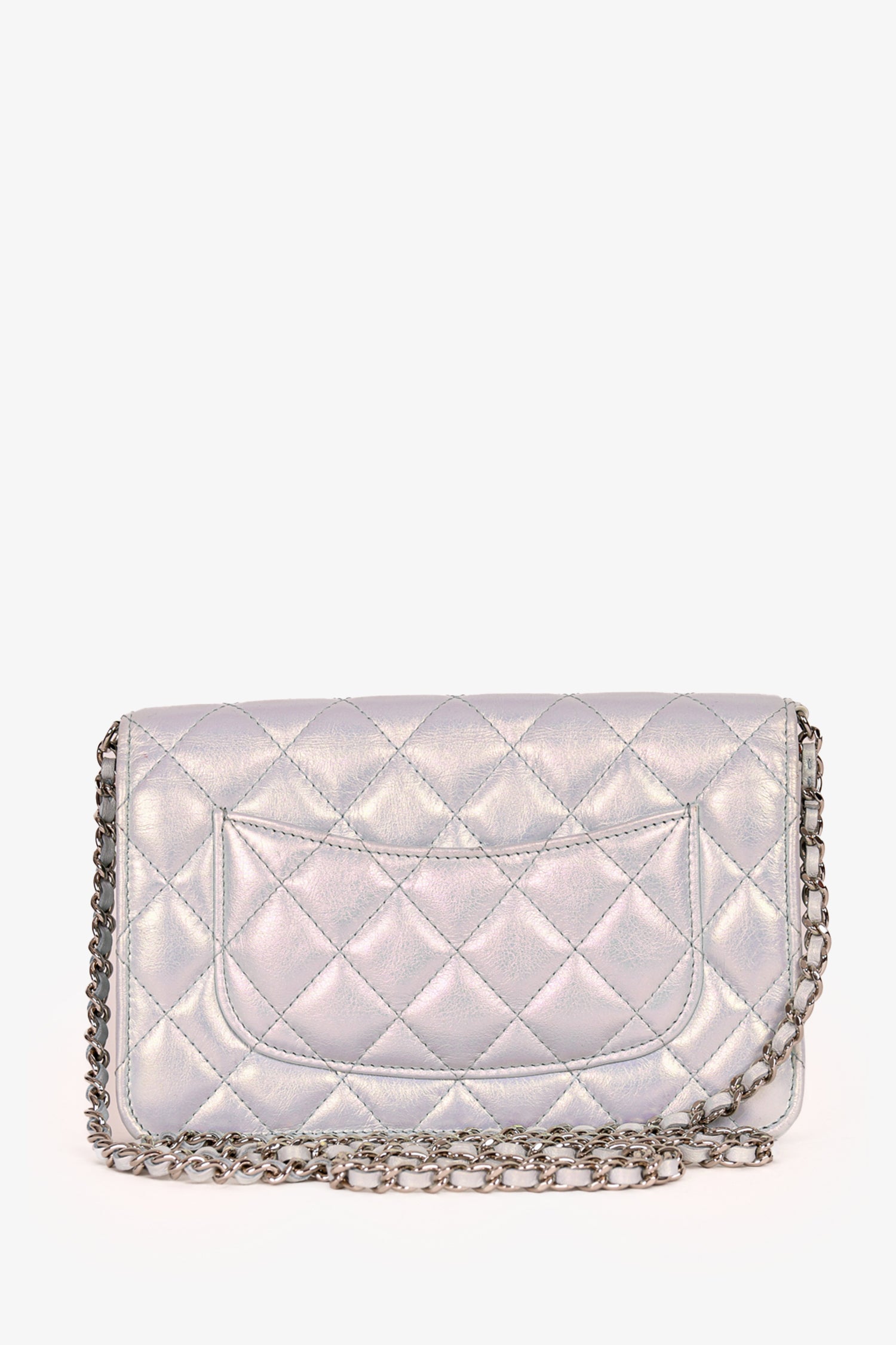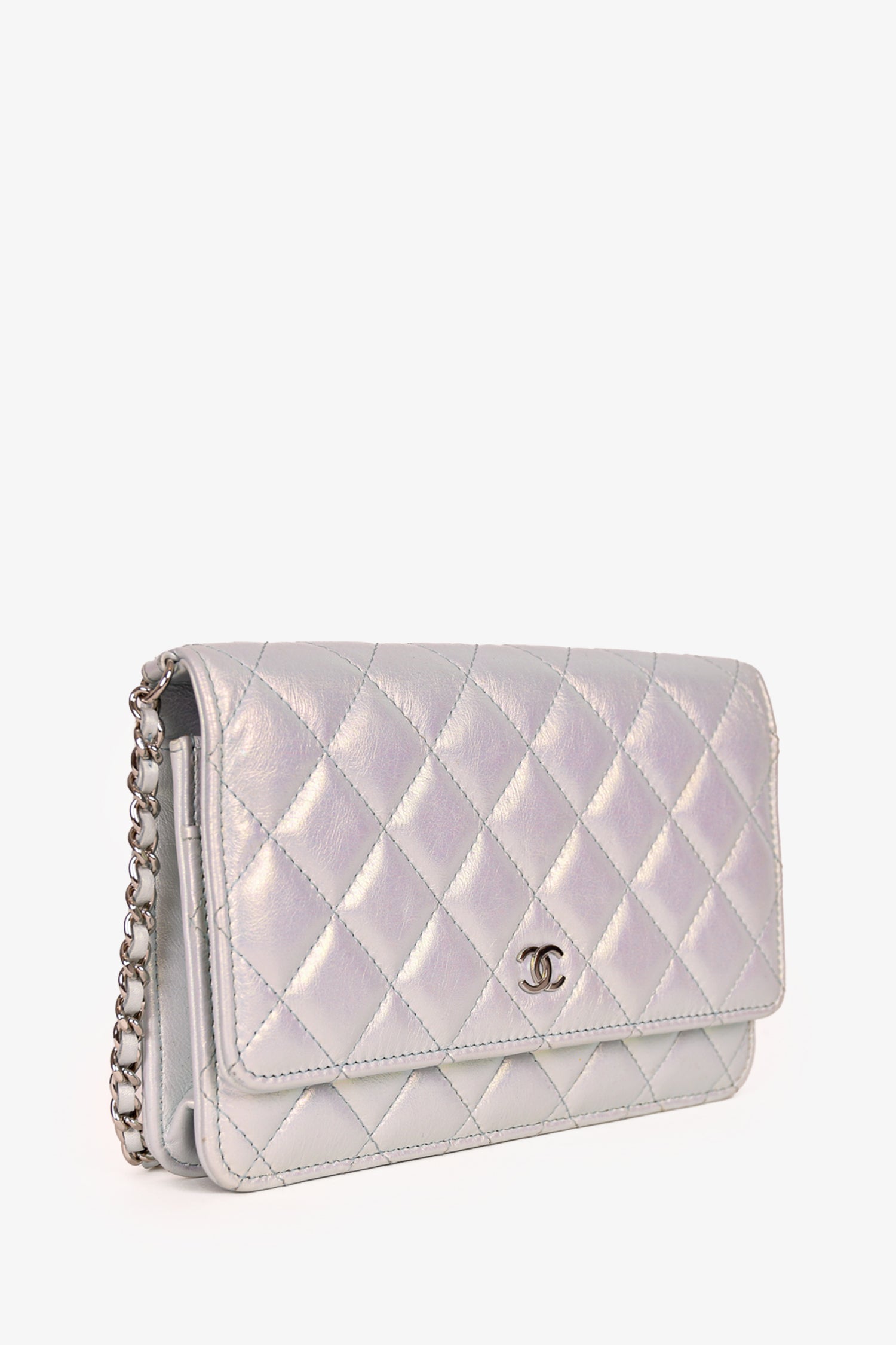 Refresh availabilityPre-Loved Chanel™ Blue Iridescent Quilted Wallet On Chain. Front fold-over flap with magnetic button closure. Front slip pocket. Exterior rear slip pocket. 6 card slots. 1 billfold compartment. 1 zippered compartment. Zip pocket at the interior of the front flap. Silver-tone hardware.