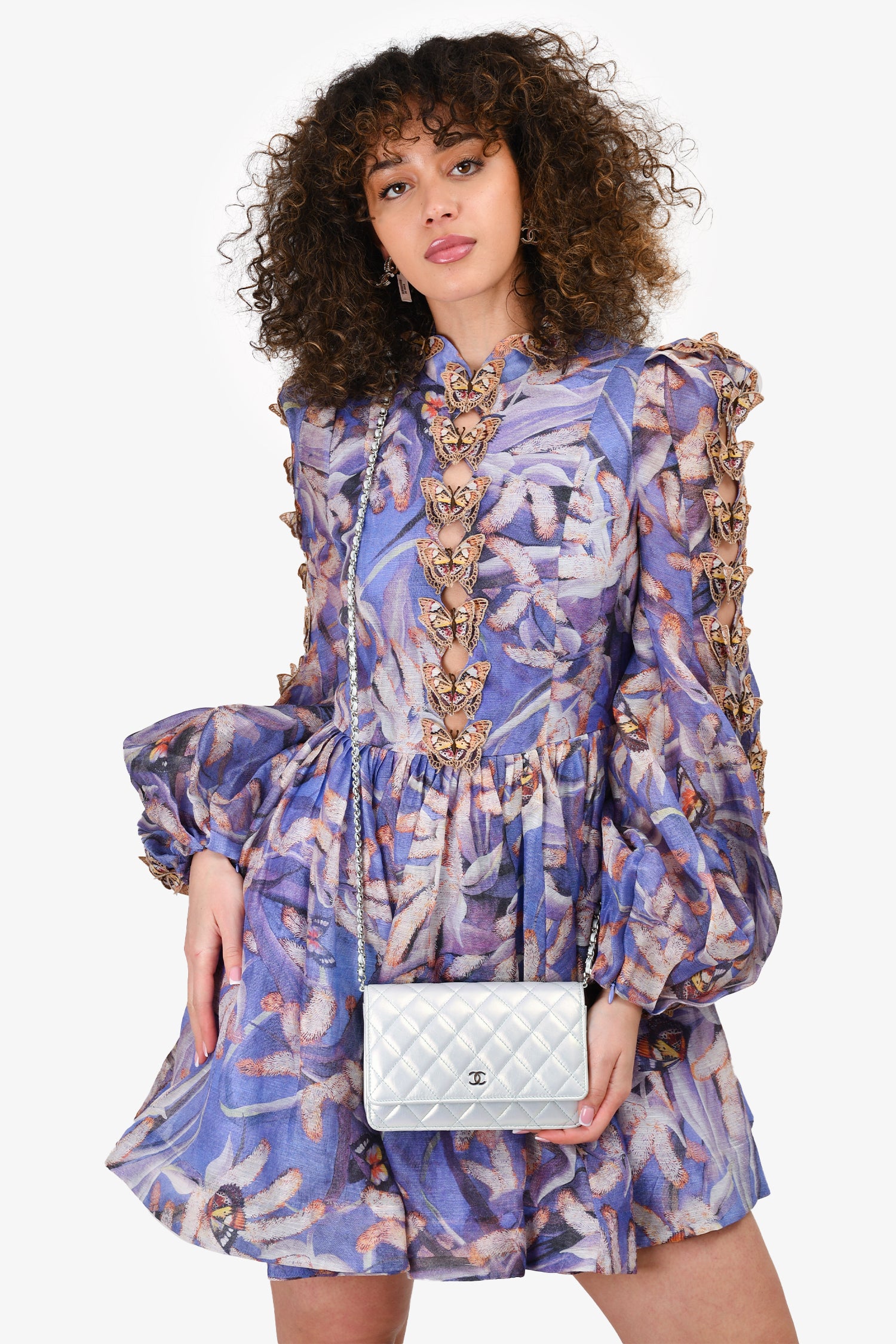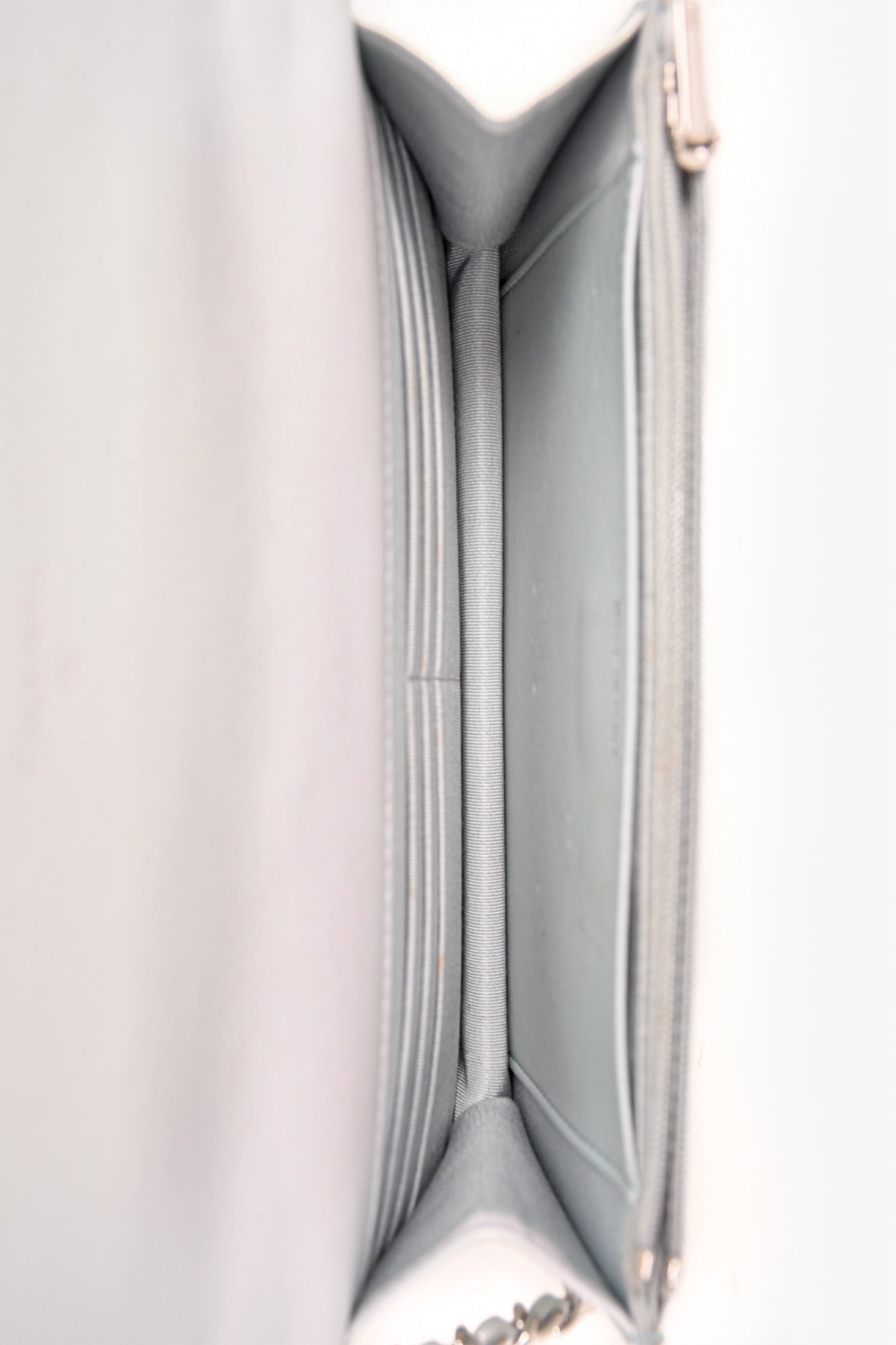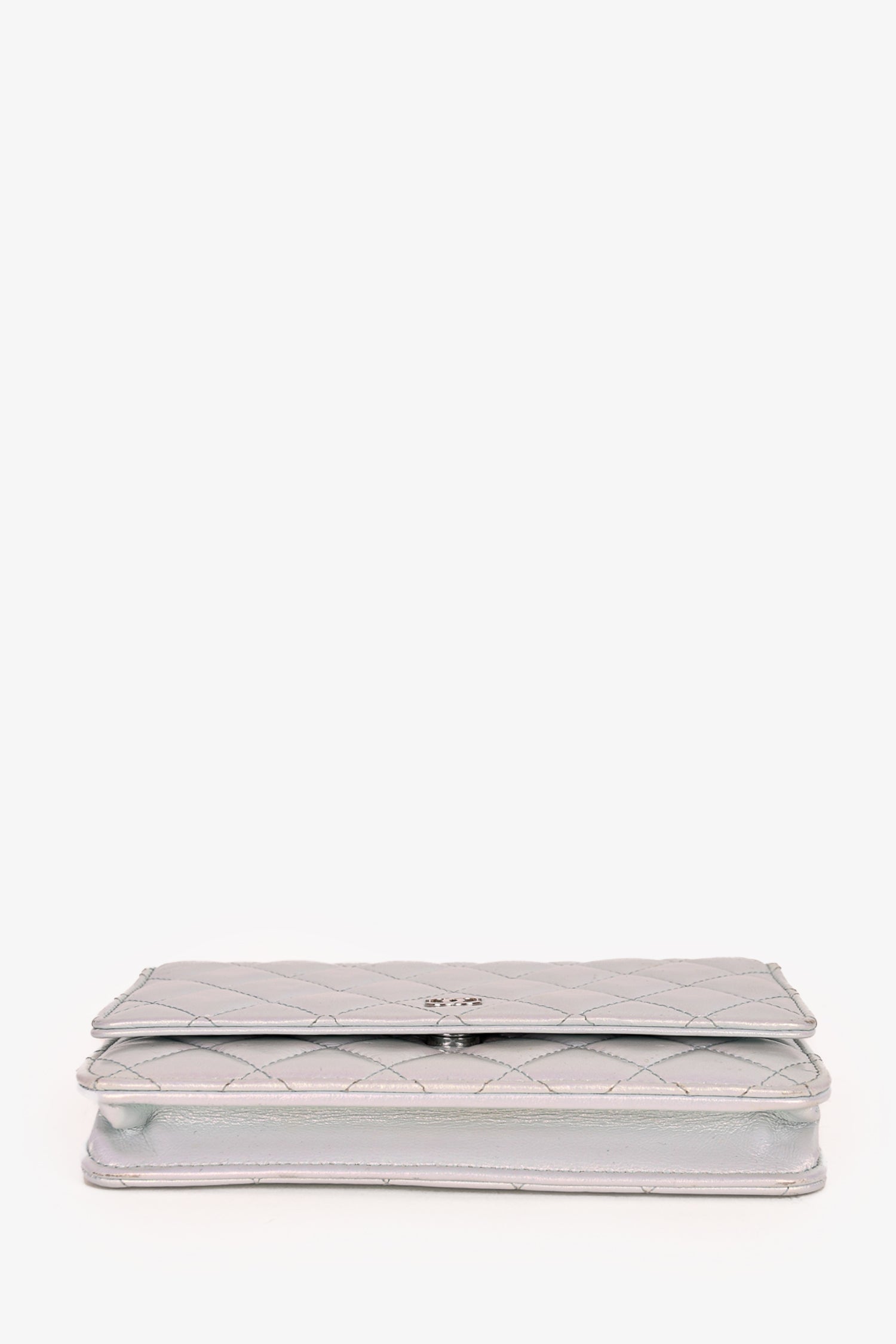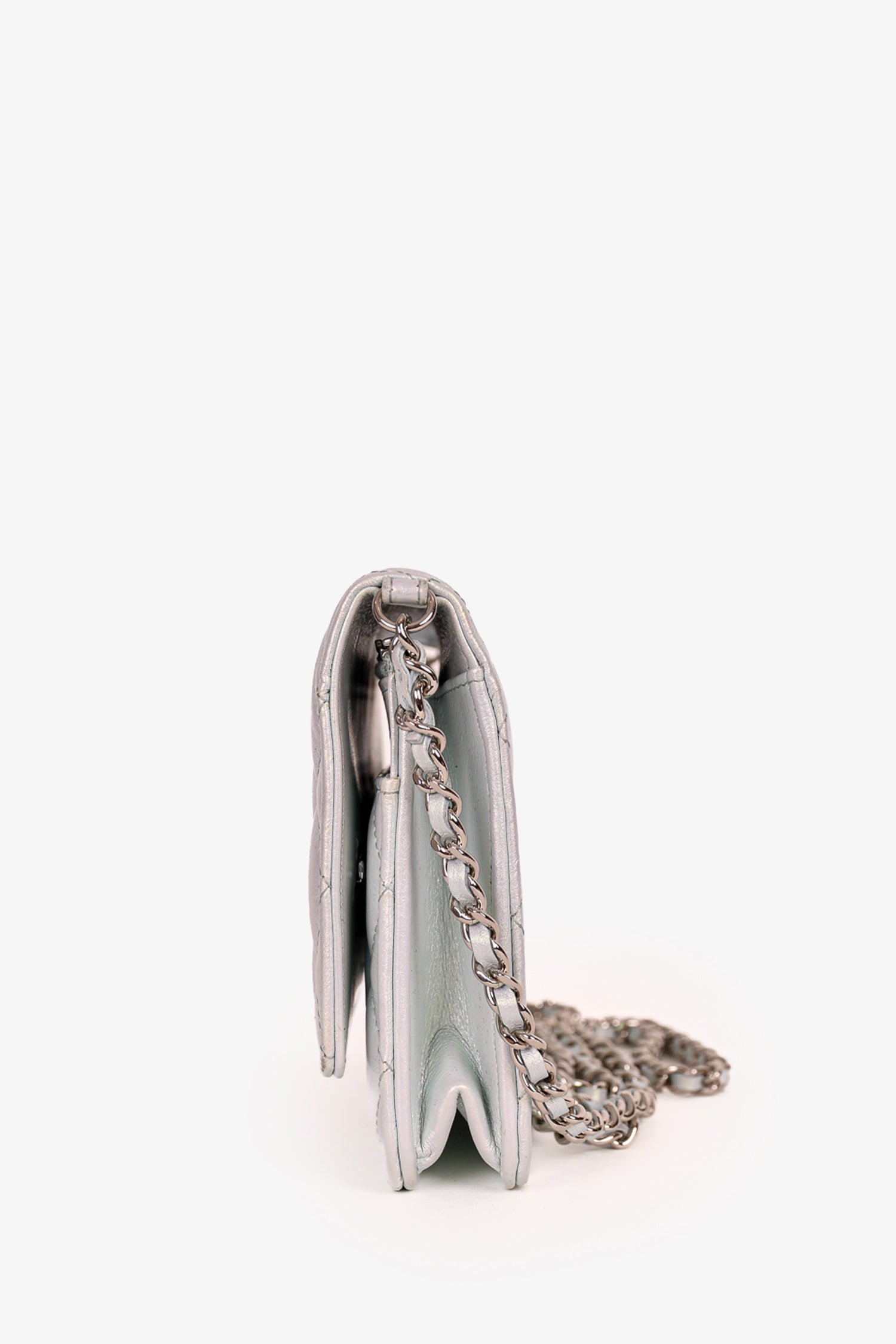 Refresh availabilityPre-Loved Chanel™ Blue Iridescent Quilted Wallet On Chain. Front fold-over flap with magnetic button closure. Front slip pocket. Exterior rear slip pocket. 6 card slots. 1 billfold compartment. 1 zippered compartment. Zip pocket at the interior of the front flap. Silver-tone hardware.