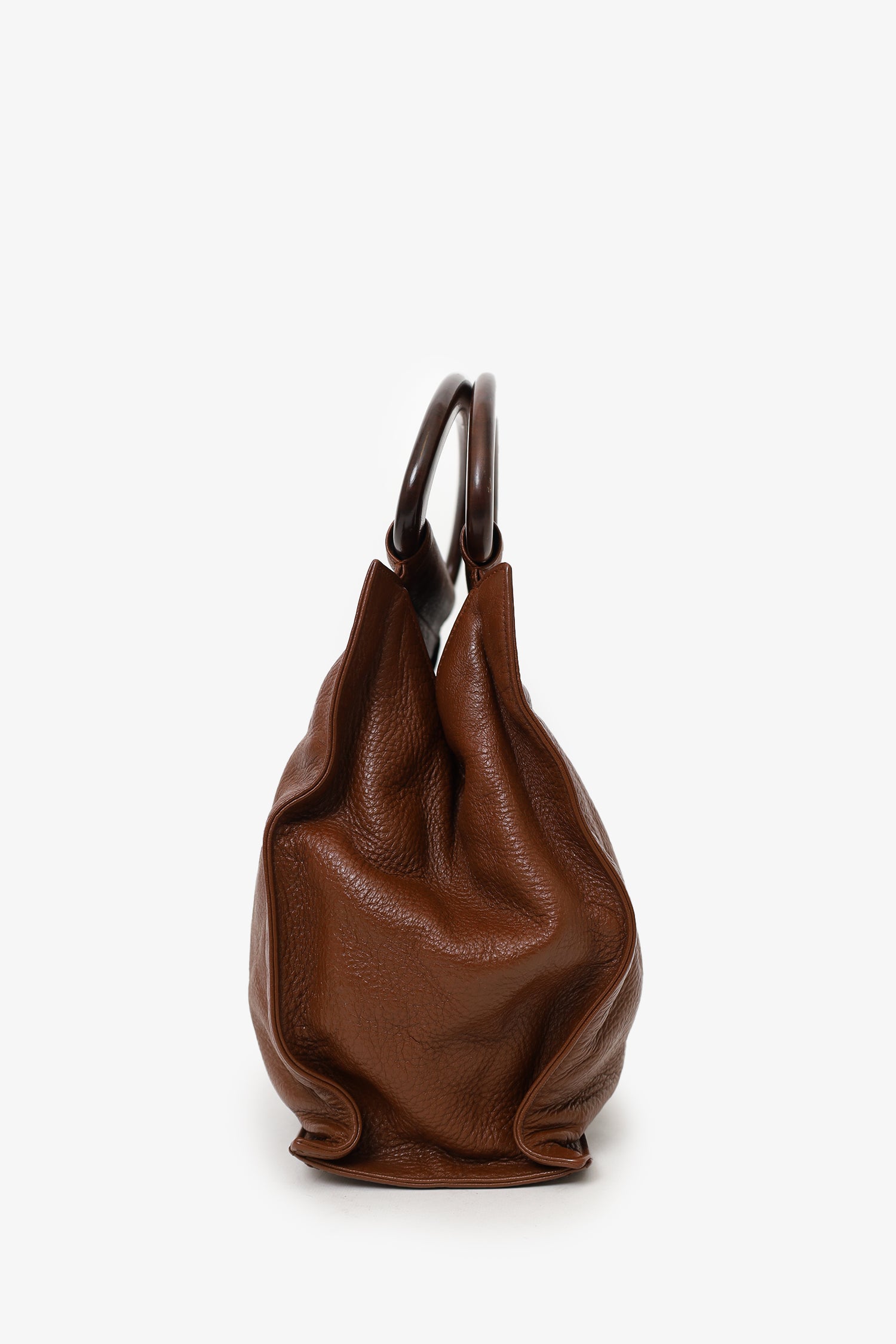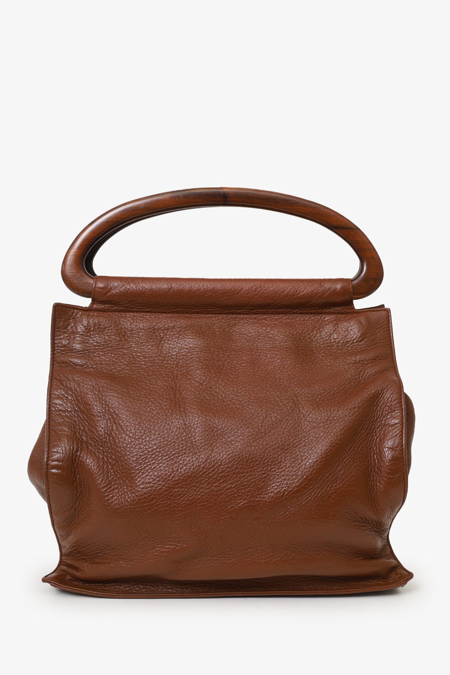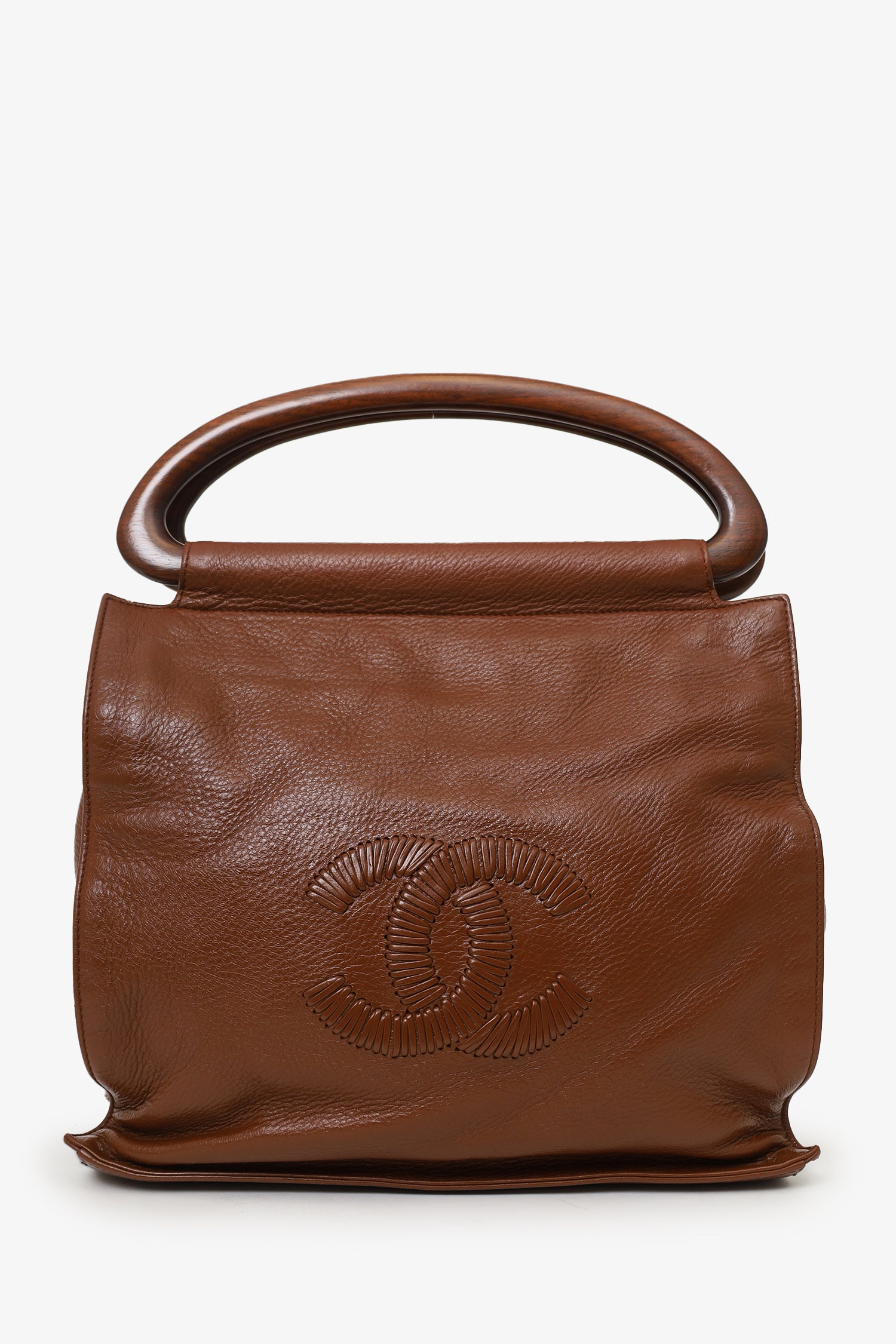 Refresh availabilityPre-Loved Chanel™ Brown Leather Wooden Handle CC Tote. Top interior snap-button closure. Twin wooden handles. Lined interior. 2 interior pockets; 1 slip and 1 zip. Tonal stitching.