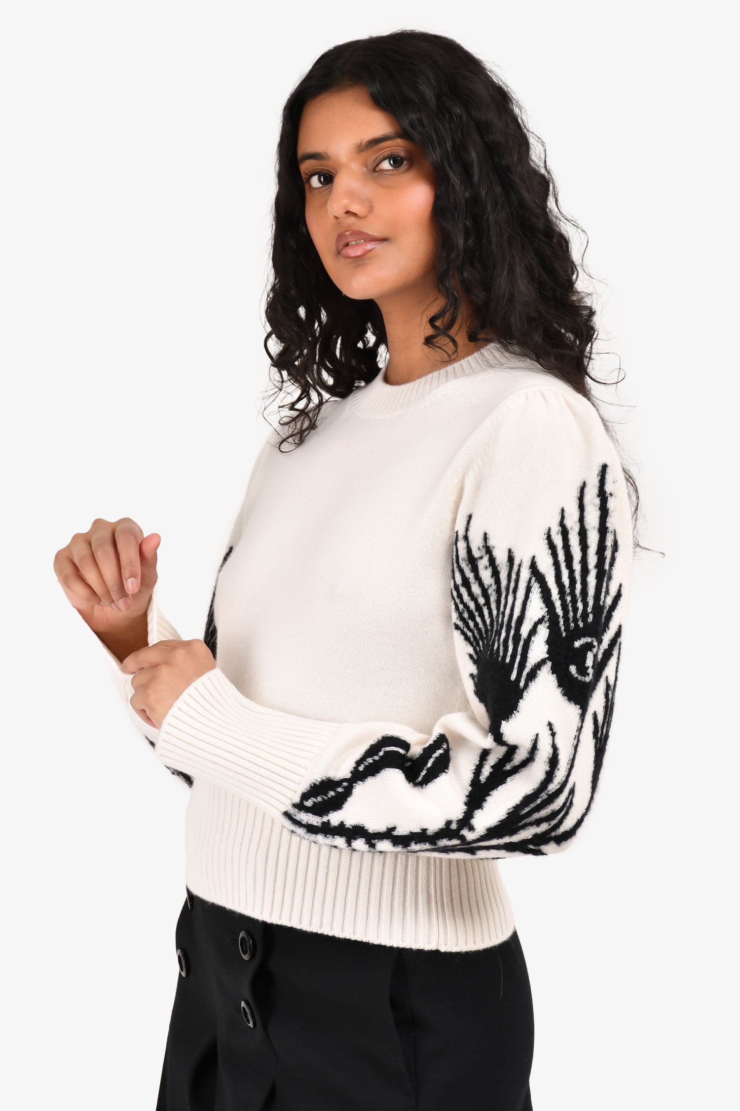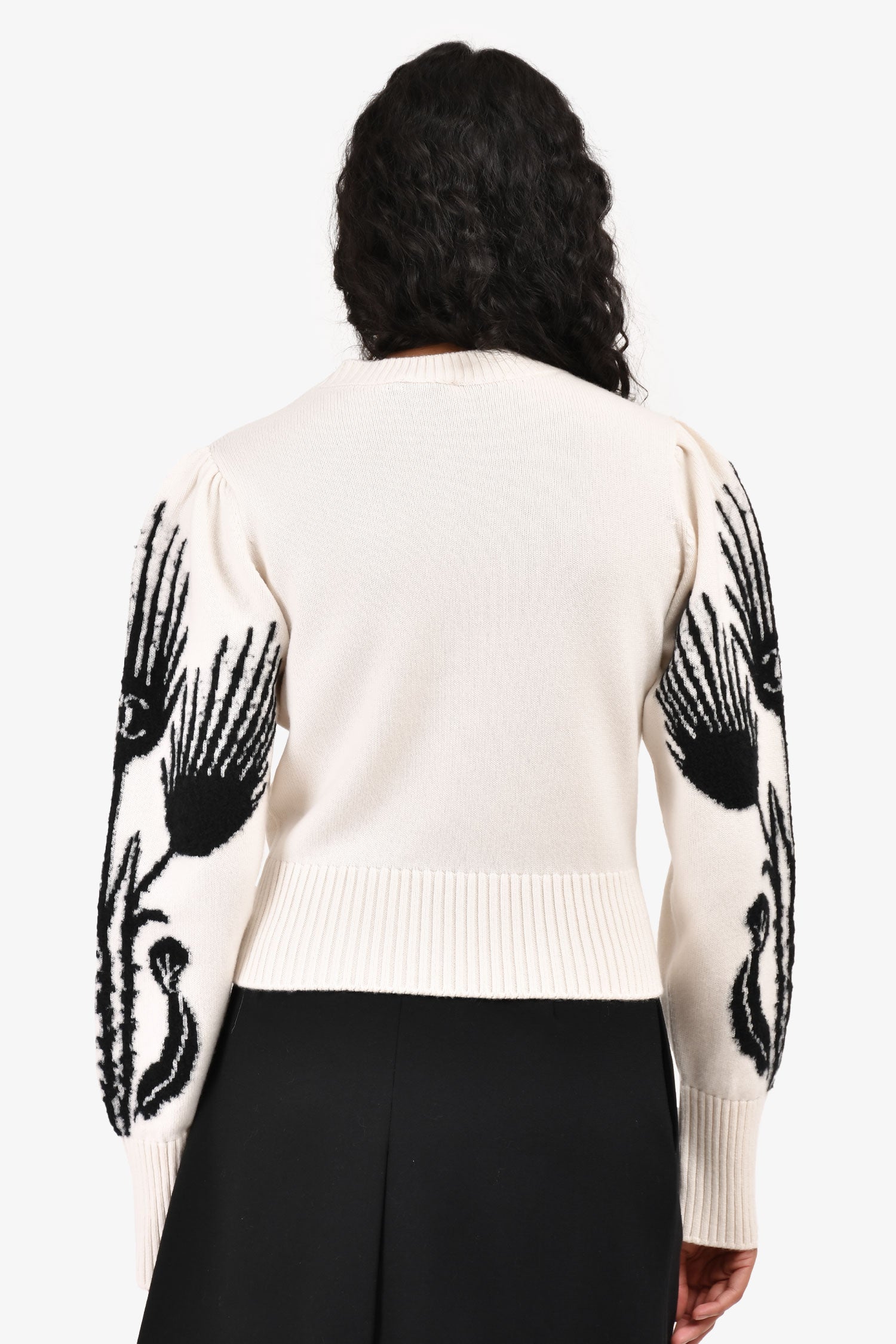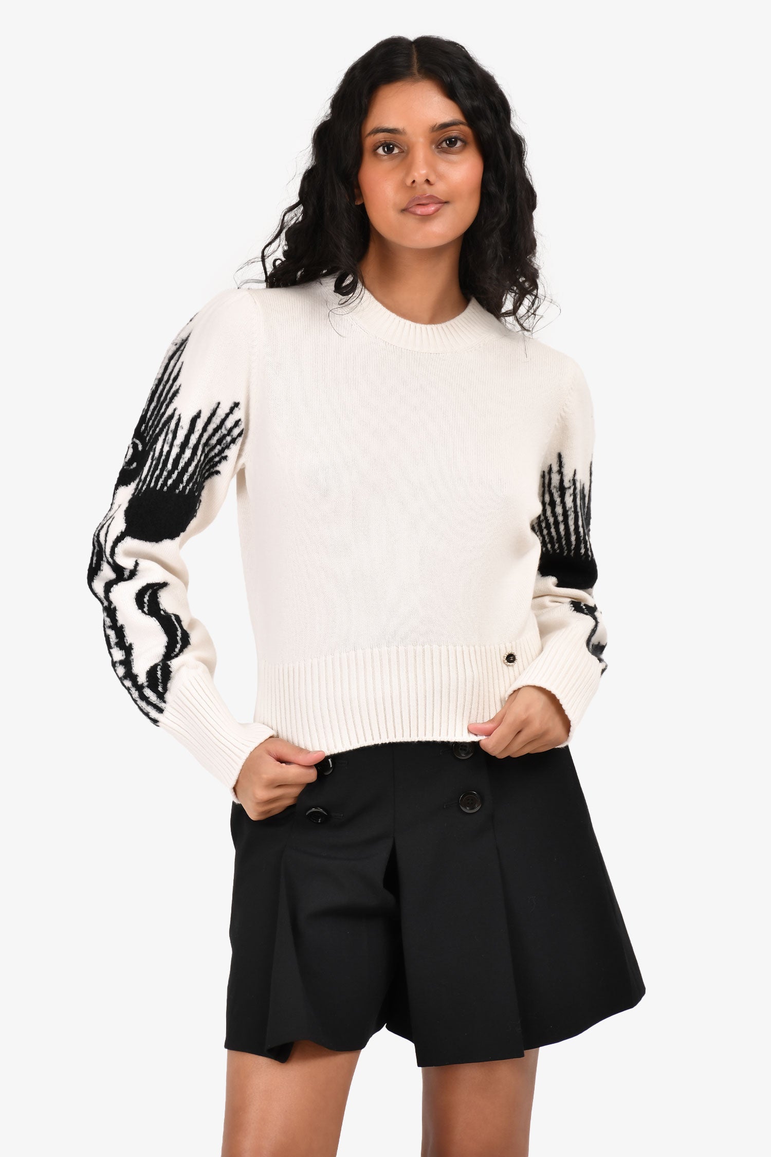 Refresh availabilityPre-Loved Chanel™ Cream/Black CC Printed Sleeve Crewneck Sweater. Ribbed neckline, hem and cuffs. Round neckline. Unlined. Tonal stitching.