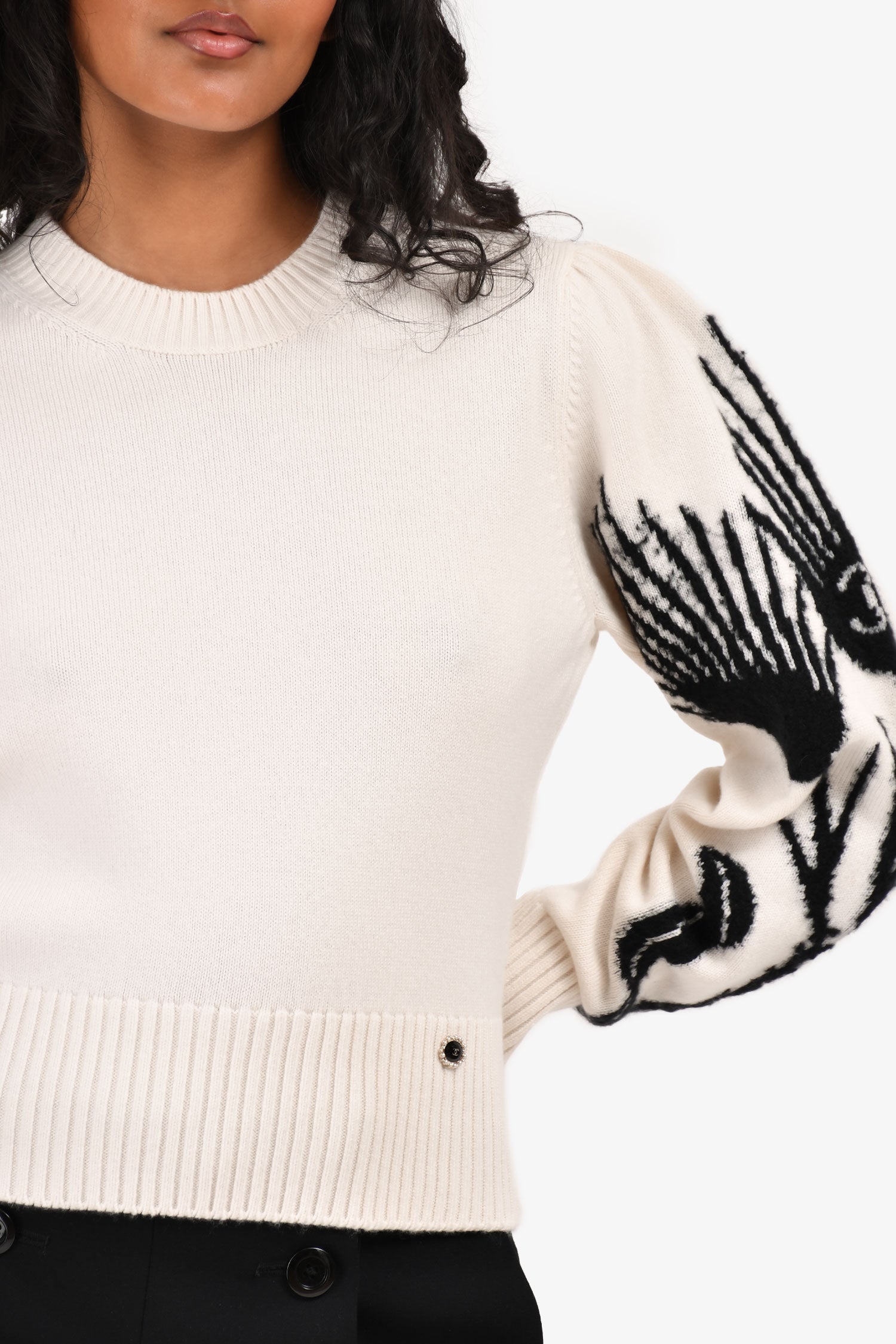 Pre-Loved Chanel™ Cream/Black CC Printed Sleeve Crewneck Sweater Size 34