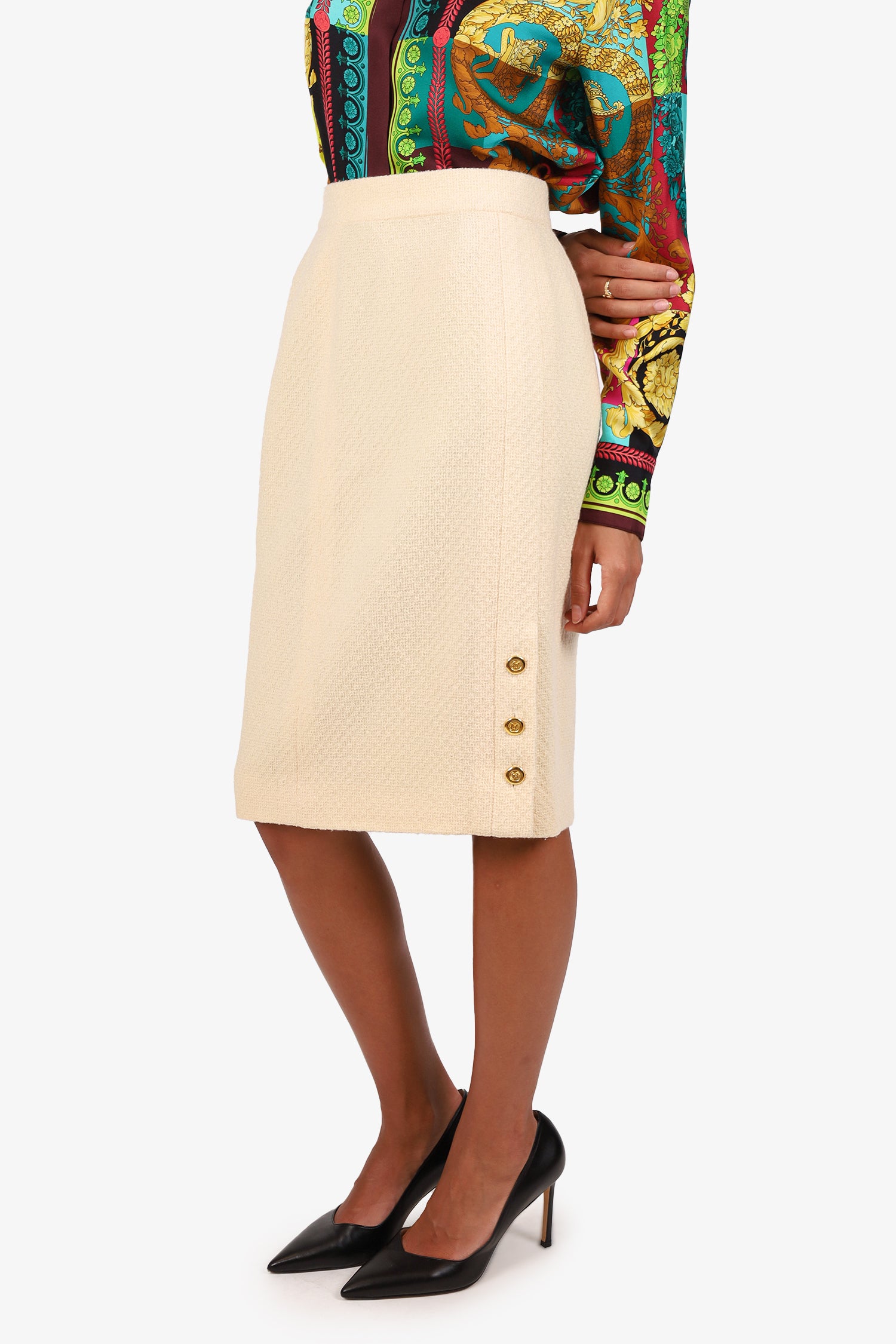 Pre-Loved Chanel™ Cream Wool/Silk CC Gold Buttons Midi Skirt Size 42
