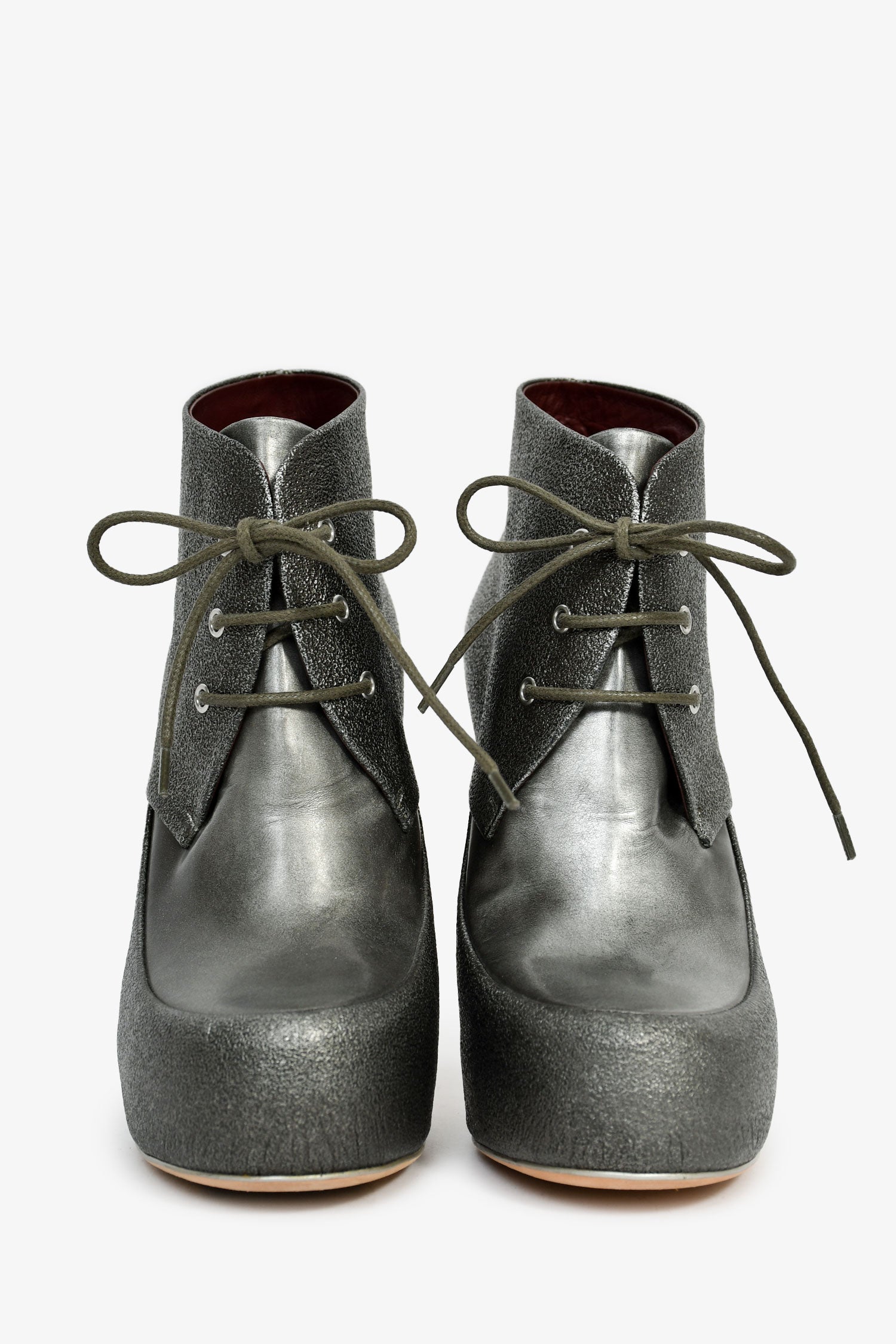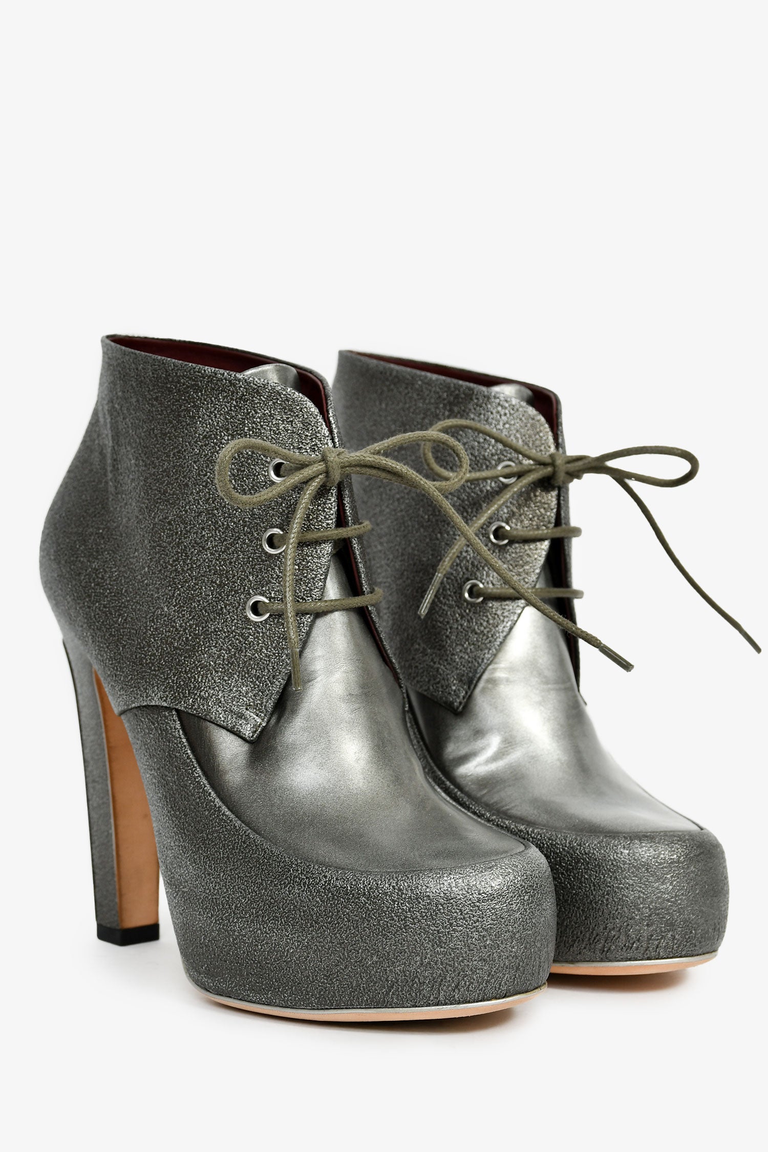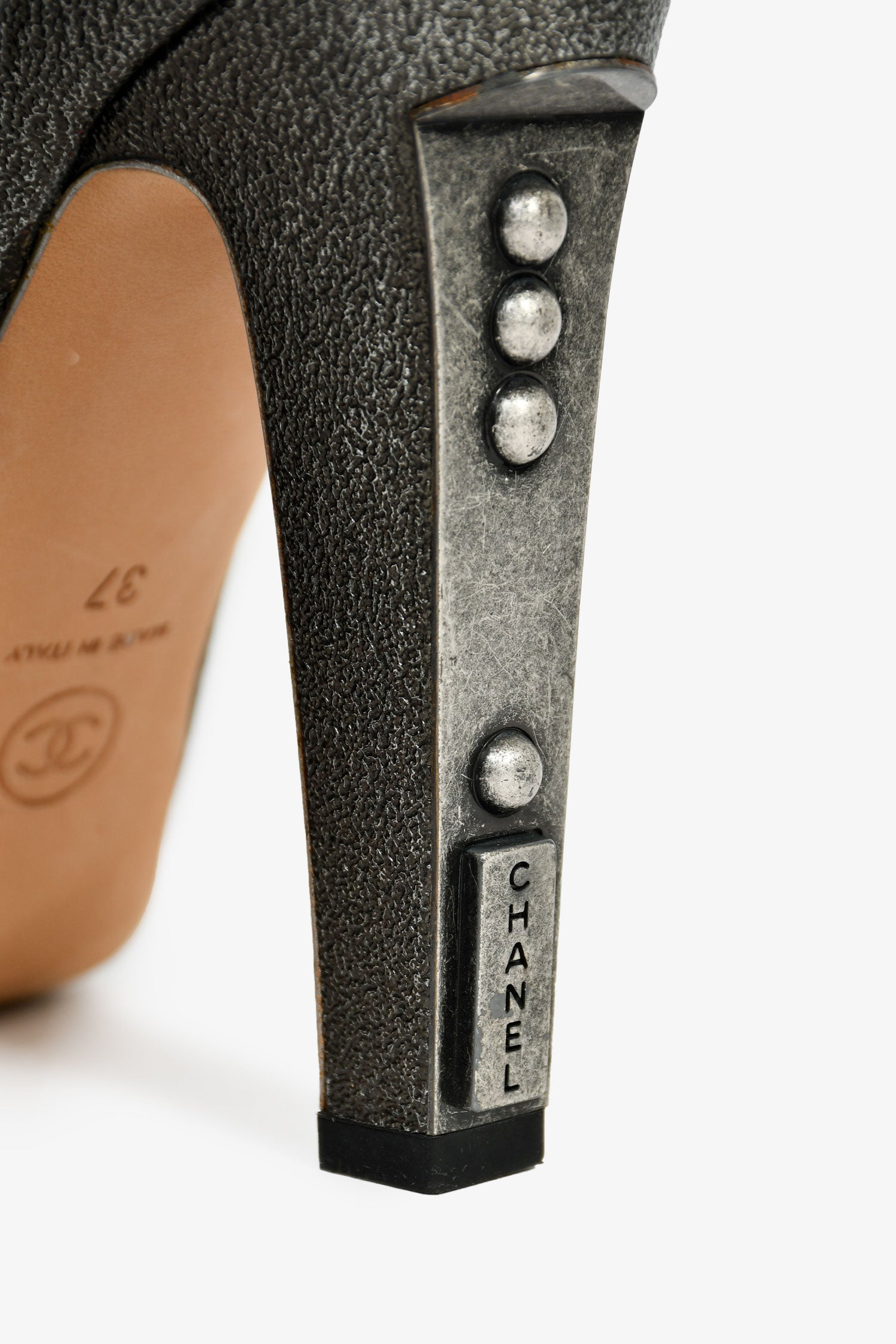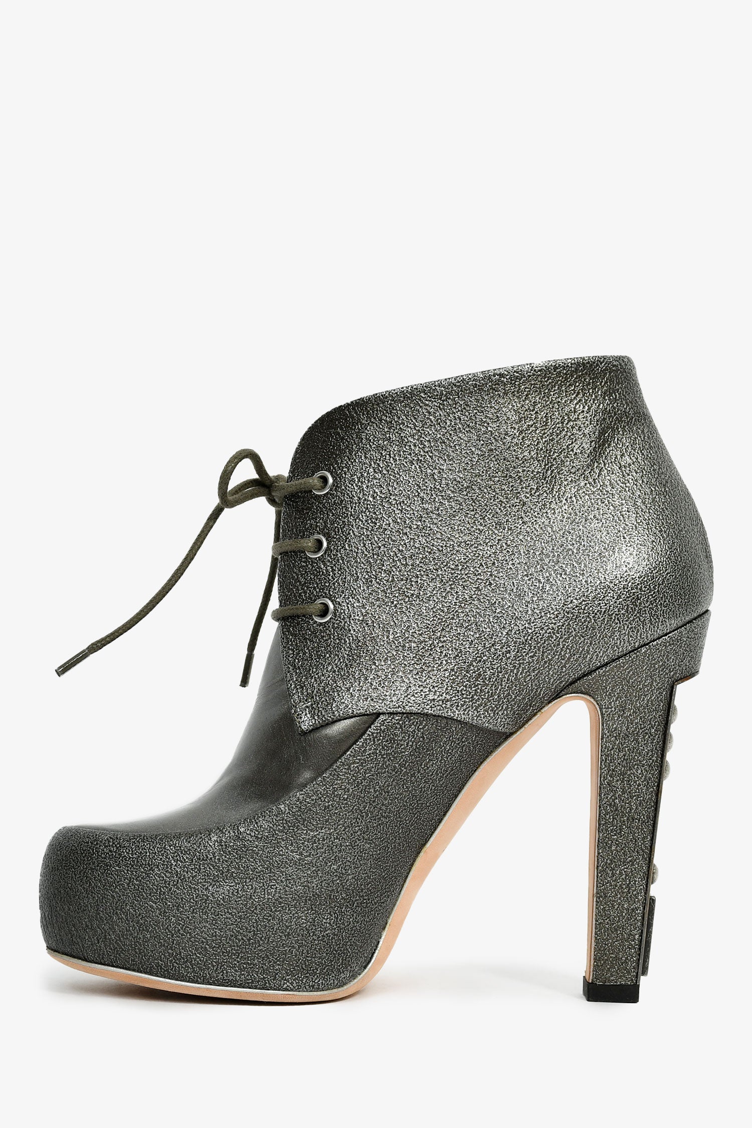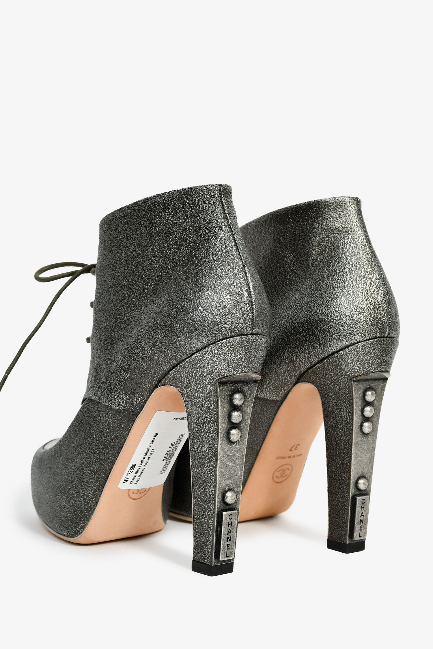 Refresh availabilityPre-Loved Chanel™ Grey Leather Metallic Lace Up Logo Heeled Booties. Round toe. Lace-up closure. Leather-lined interior. Tonal stitching.