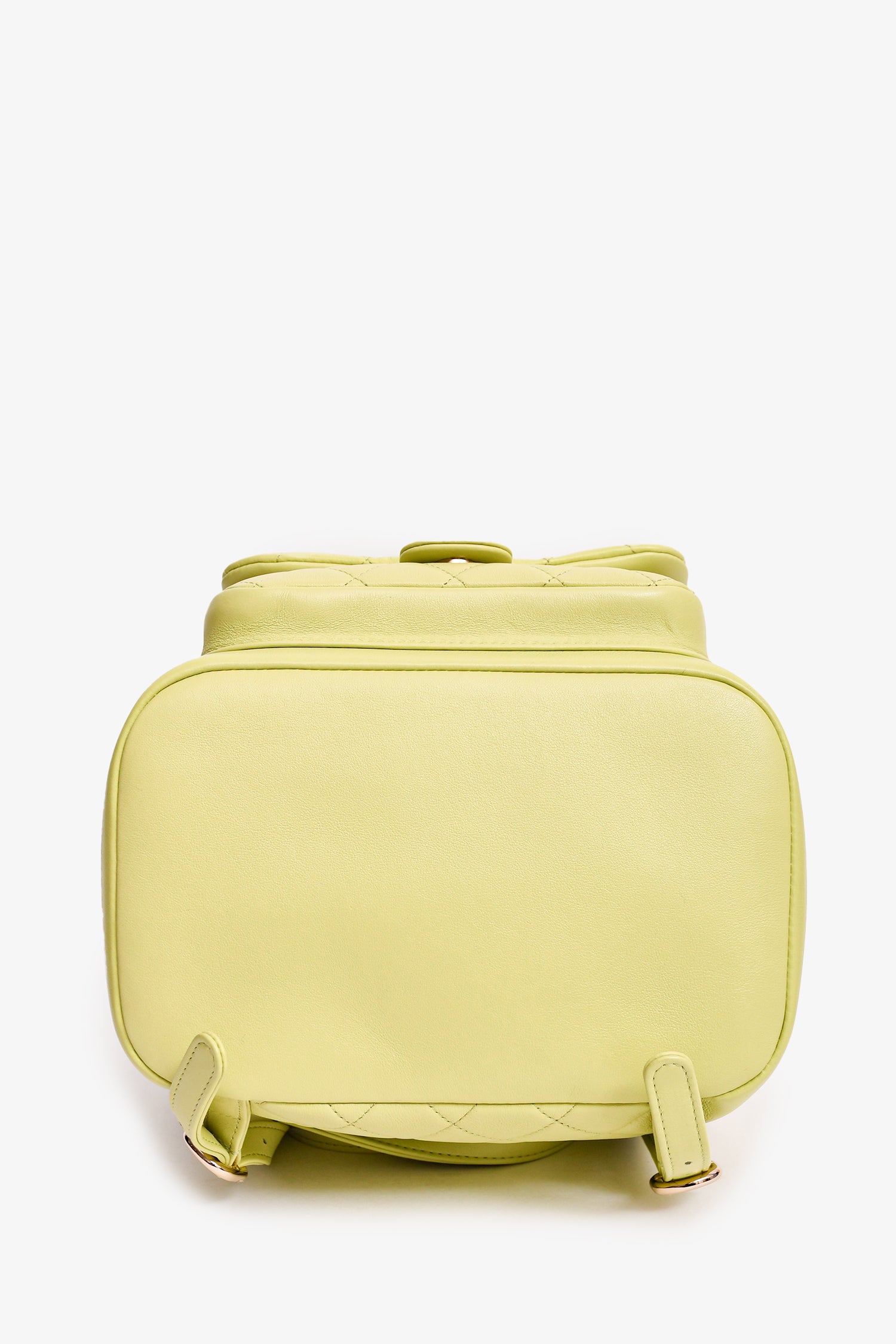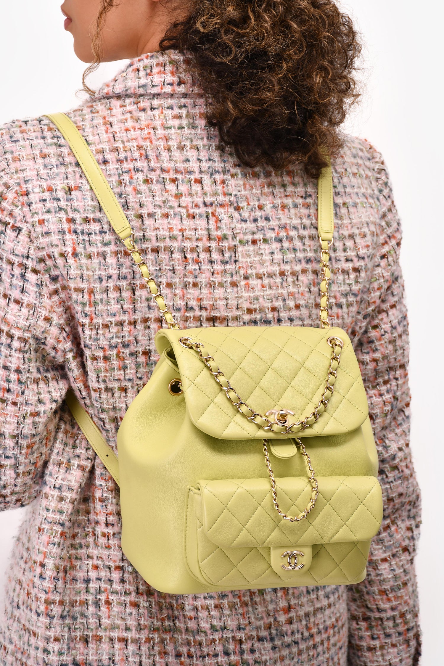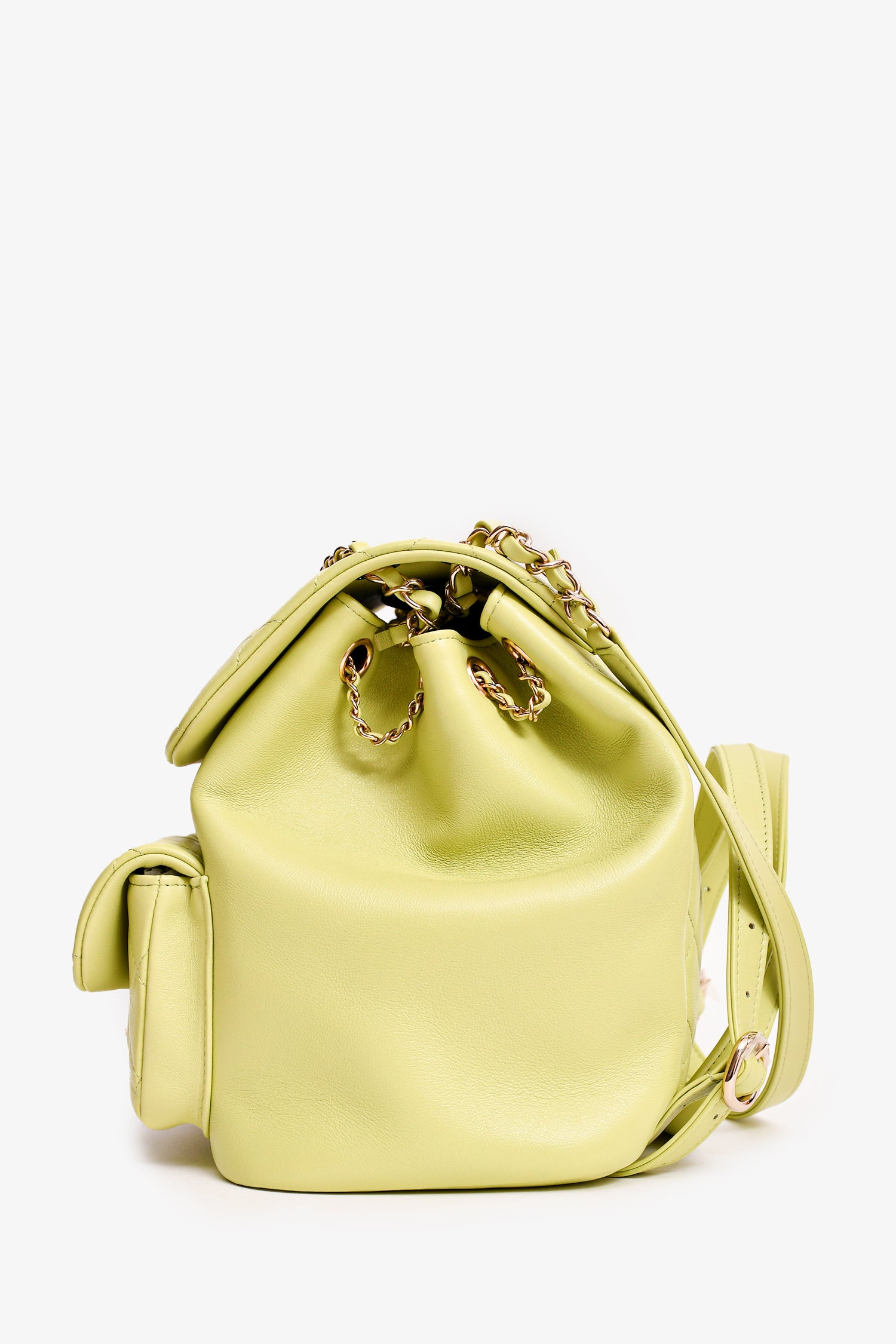 Refresh availabilityPre-Loved Chanel™ Mint Green Lambskin Small GHW Duma Backpack. Fold-over bag flap. Front exterior snap compartment. Adjustable pull tab. Single handle strap. 2 shoulder straps. Single slip interior compartment. Lined interior.
