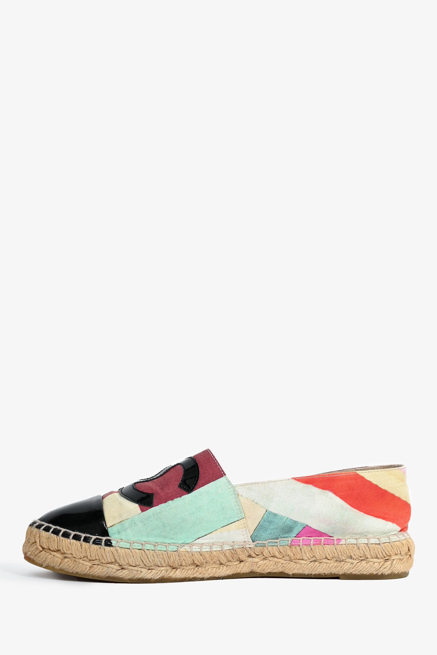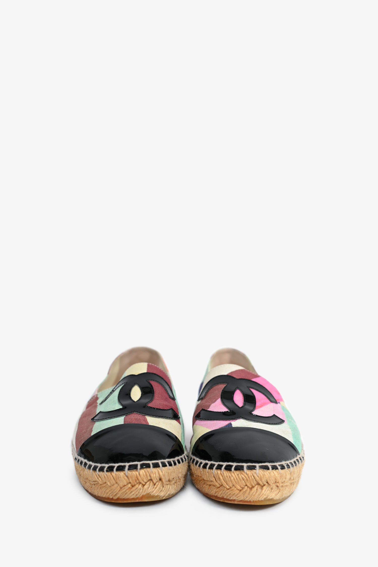 Refresh availabilityPre-Loved Chanel™ Multicolour Canvas/Black Patent CC Espadrilles. Patent toe cap. Rounded toe. Multicoloured canvas exterior. Tonal stitching.