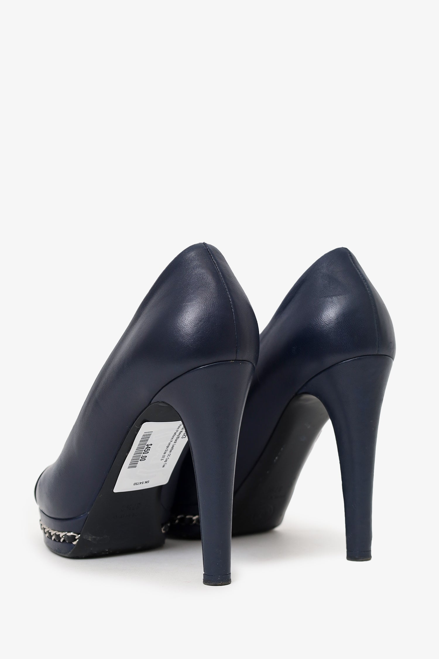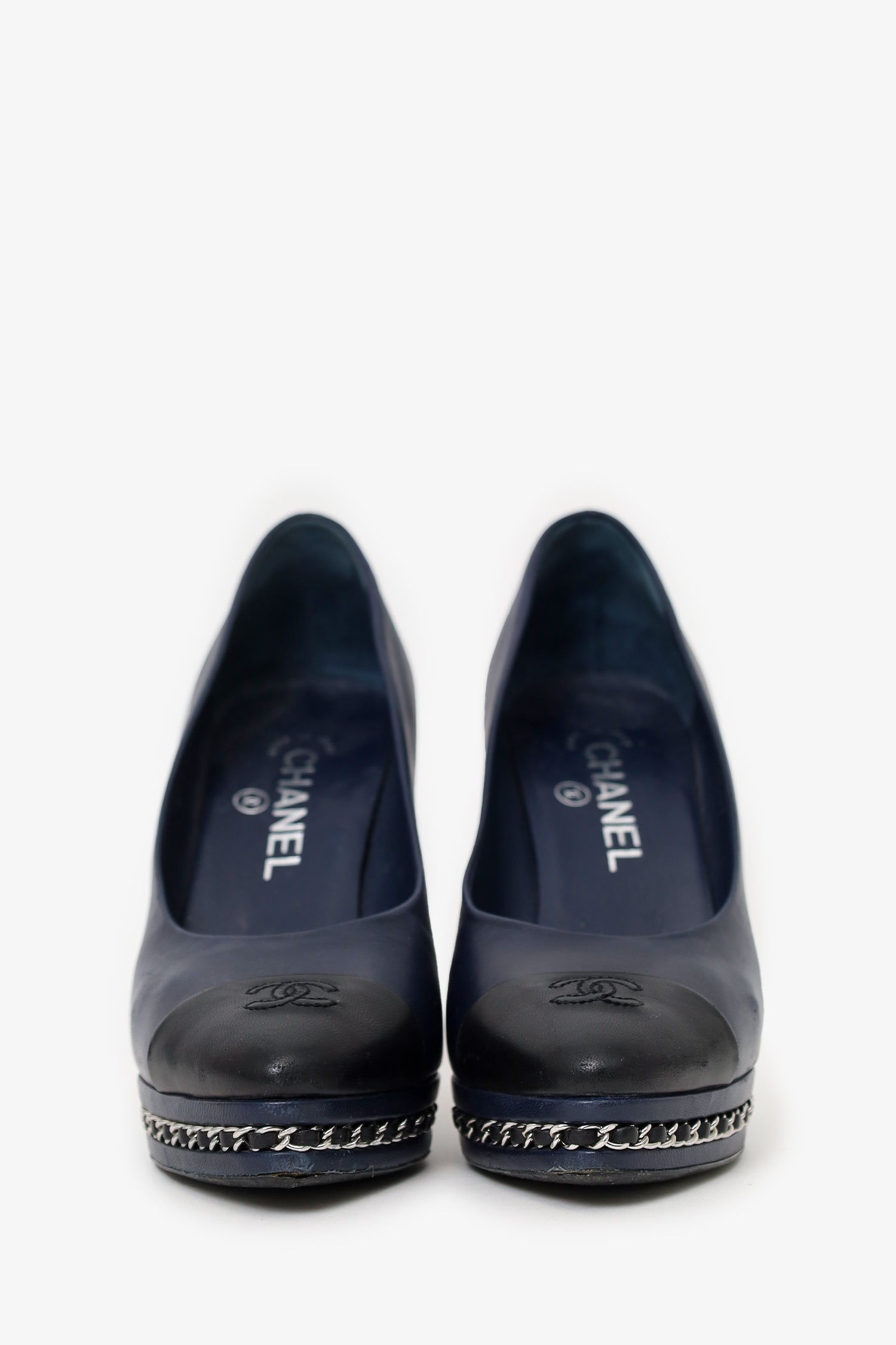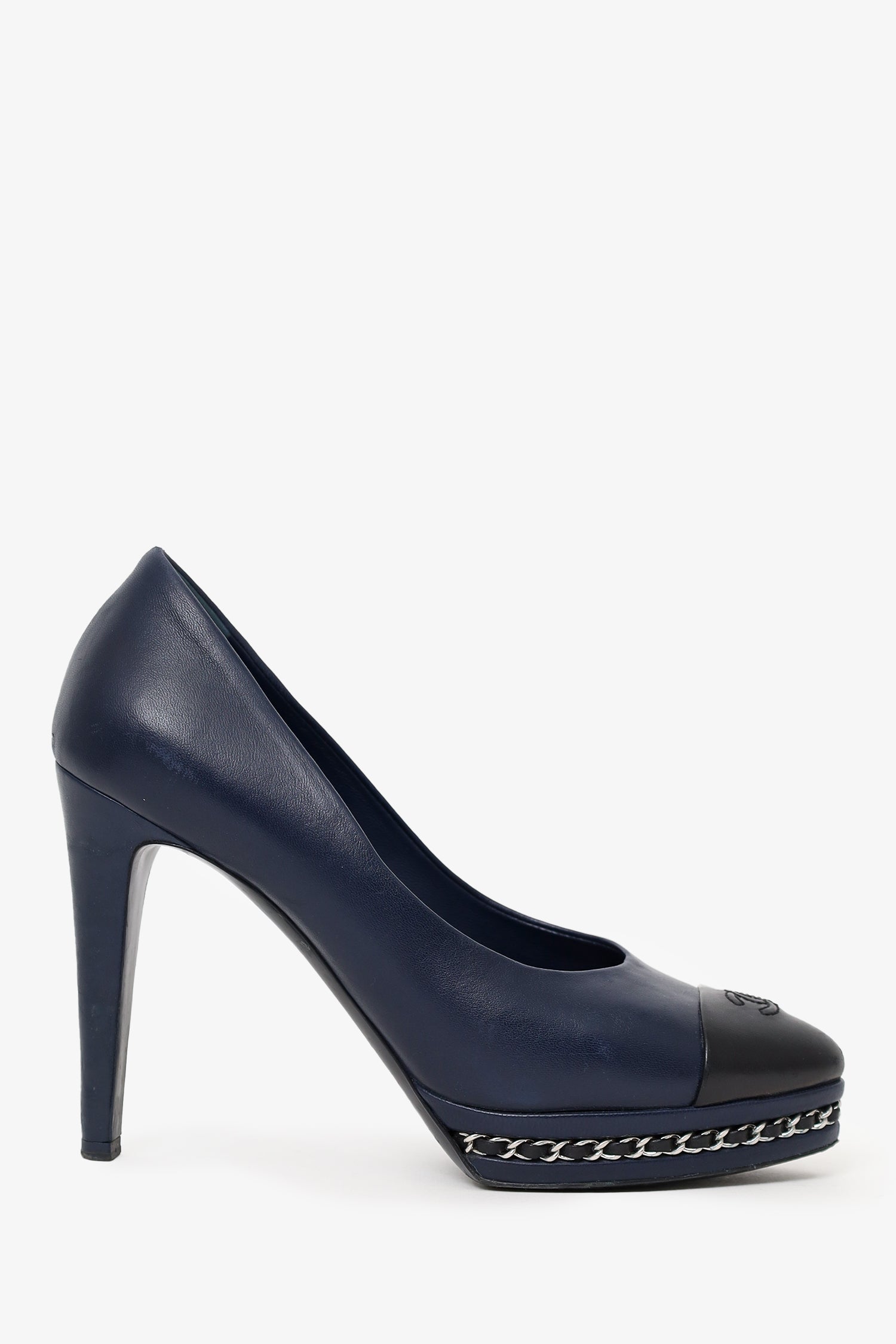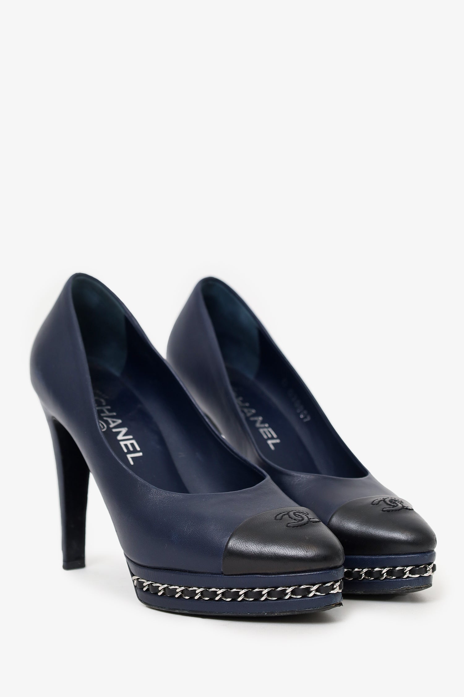 Refresh availabilityPre-Loved Chanel™ Navy/Black Leather CC Cap Toe Chain Platform Pumps. Slip-on. Pointed toe. Chainlink detail on front side soles. Silver-tone hardware. Tonal stitching.