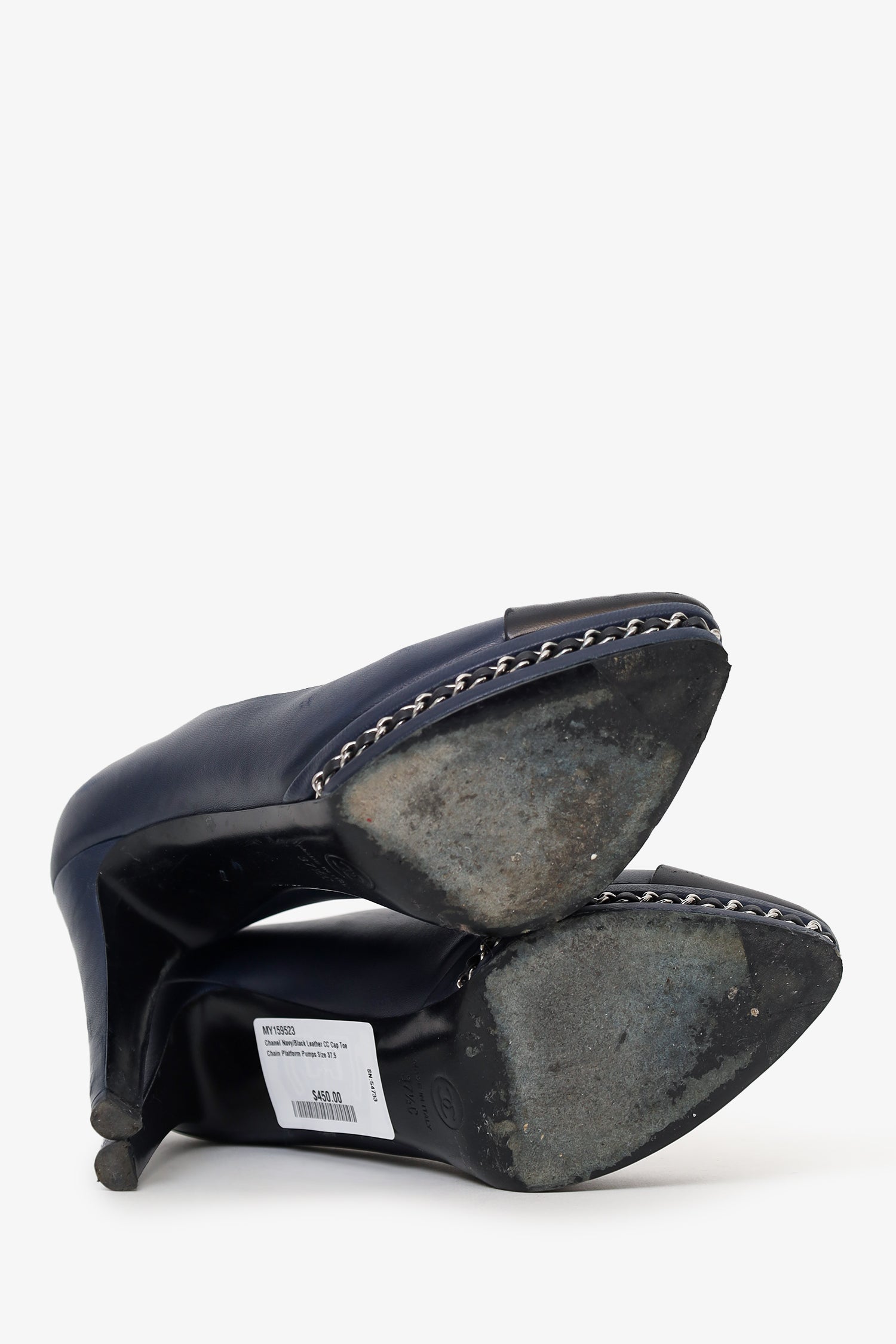 Pre-Loved Chanel™ Navy/Black Leather CC Cap Toe Chain Platform Pumps Size 37.5