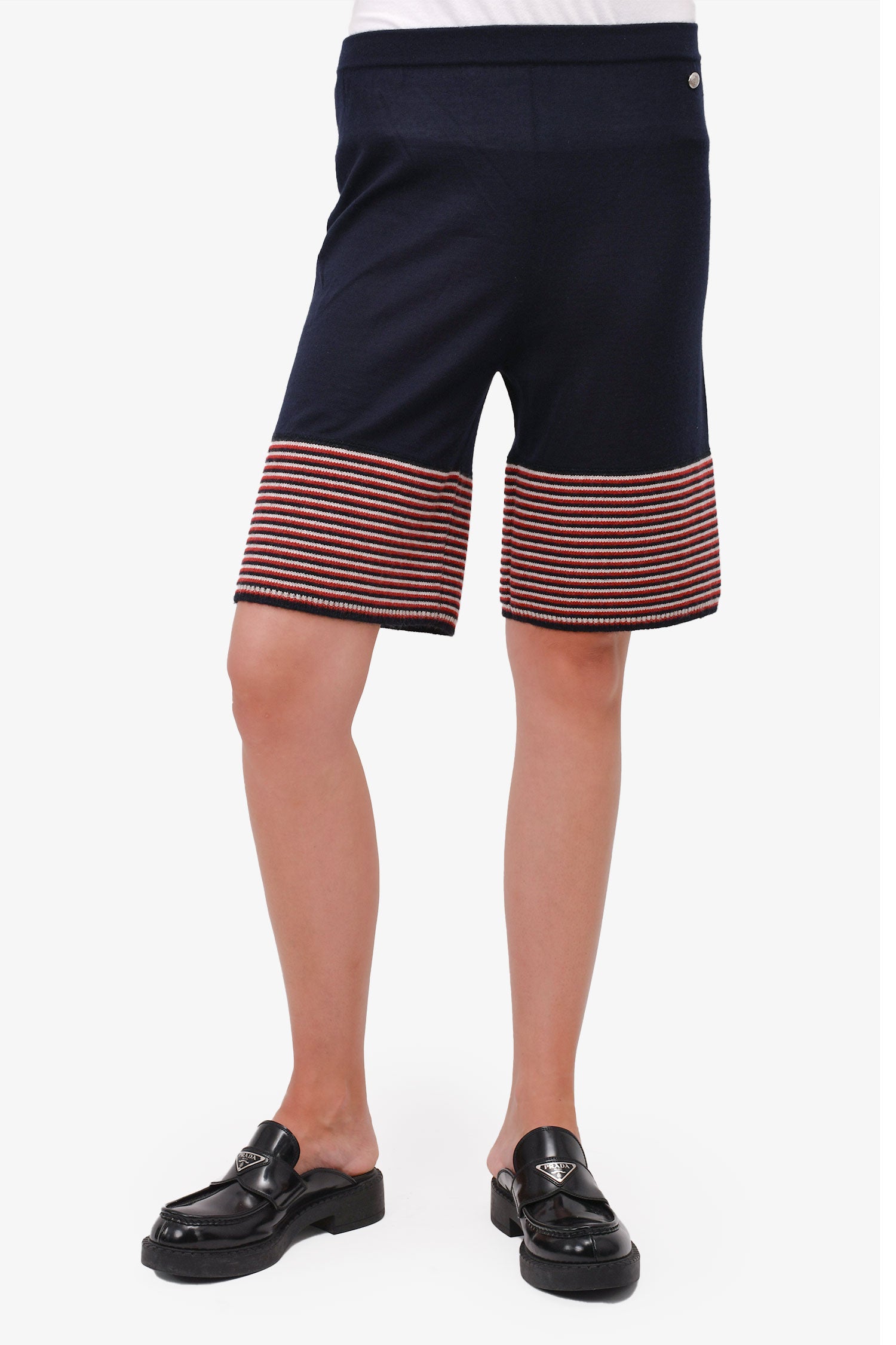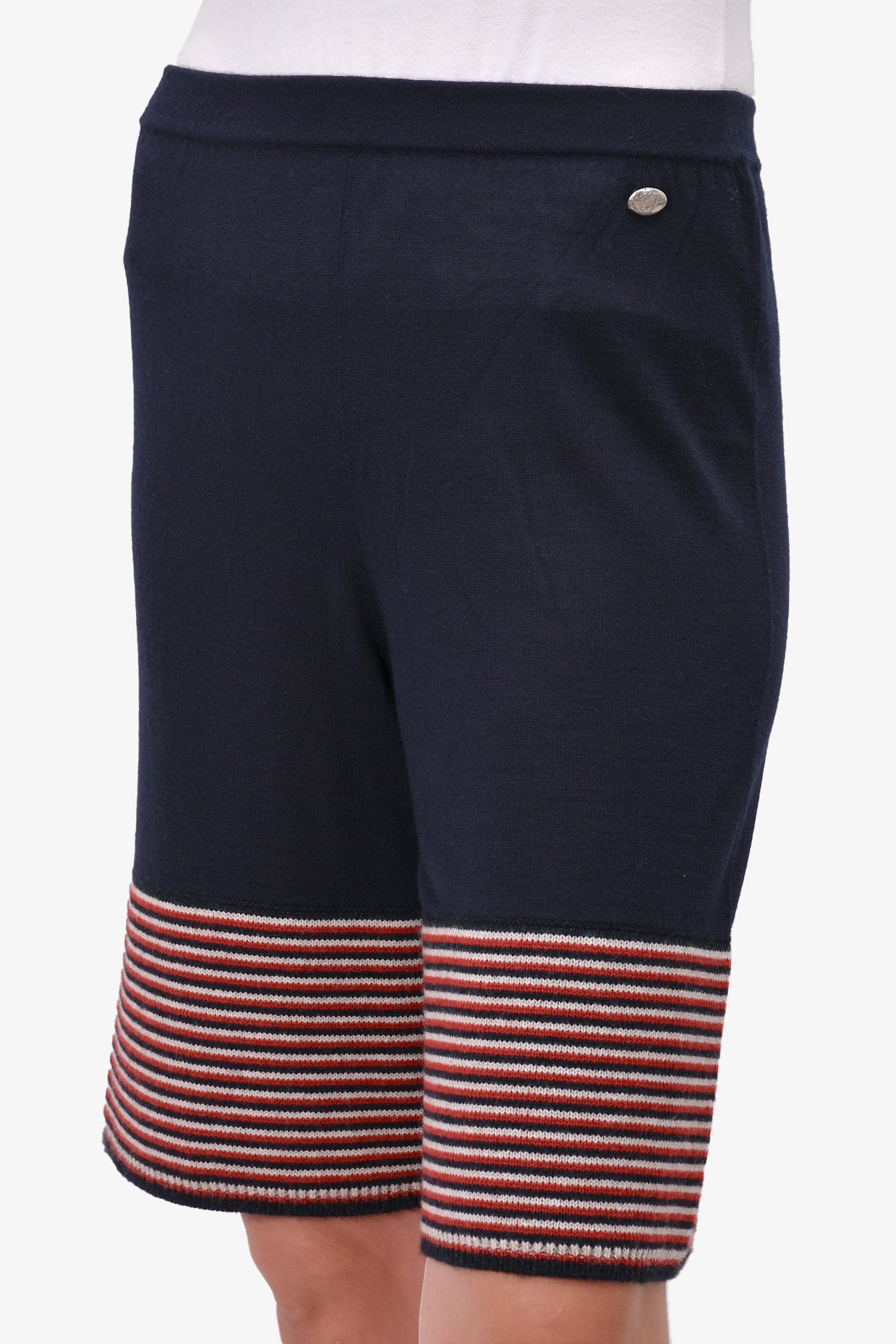 Refresh availabilityPre-Loved Chanel™ Navy Blue/Striped Cashmere/Silk Knit Long Flared Shorts. Elasticized waist.