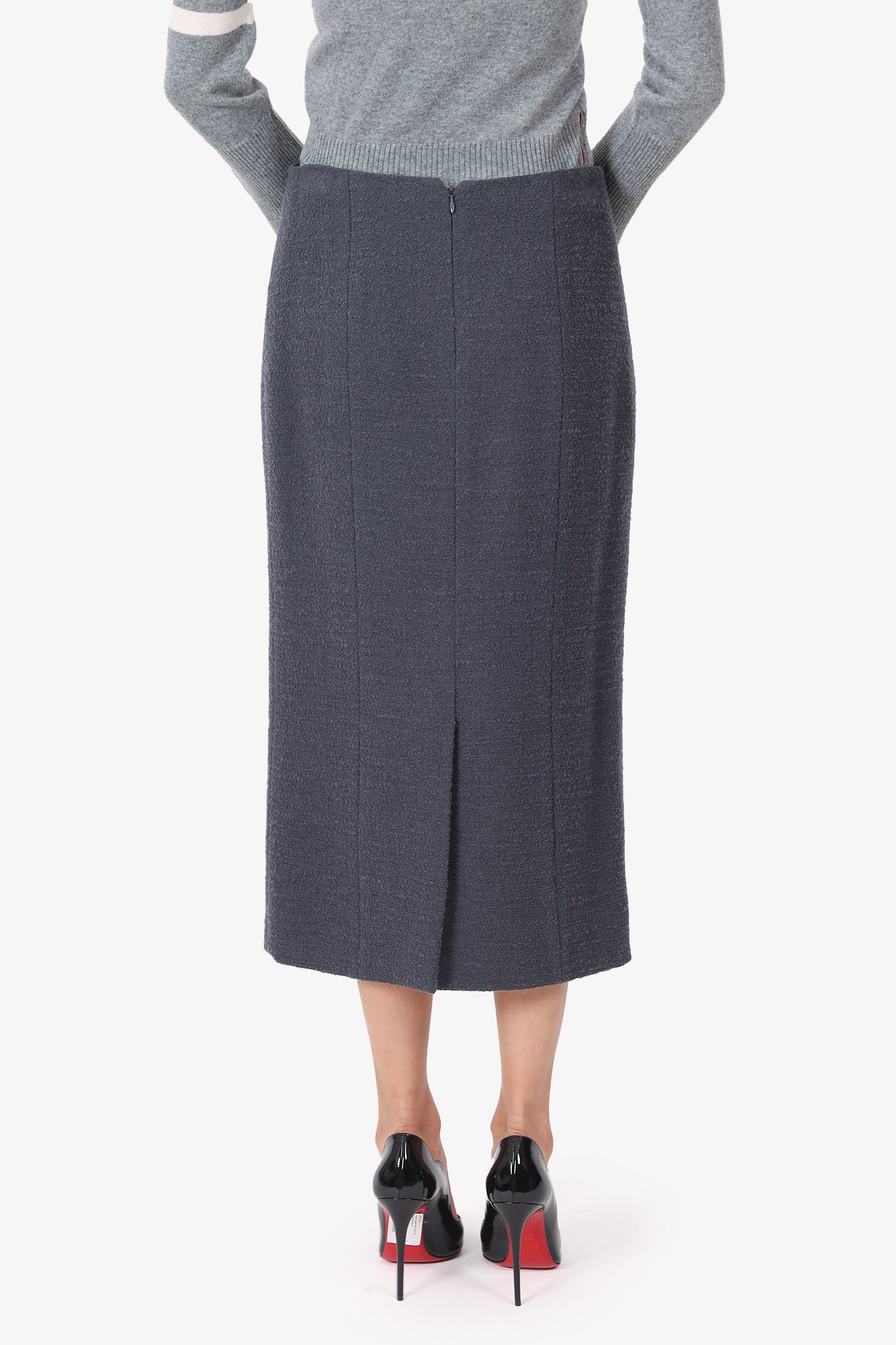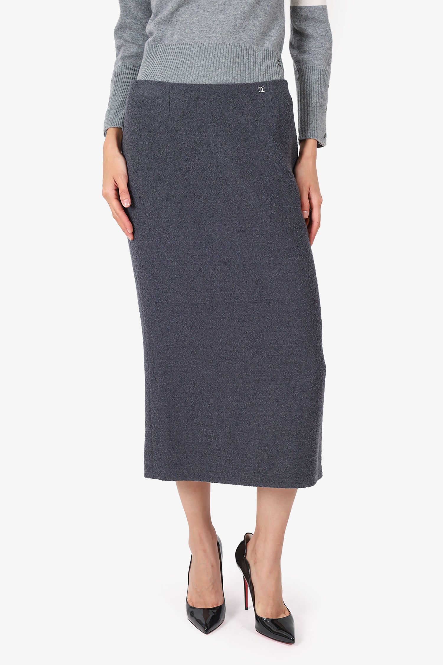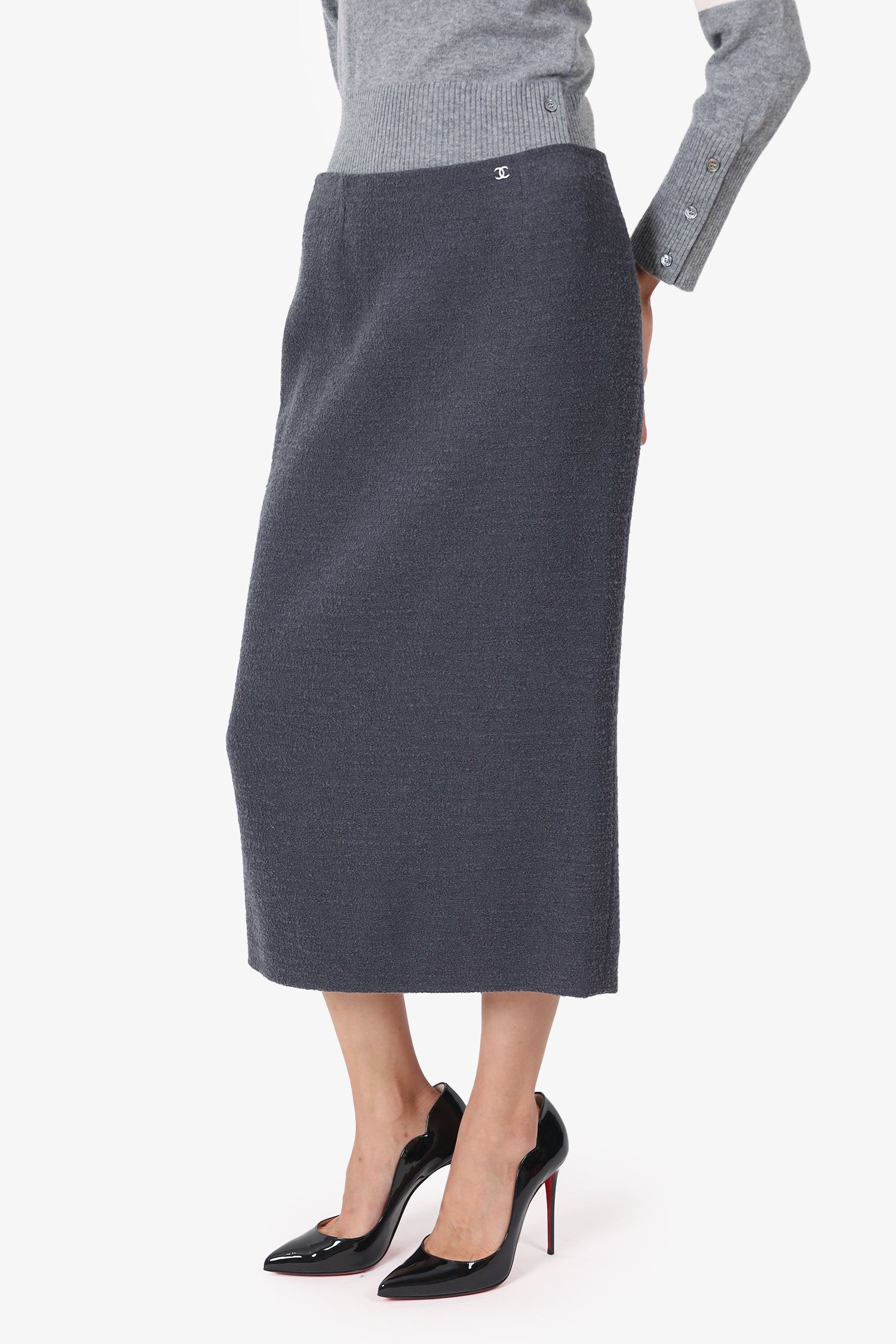 Refresh availabilityPre-Loved Chanel™ Navy Wool Tweed Midi Pencil Skirt. Pull-on. Rear zip and hook closures. Lined interior. Silver-tone hardware. Tonal stitching.