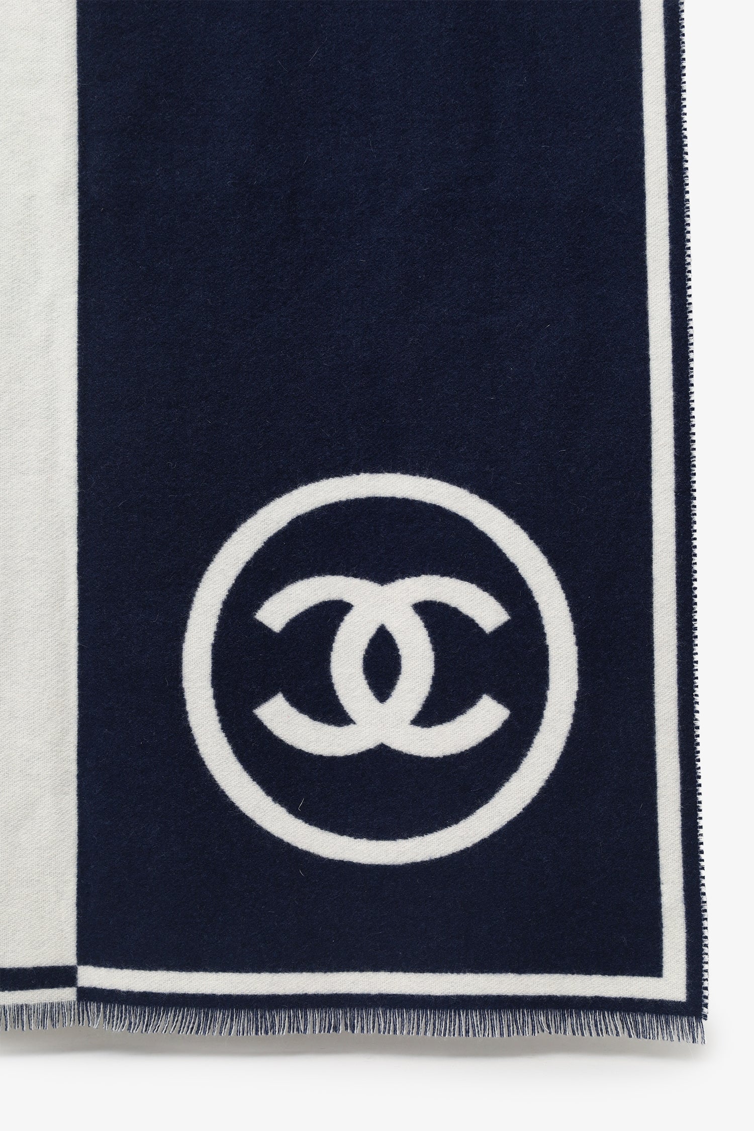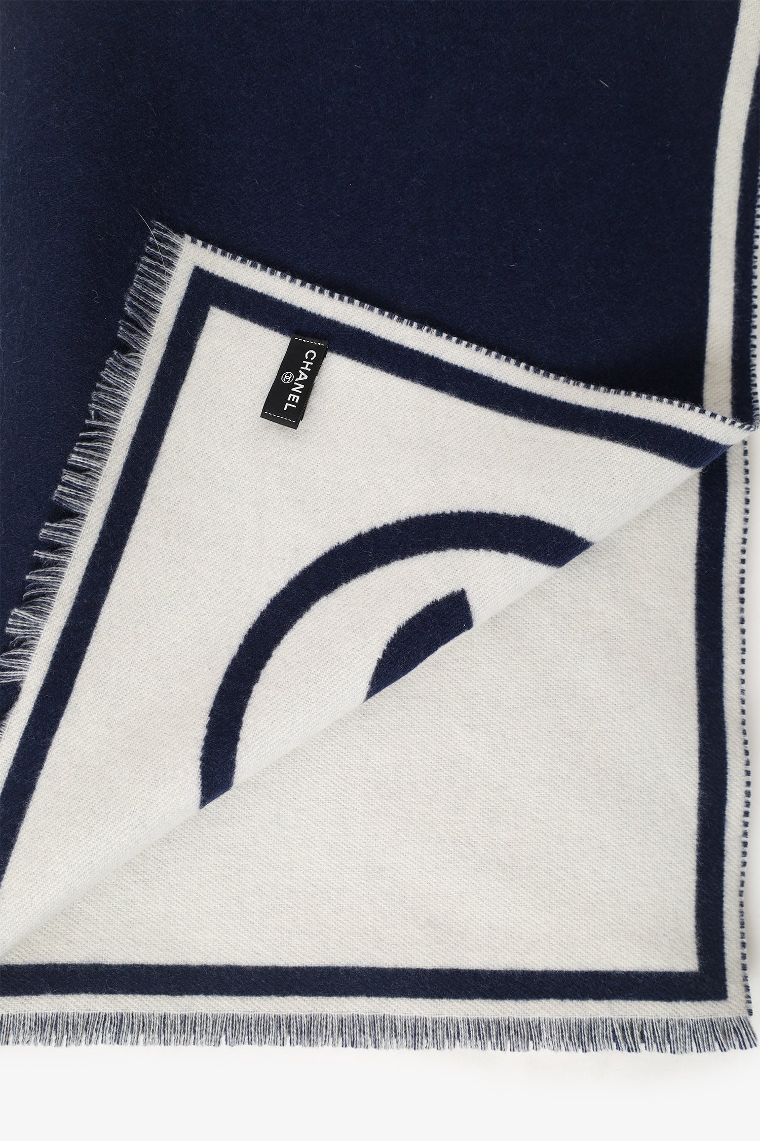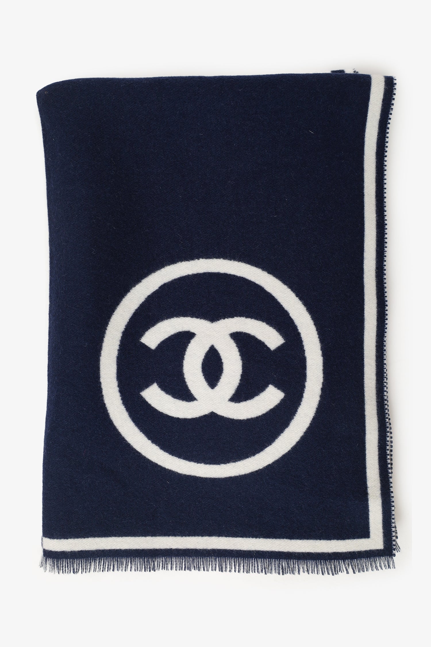 Refresh availabilityPre-Loved Chanel™ Navy/White Cashmere CC Scarf. Fringe detail. Tonal stitching.