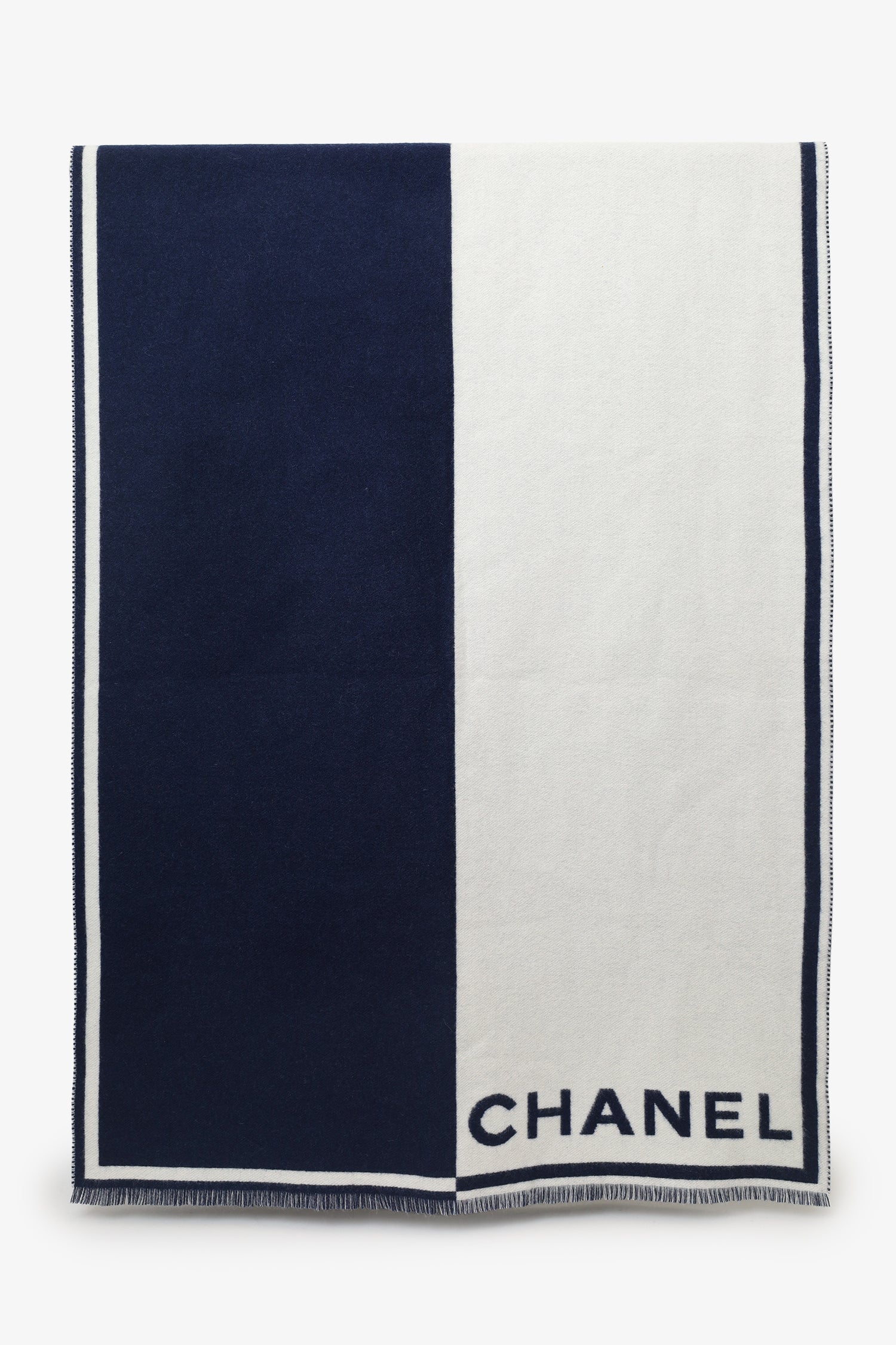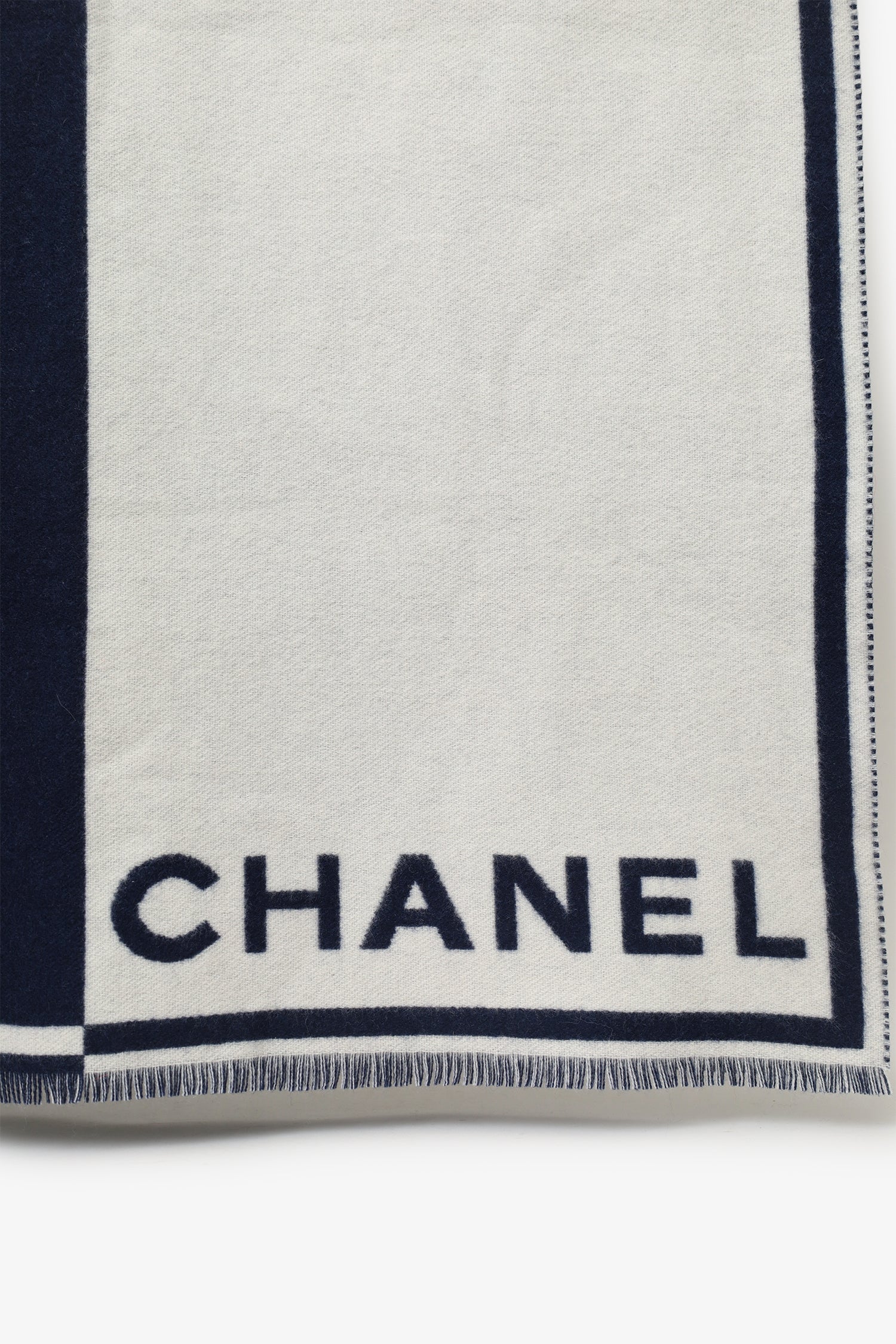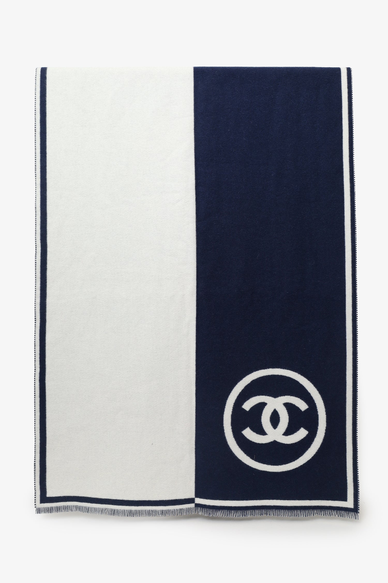 Refresh availabilityPre-Loved Chanel™ Navy/White Cashmere CC Scarf. Fringe detail. Tonal stitching.
