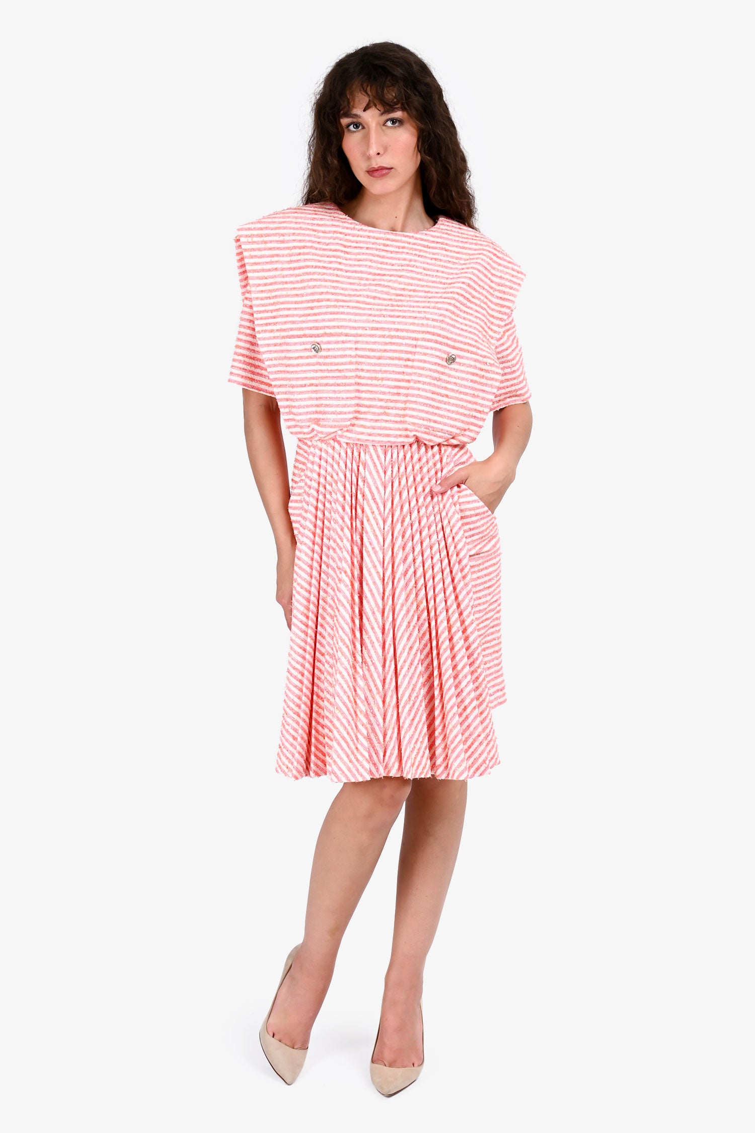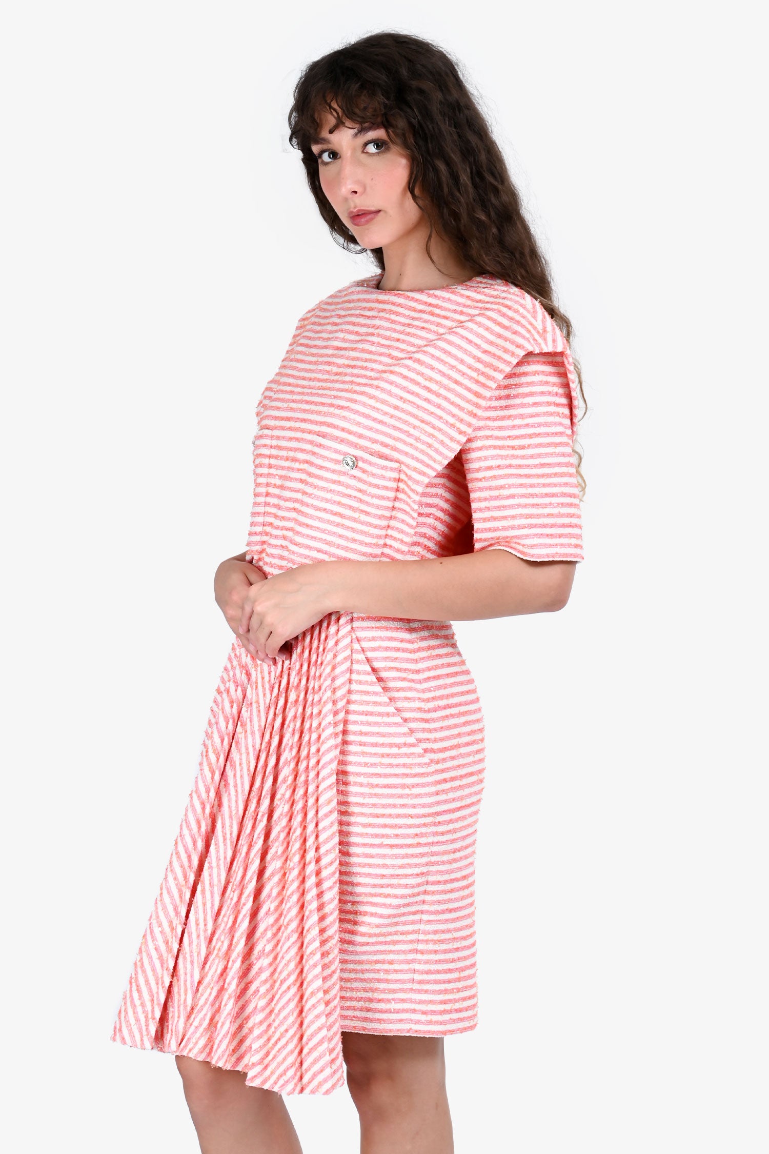 Refresh availabilityPre-Loved Chanel™ Orange/Pink Striped Short Sleeves Midi Dress. Crew neckline. Short sleeves. Back zip closure and button closure. Tonal stitching.