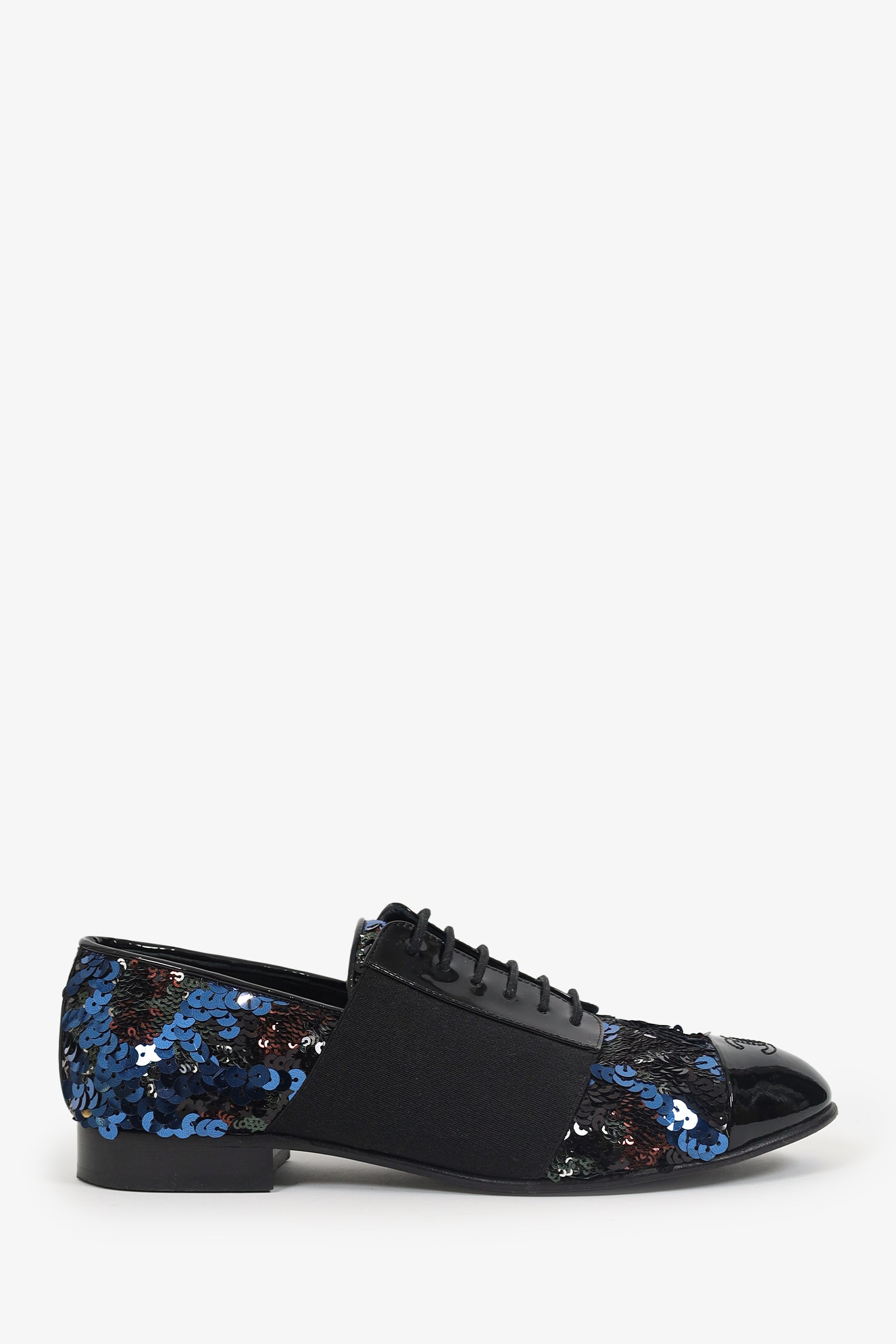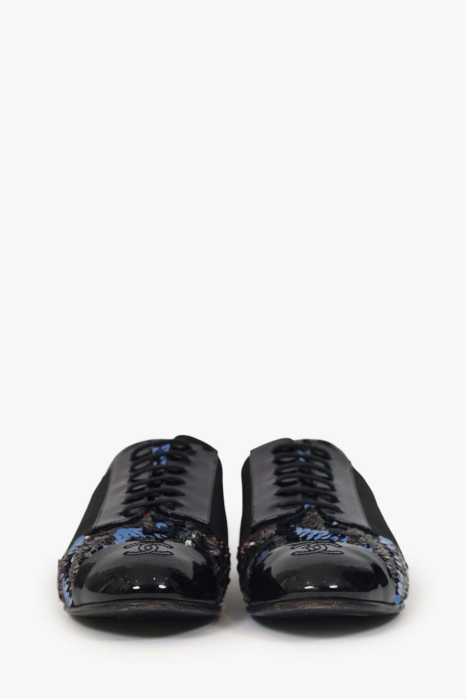 Refresh availabilityPre-Loved Chanel™ Patent Leather/Sequin Cap Toe Brogues. Slip-on. Round toe. Front lace-up closure. Block heel. Gold-tone hardware. Tonal stitching.