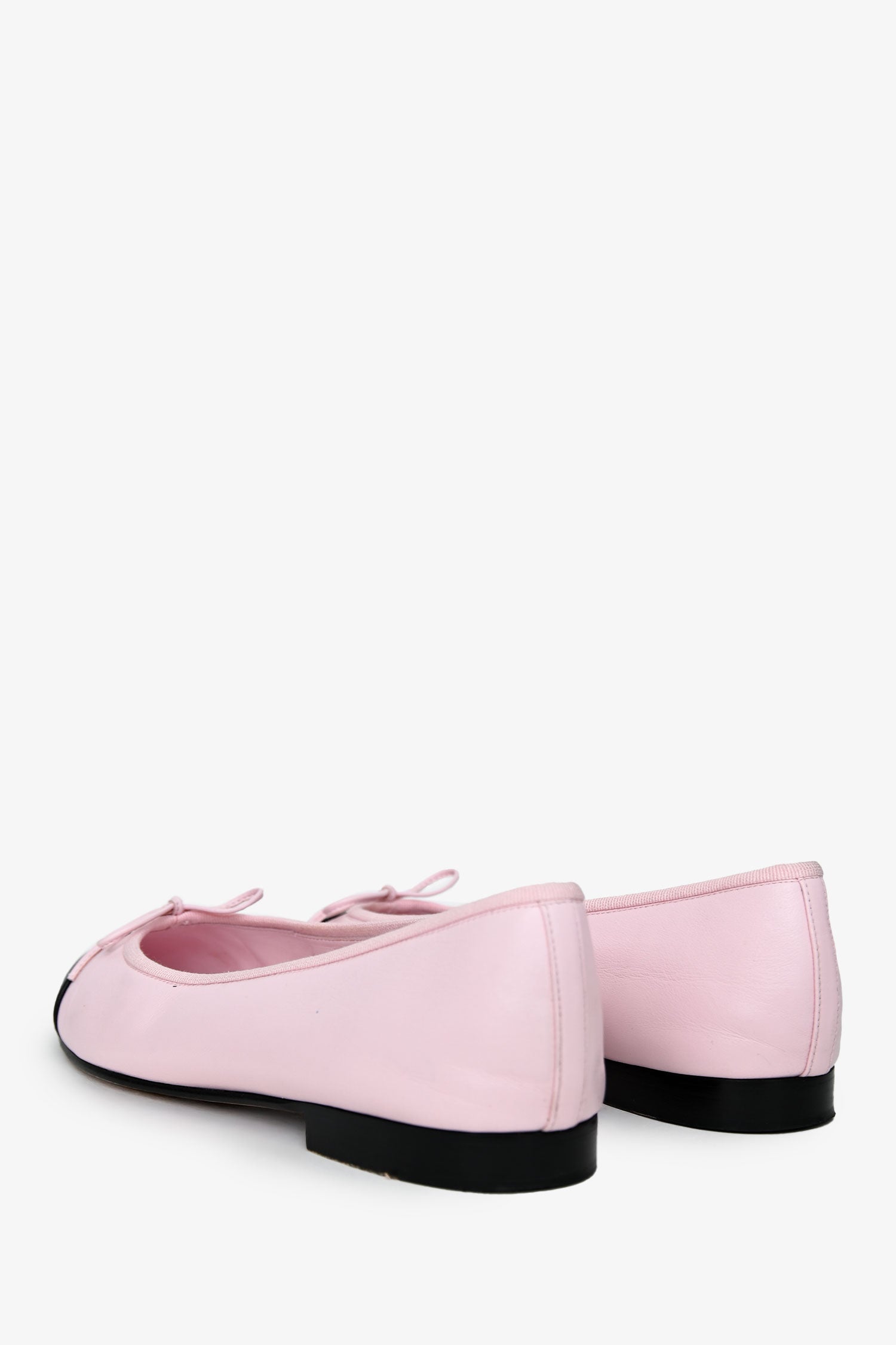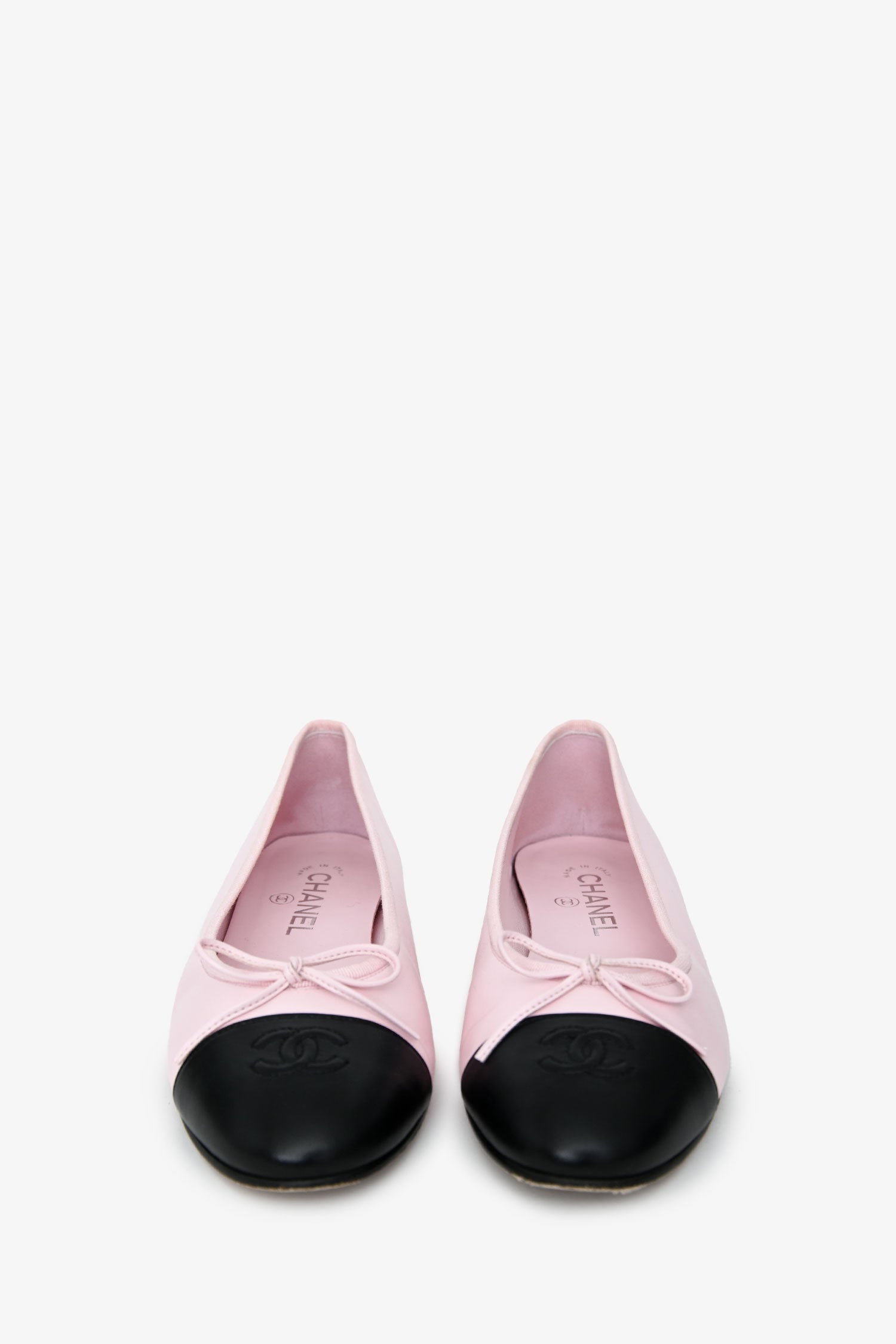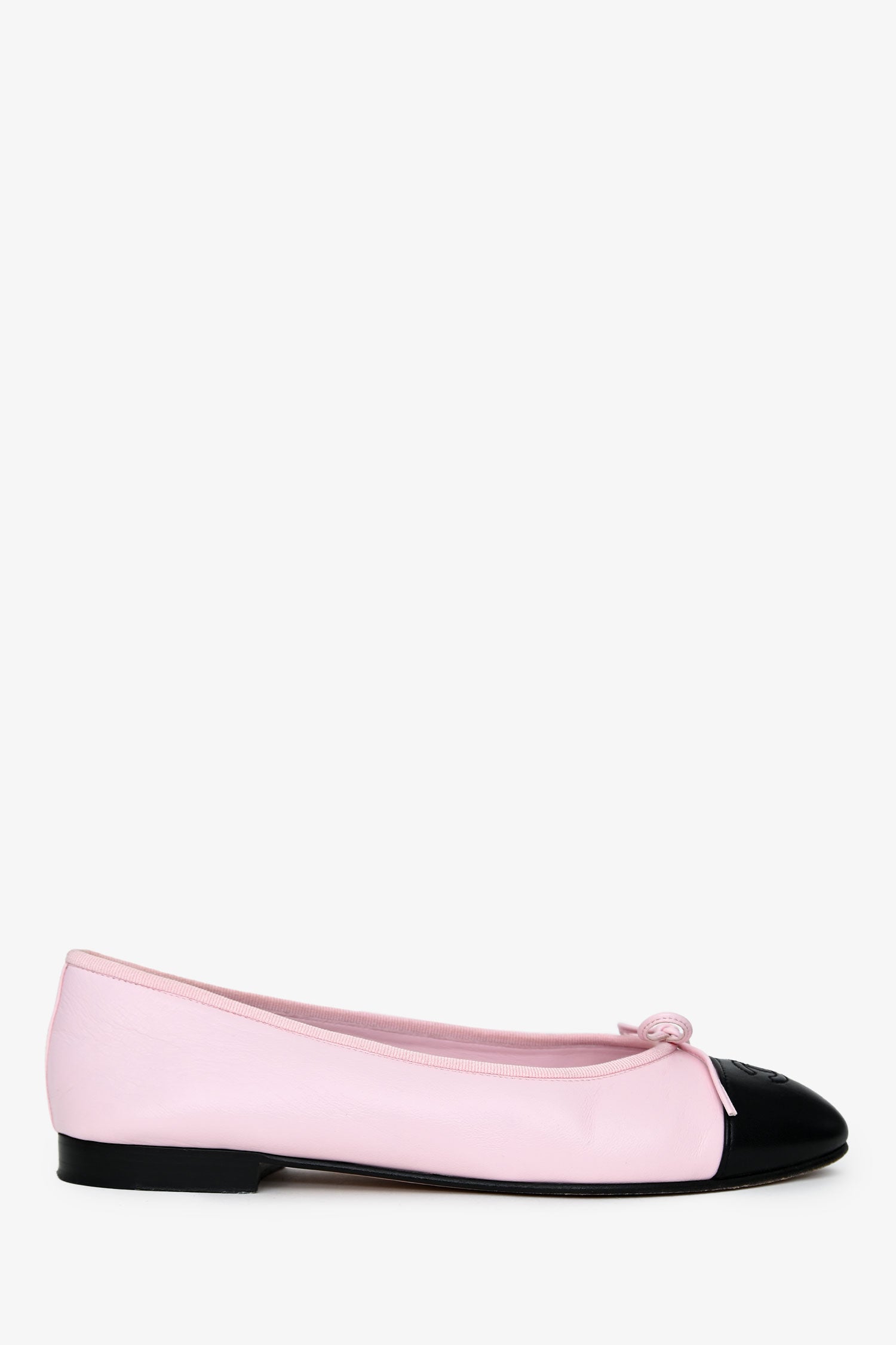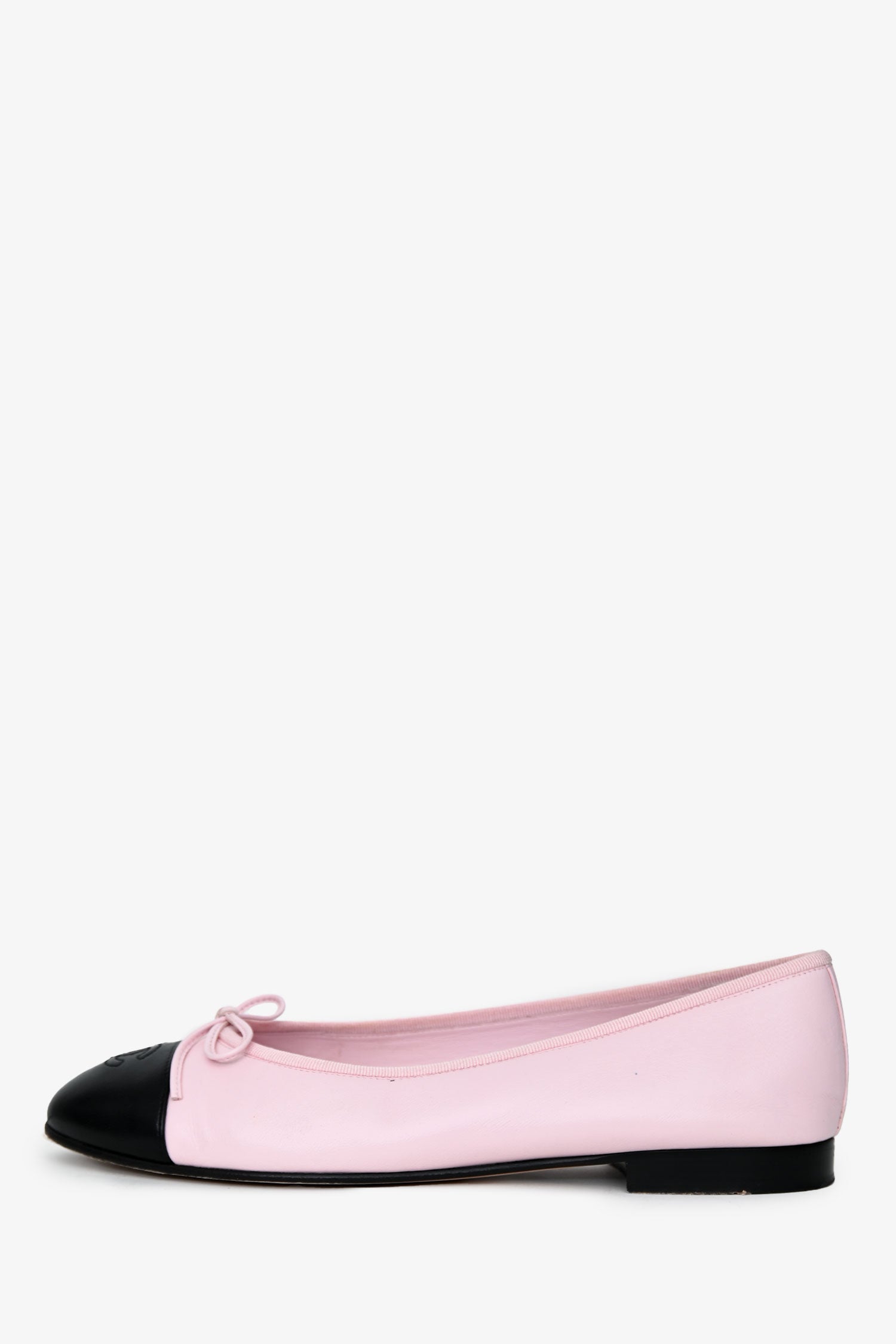 Refresh availabilityPre-Loved Chanel™ Pink Lambskin CC Cap Toe Flats. Slip-on. Round toe. Leather insoles. Tonal stitching.