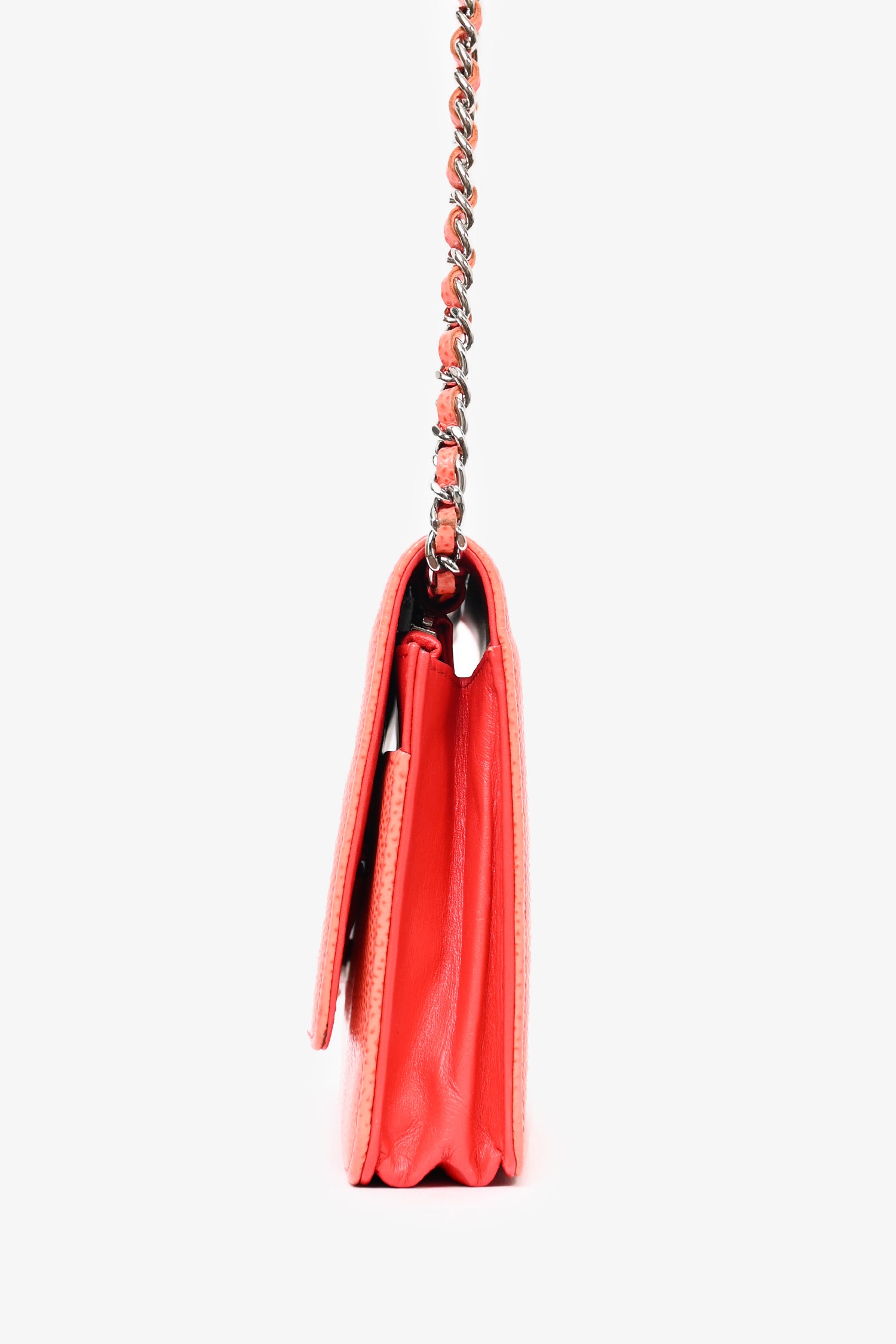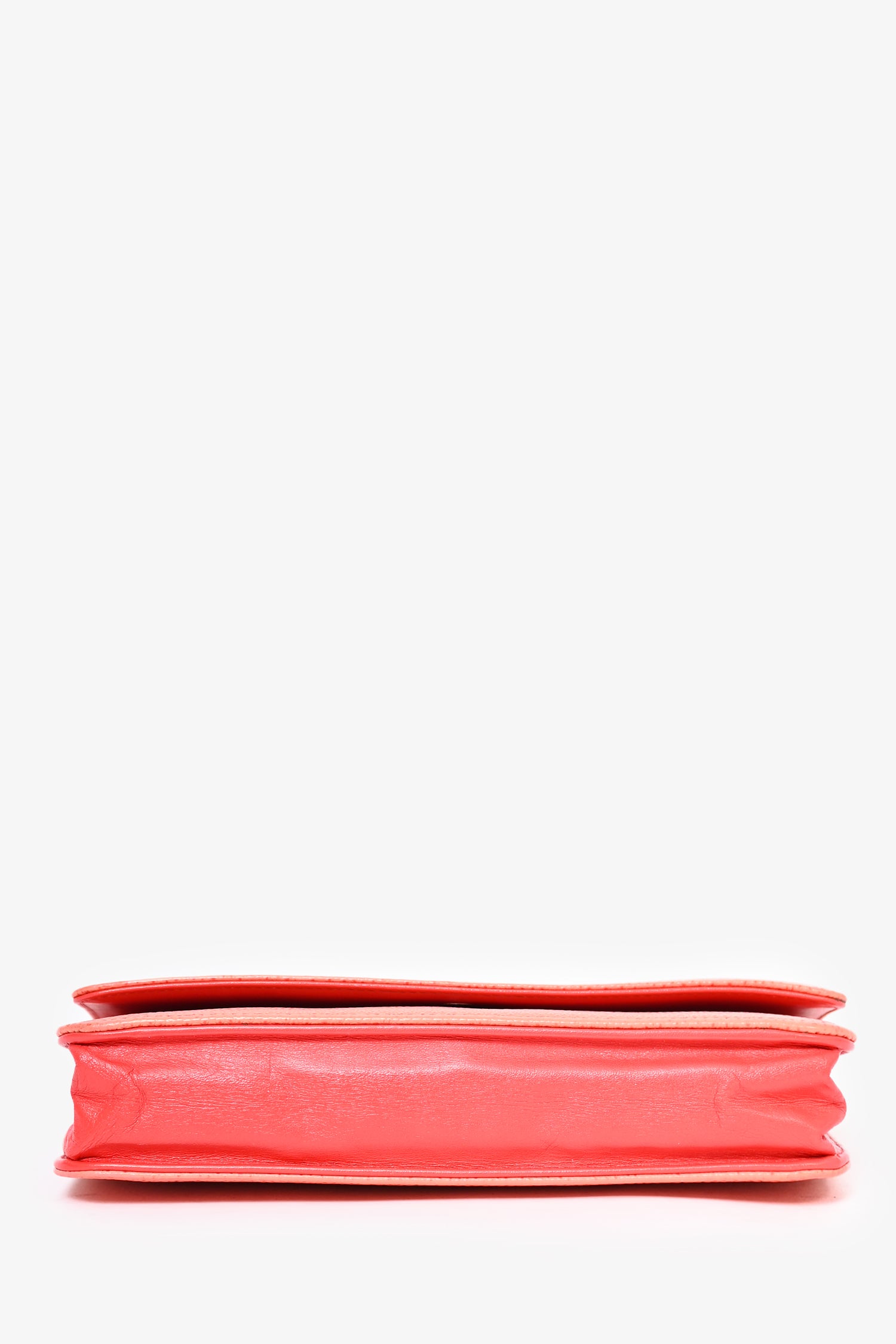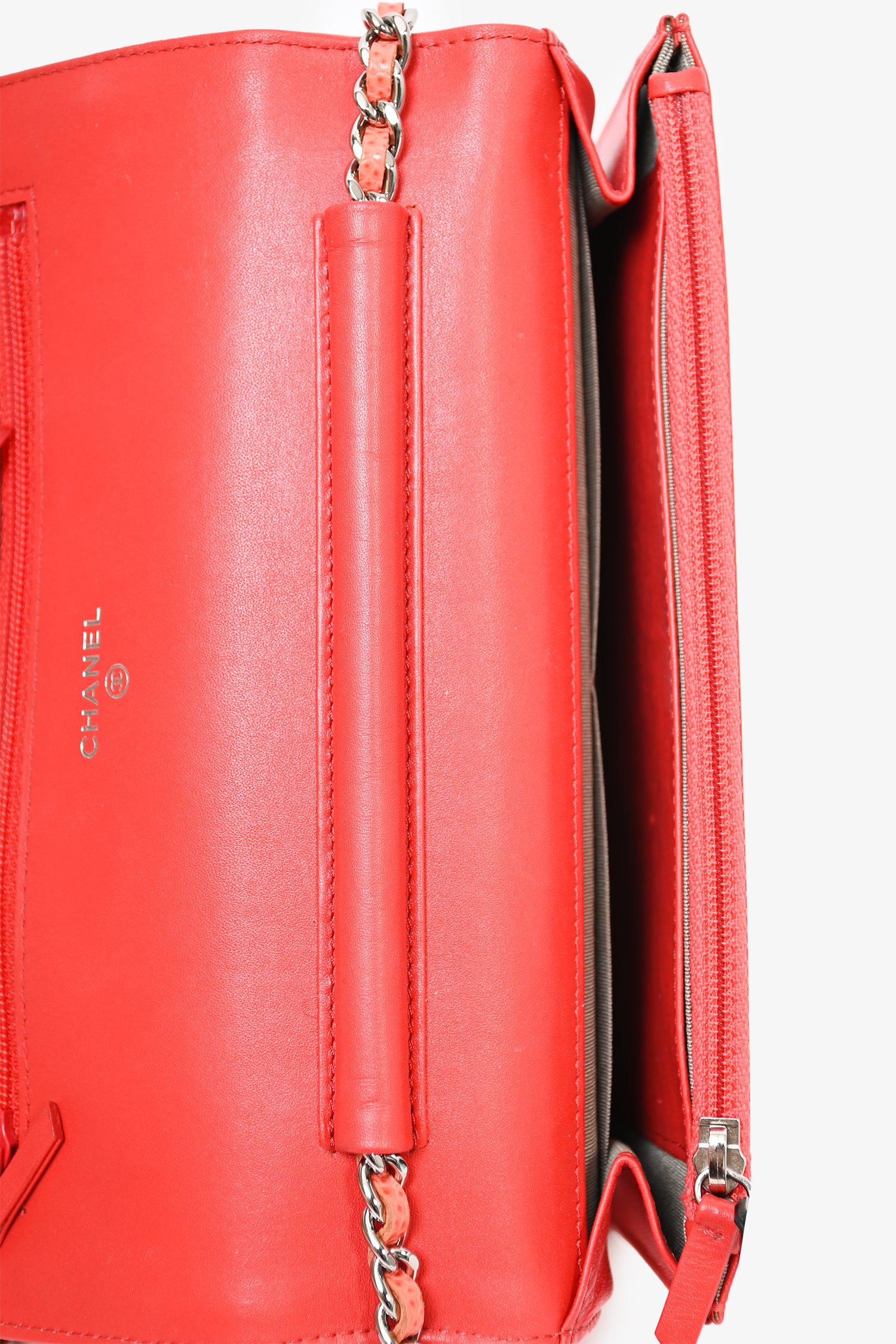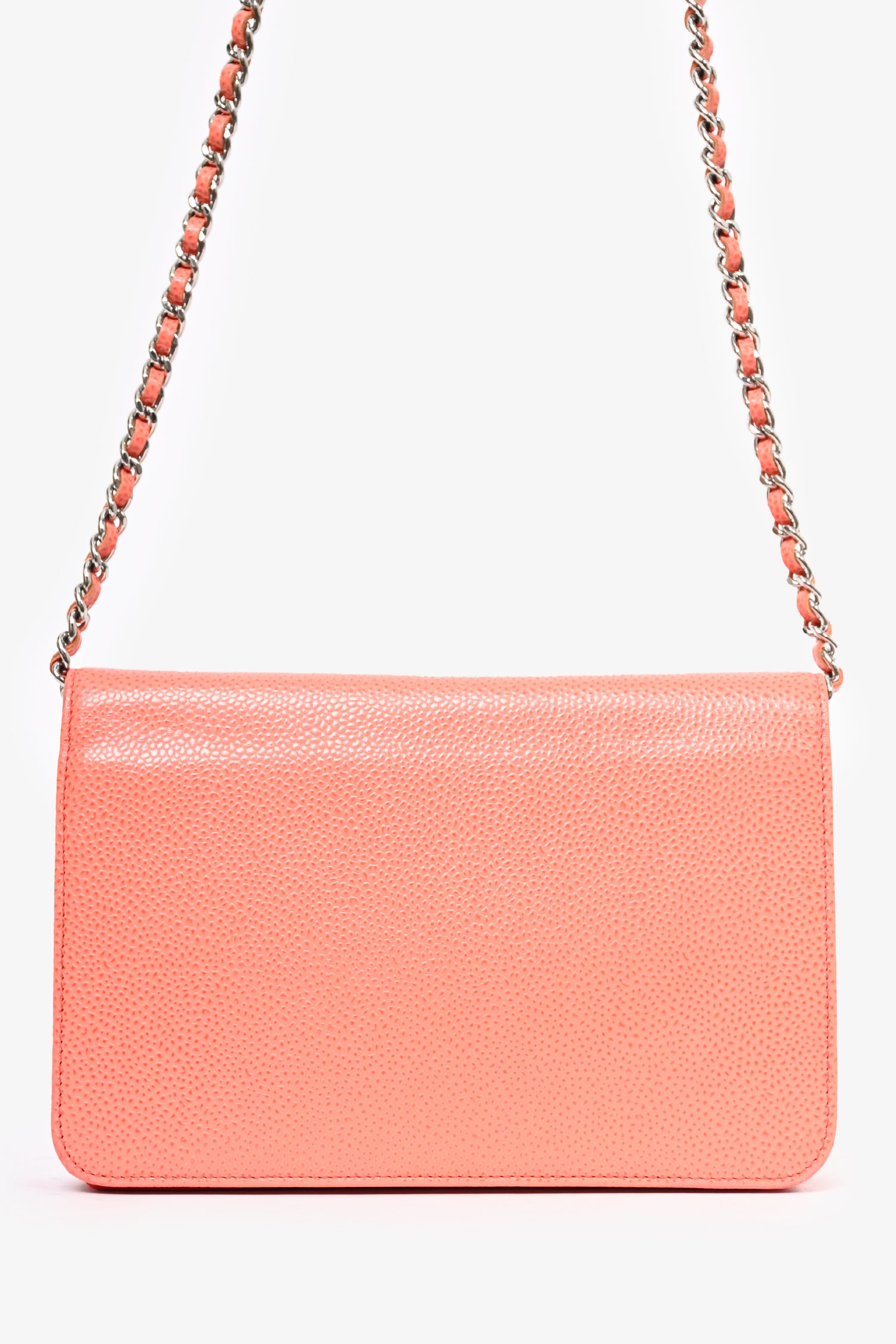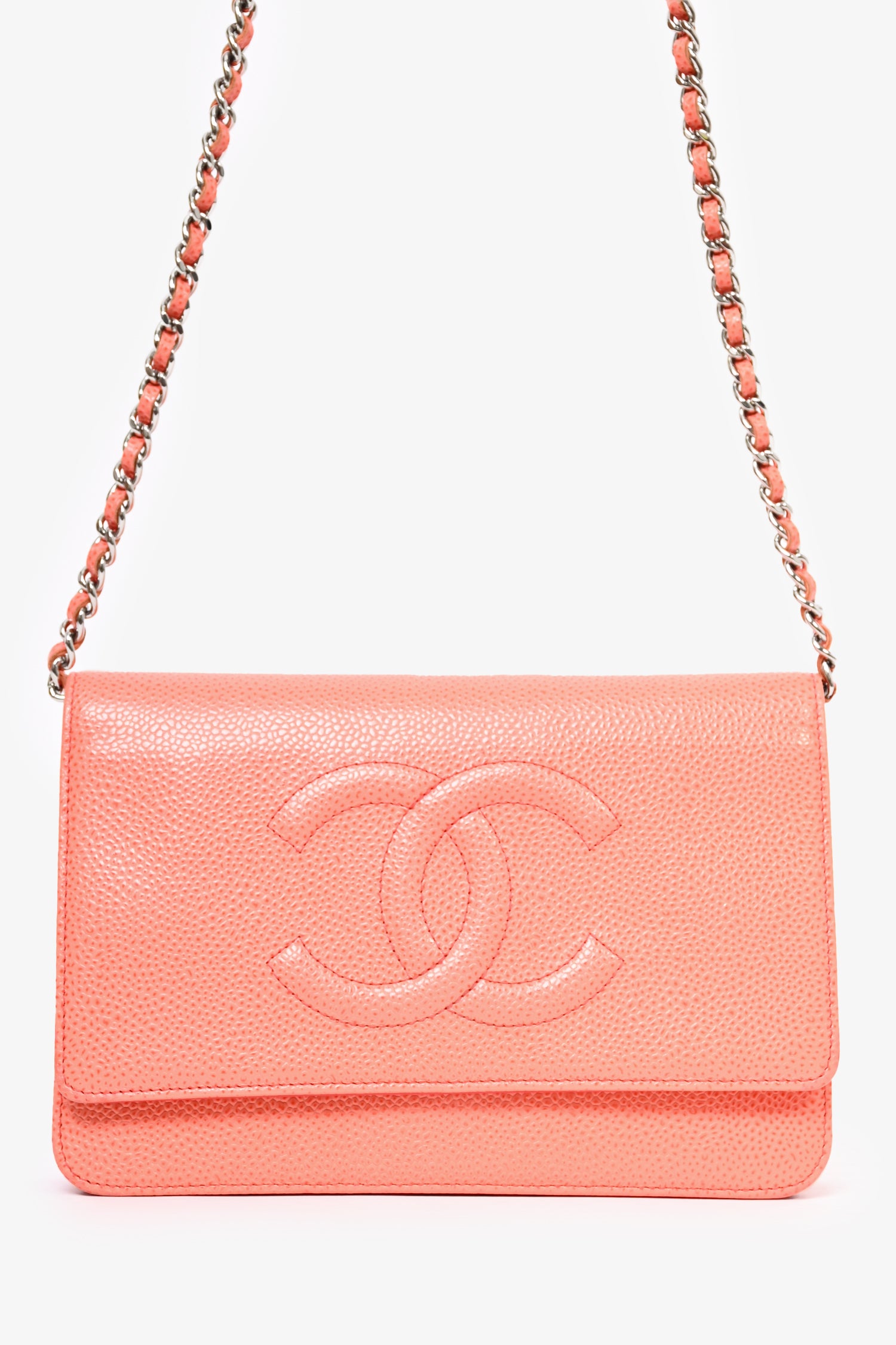Pre-Loved Chanel™ Pink Leather Timeless Wallet On Chain. Fold-over flap with concealed zipper. Silver-tone chain-link hardware with leather accents. Tonal stitching. Snap closure. Exterior compartment. 1 interior zipped compartment. 6 card holder slots.