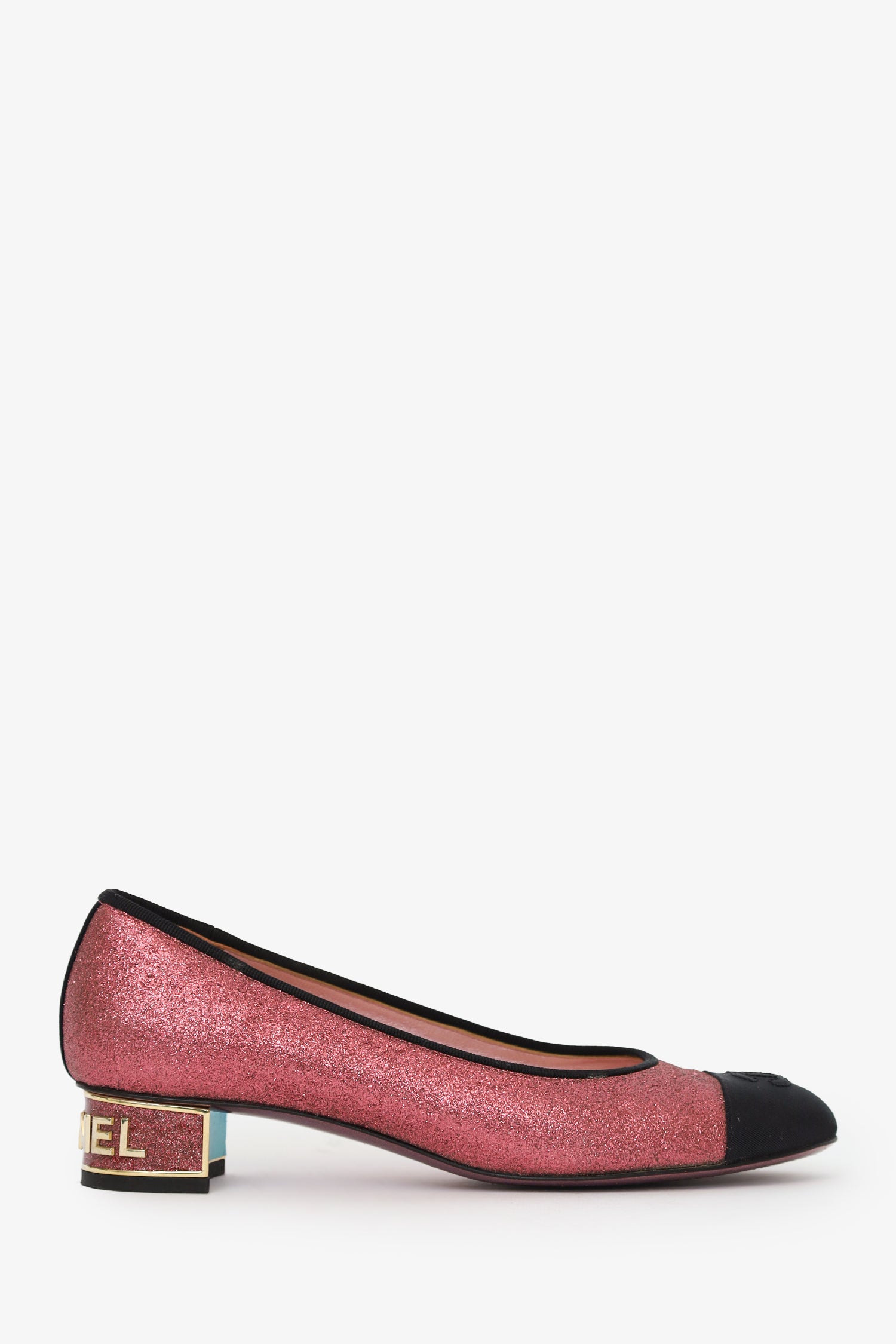 Refresh availabilityPre-Loved Chanel™ Pink/Black Glitter Leather CC Ballerina Pumps. Round toe. Gold-tone hardware. Tonal stitching.