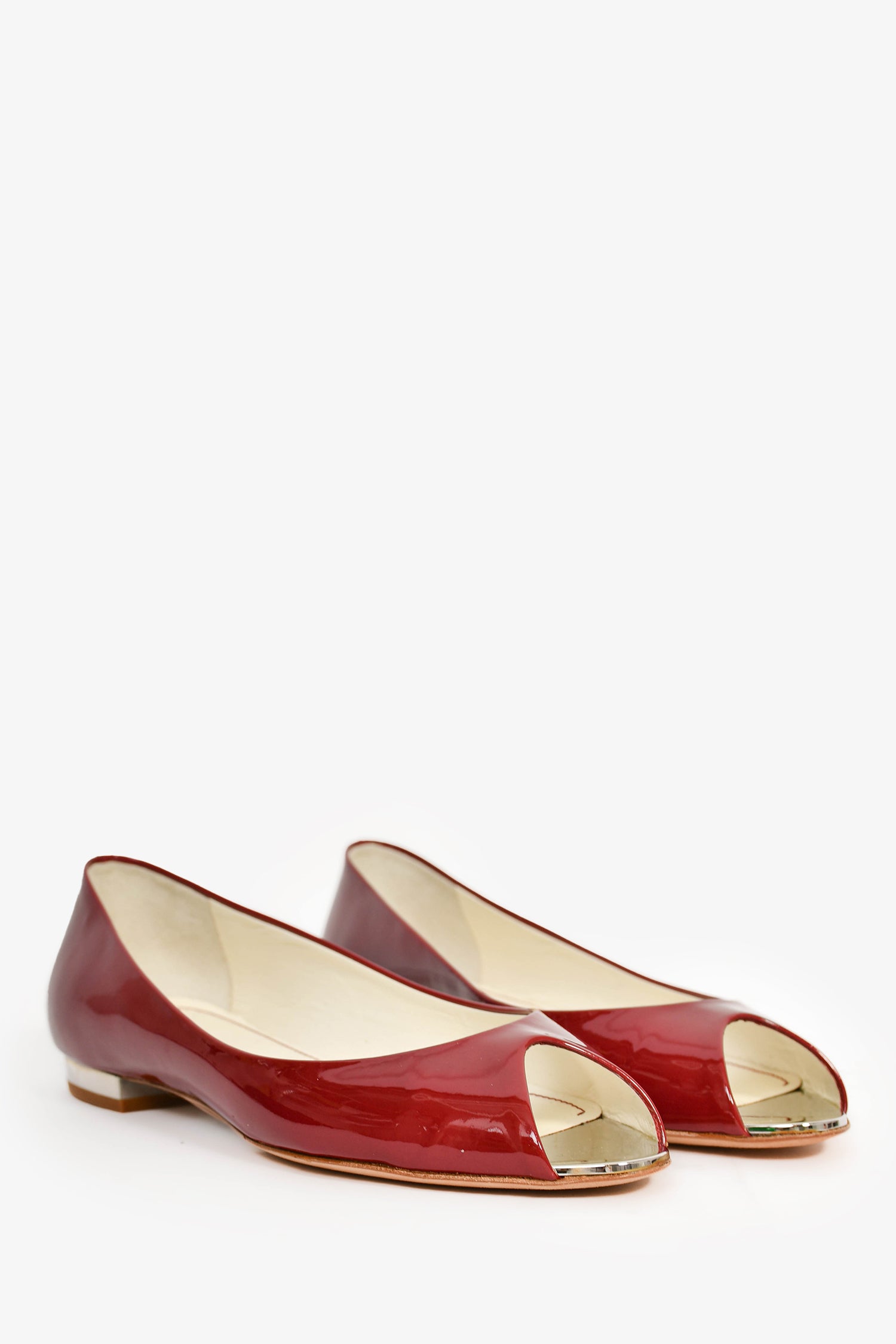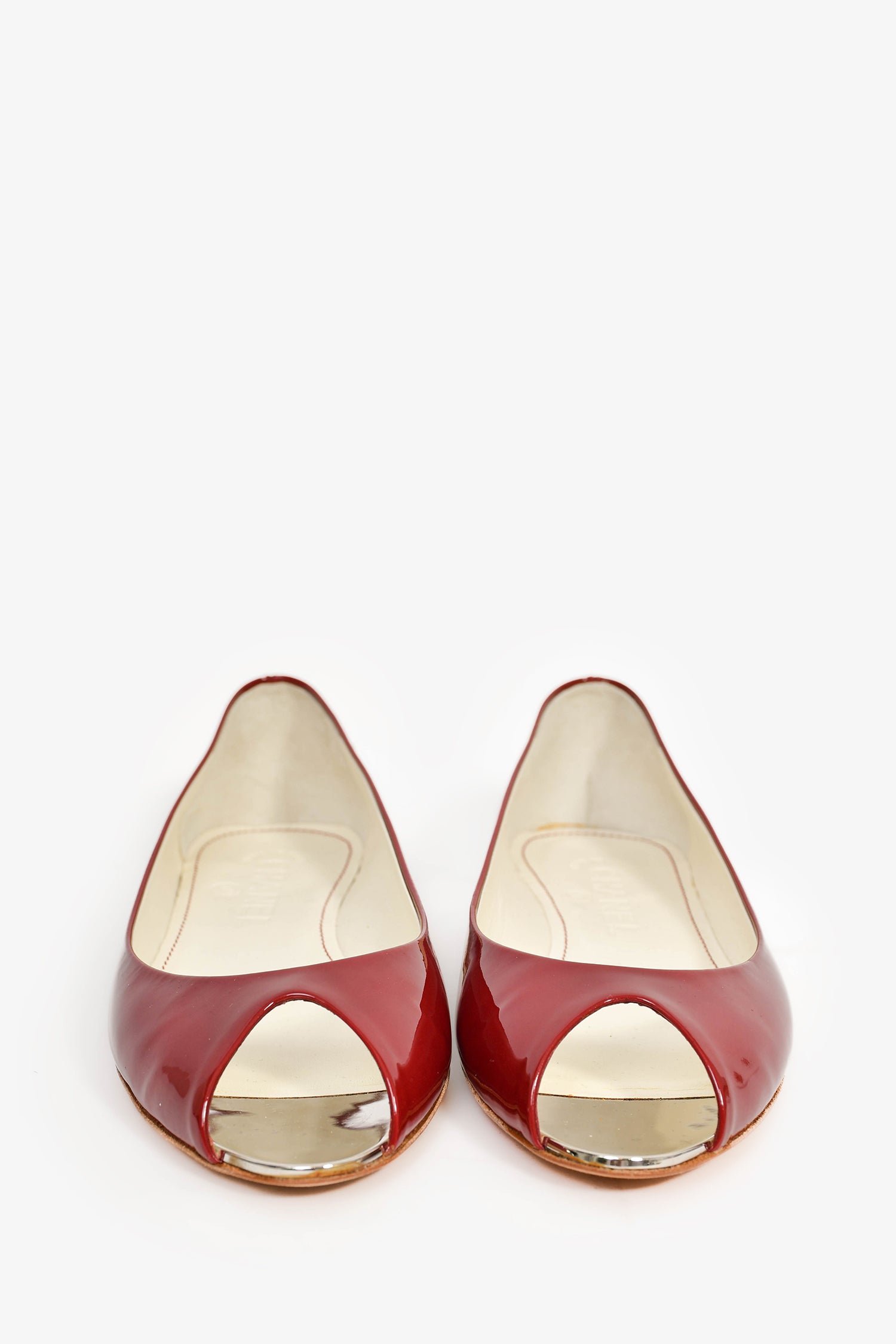 Refresh availabilityPre-Loved Chanel™ Red Patent Leather Peep Toe Flats. Round, open toe. Leather insoles. Patent exterior. Gold-tone metallic plate on the toe front and heel. Tonal stitching.