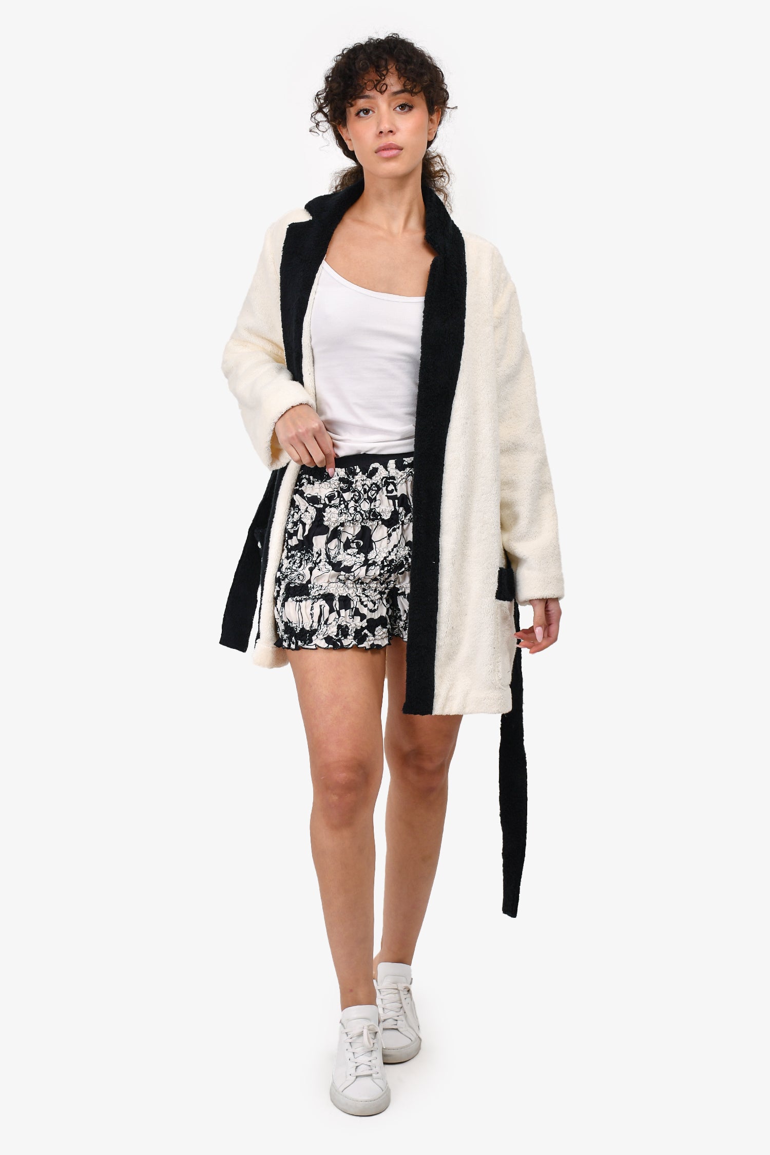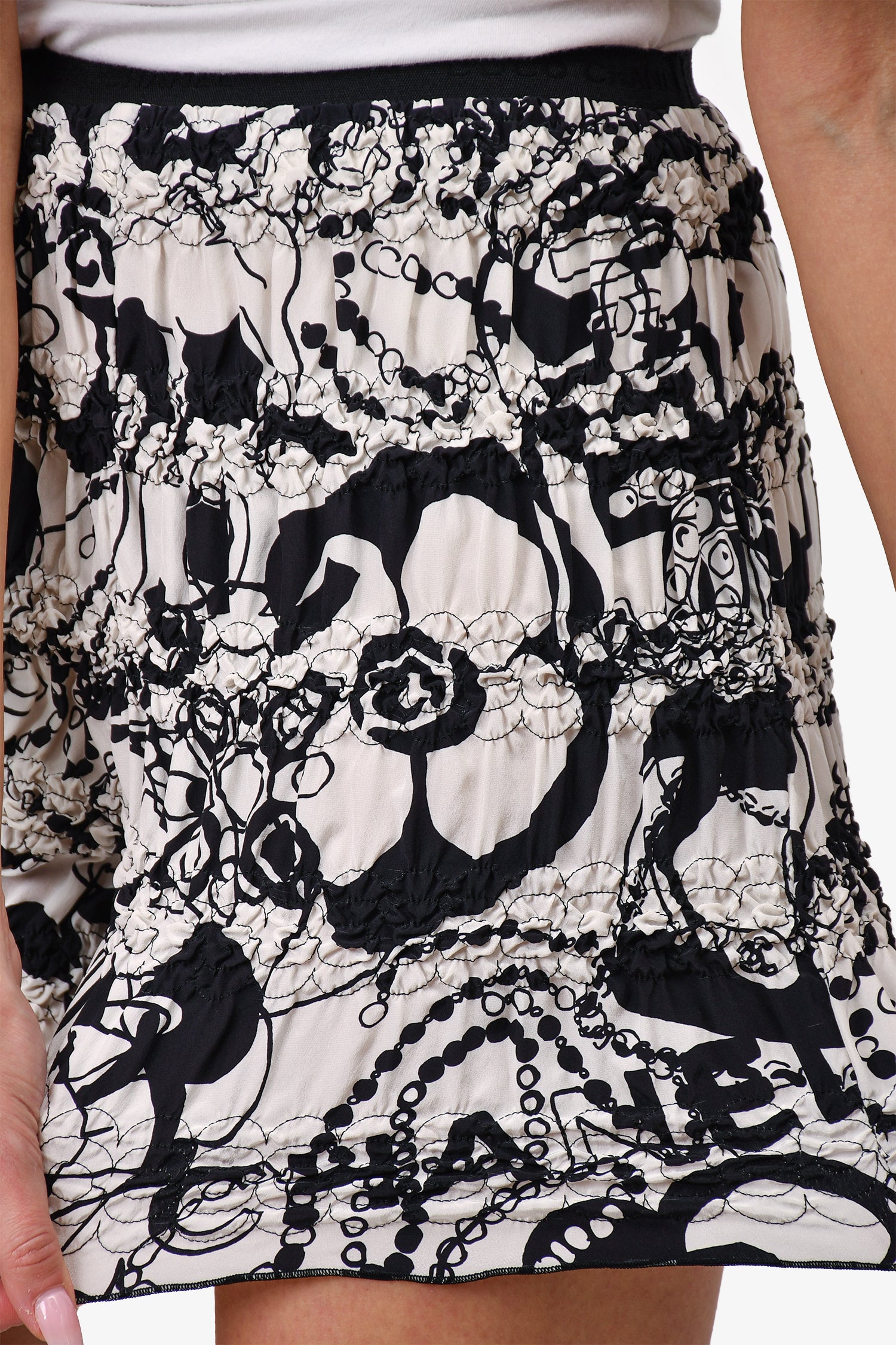 Refresh availabilityPre-Loved Chanel™ Resort 2022 White/Black Printed Ruched Silk Mini Bloomer Shorts. Elasticated belt. Ruched tiers. Tonal and contrast stitching.