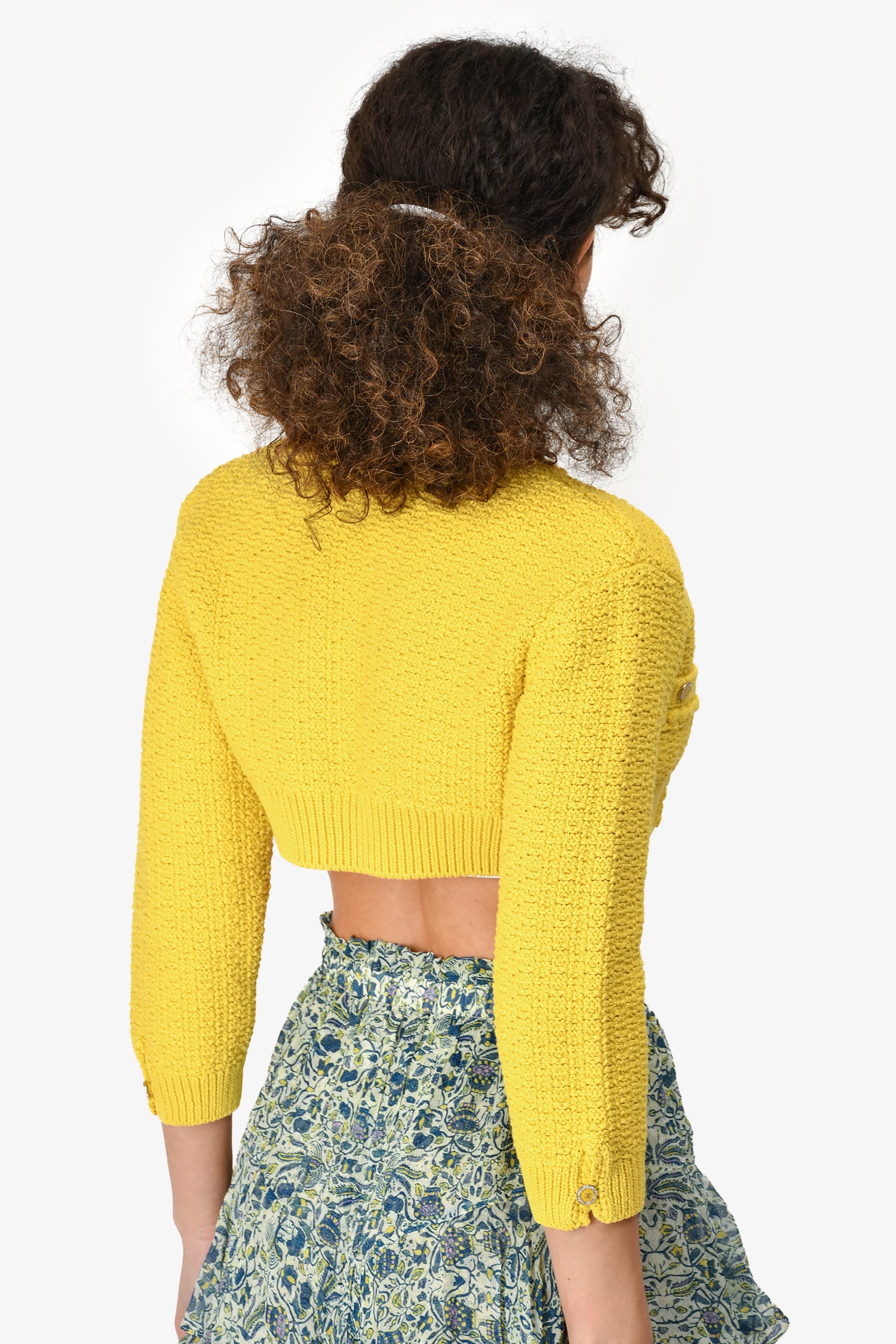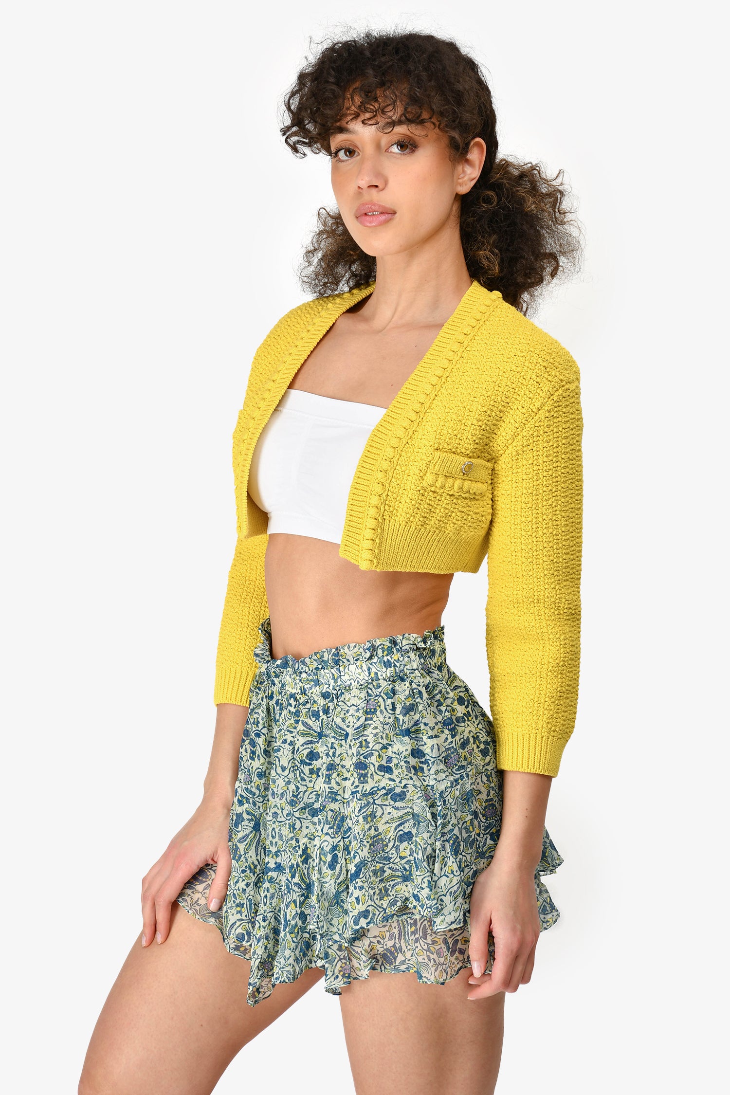 Refresh availabilityPre-Loved Chanel™ Short Sleeve 2020 Yellow Cotton Blend Knit Cropped Cardigan. Open front design. Two front faux pockets. Ribbed neckline and cuffs. Button closure on the cuffs. Tonal stitching.