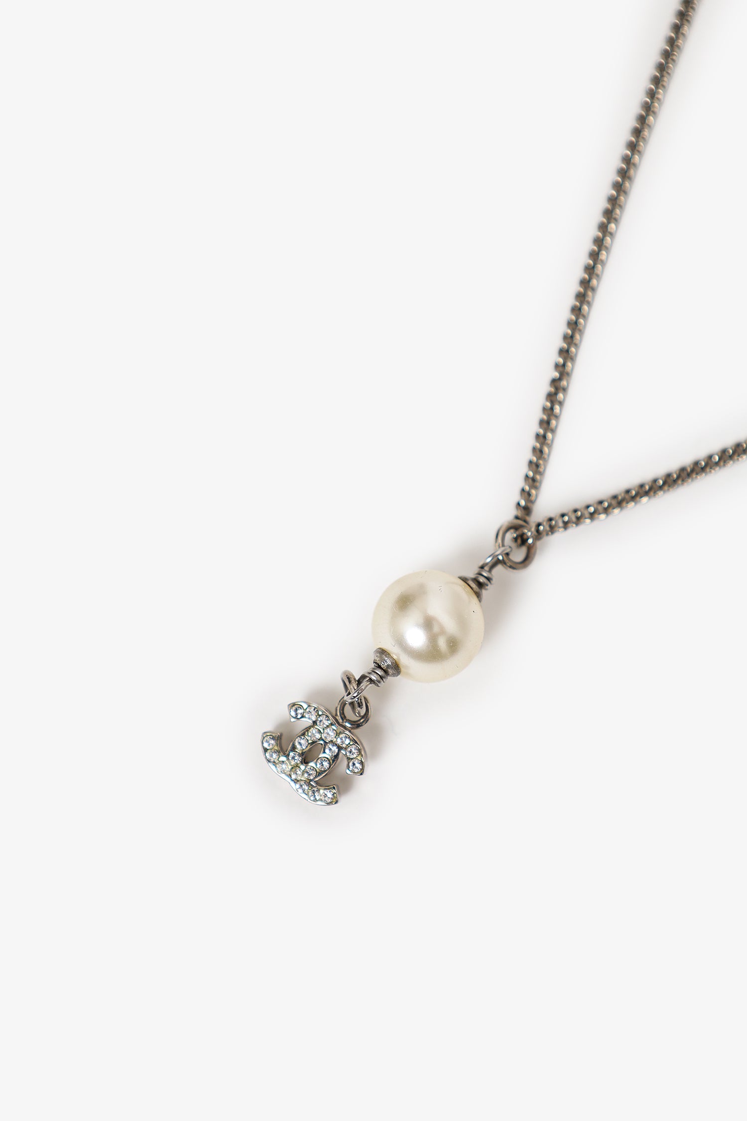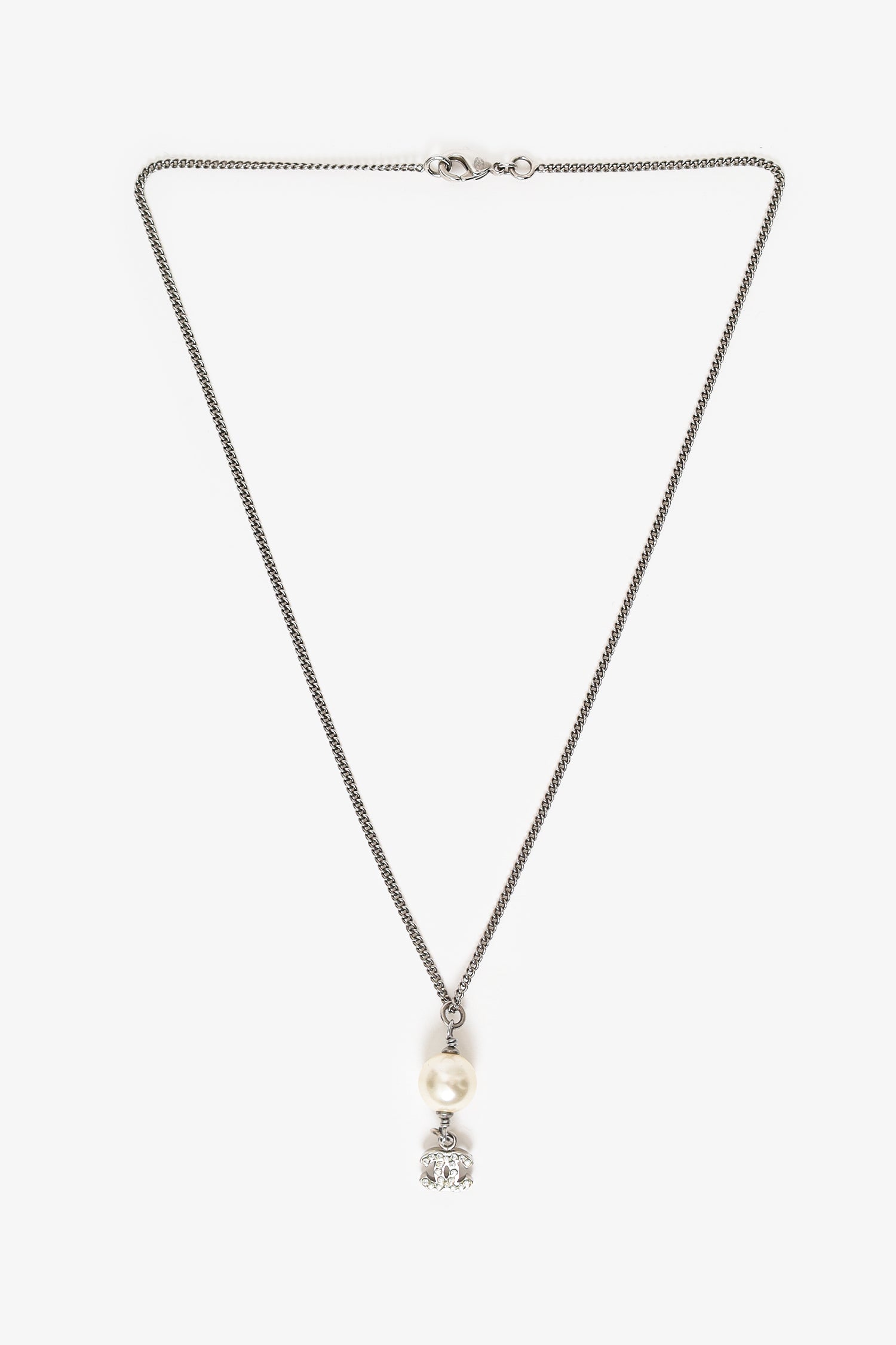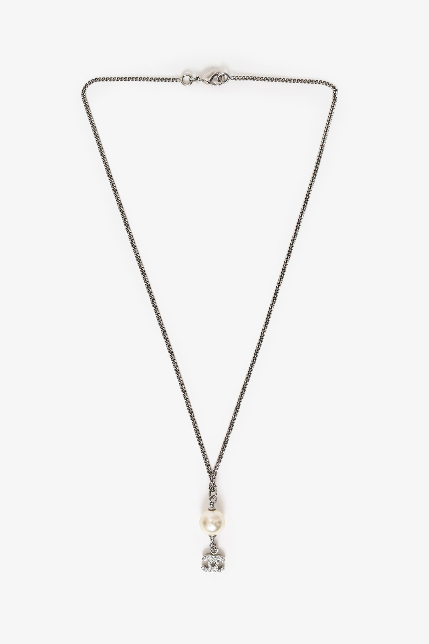 Refresh availabilityPre-Loved Chanel™ Silver Tone Faux Pearl CC Drop Pendant Necklace. Lobster clasp closure.